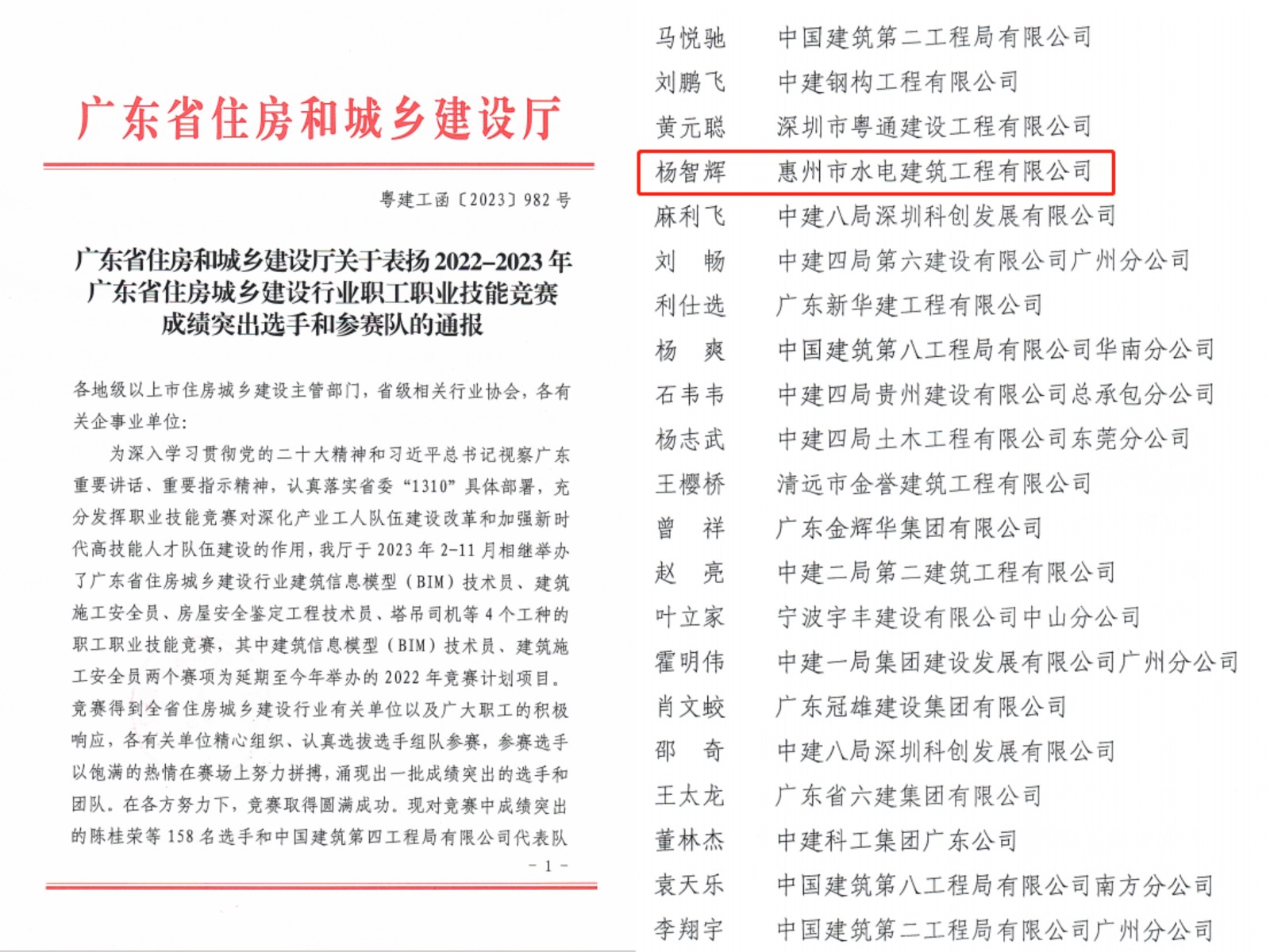 12月27日,廣東省住房和城鄉(xiāng)建設(shè)廳發(fā)布“關(guān)于表揚(yáng)2022- 2023年廣東省住房城鄉(xiāng)建設(shè)行業(yè)職工職業(yè)技能競賽成績突出選手和參賽隊(duì)的通報(bào)”,我司楊智輝同志代表市住建局參賽,榮獲“建筑施工安全員個人優(yōu)勝獎”。......