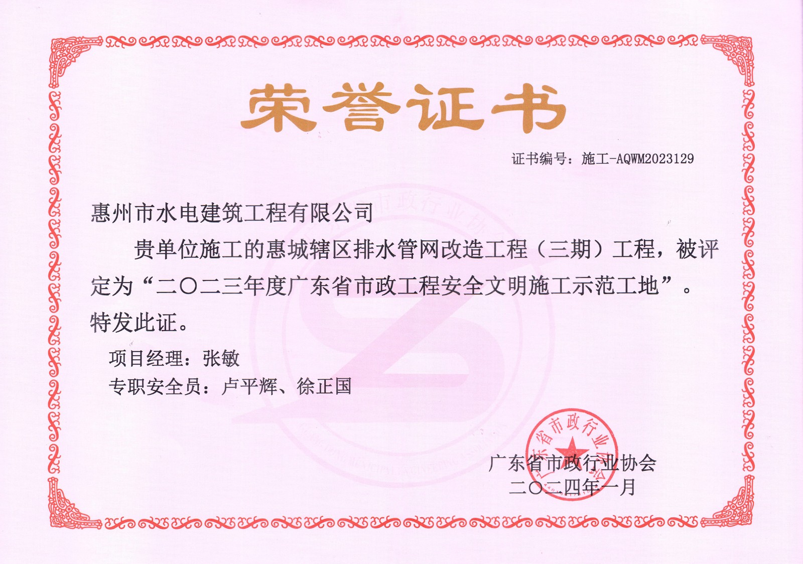 近日,我司收到廣東省市政行業(yè)協(xié)會發(fā)來的榮譽(yù)證書,承建的惠城轄區(qū)排水管網(wǎng)改造工程(三期)工程榮獲“2023年度廣東省市政工程安全文明施工示范工地”。這是繼惠州市白花河防洪排澇治理工程項(xiàng)目之后,公司在2023年度獲得的又一項(xiàng)省級安全文明工地獎項(xiàng),為公司年度創(chuàng)優(yōu)工作劃上…......