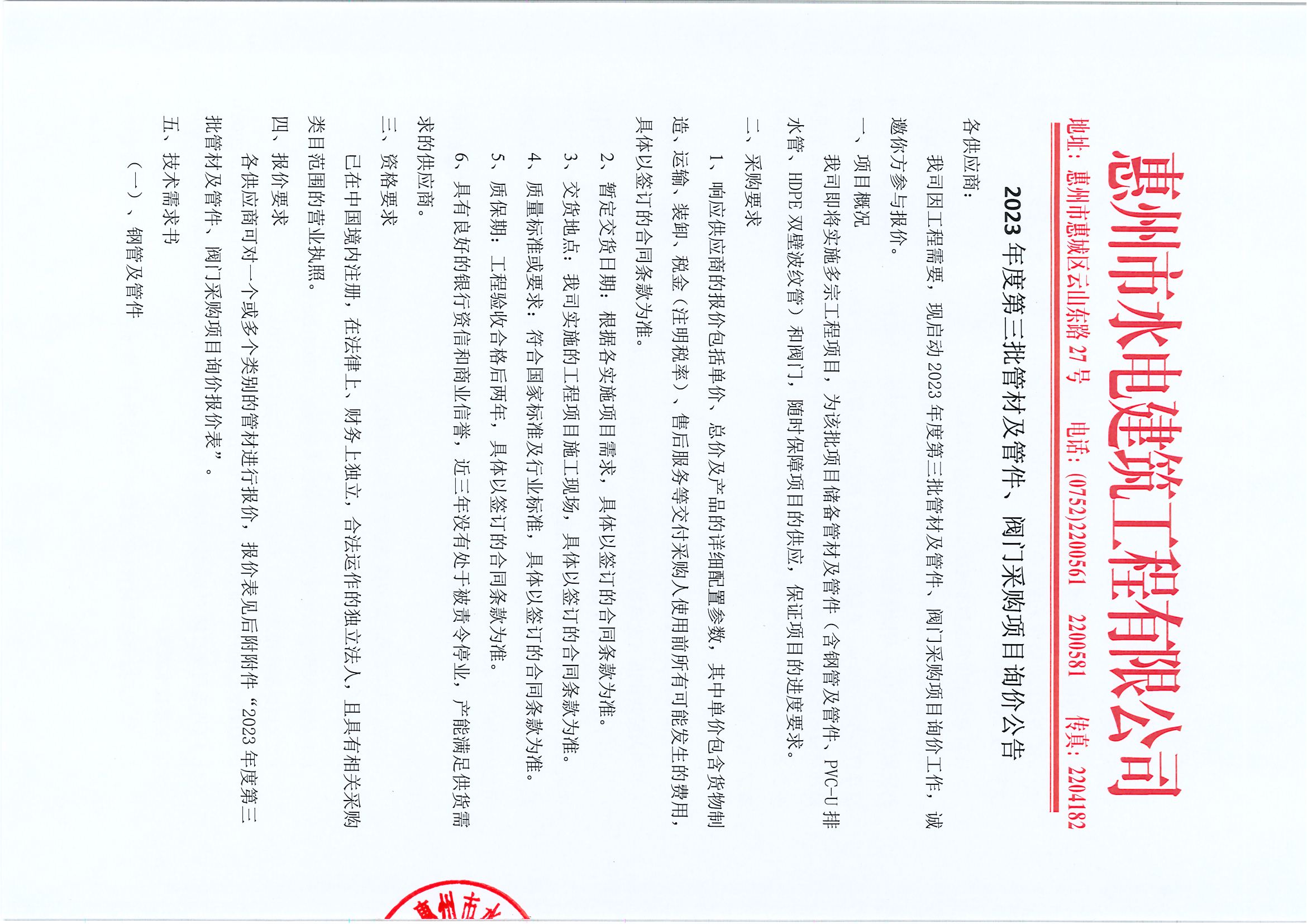 2023年度第三批管材及管件、閥門采購(gòu)項(xiàng)目詢價(jià)公告