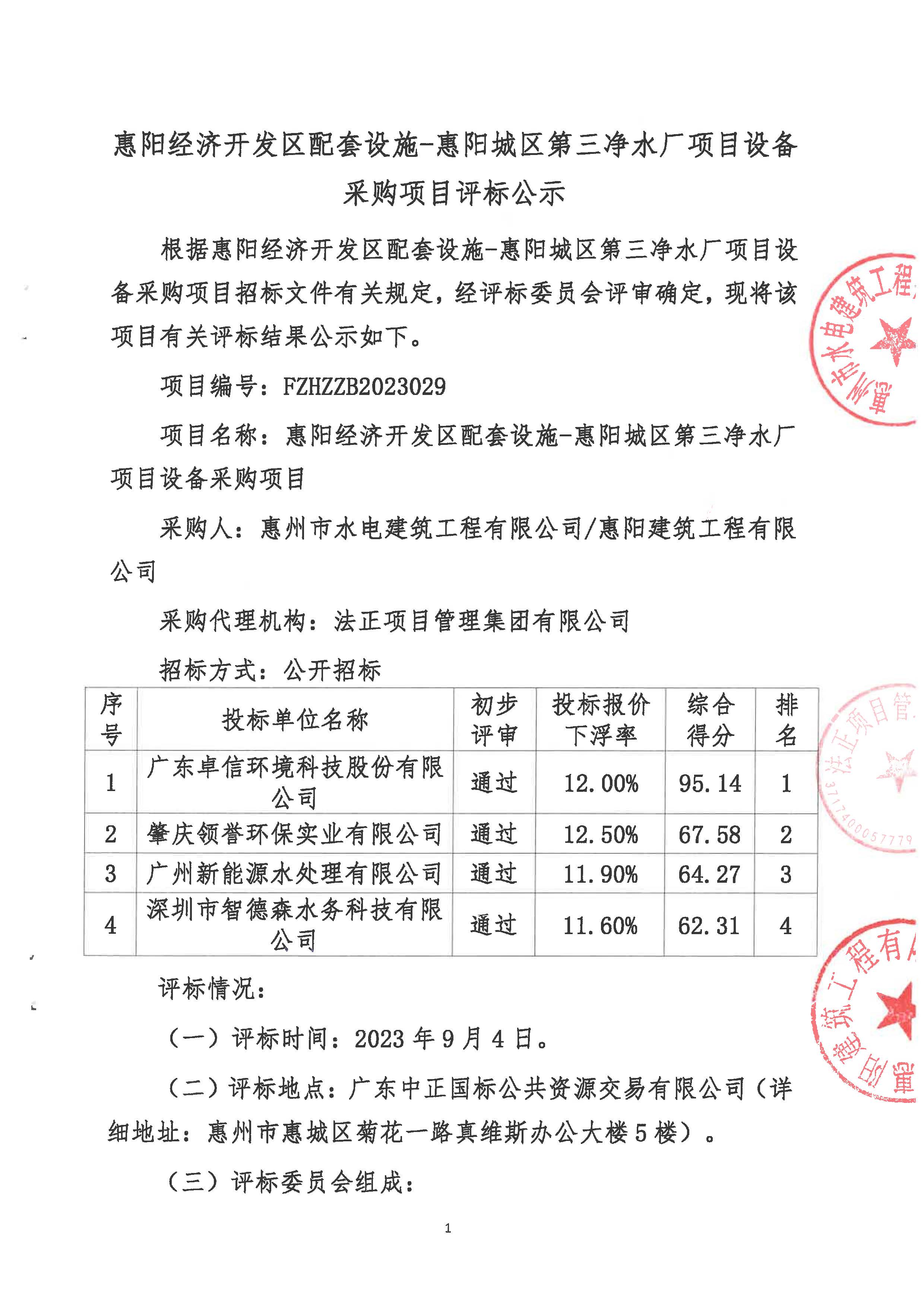 惠陽(yáng)經(jīng)濟(jì)開(kāi)發(fā)區(qū)配套設(shè)施——惠陽(yáng)城區(qū)第三凈水廠項(xiàng)目設(shè)備采購(gòu)項(xiàng)目評(píng)標(biāo)公示
