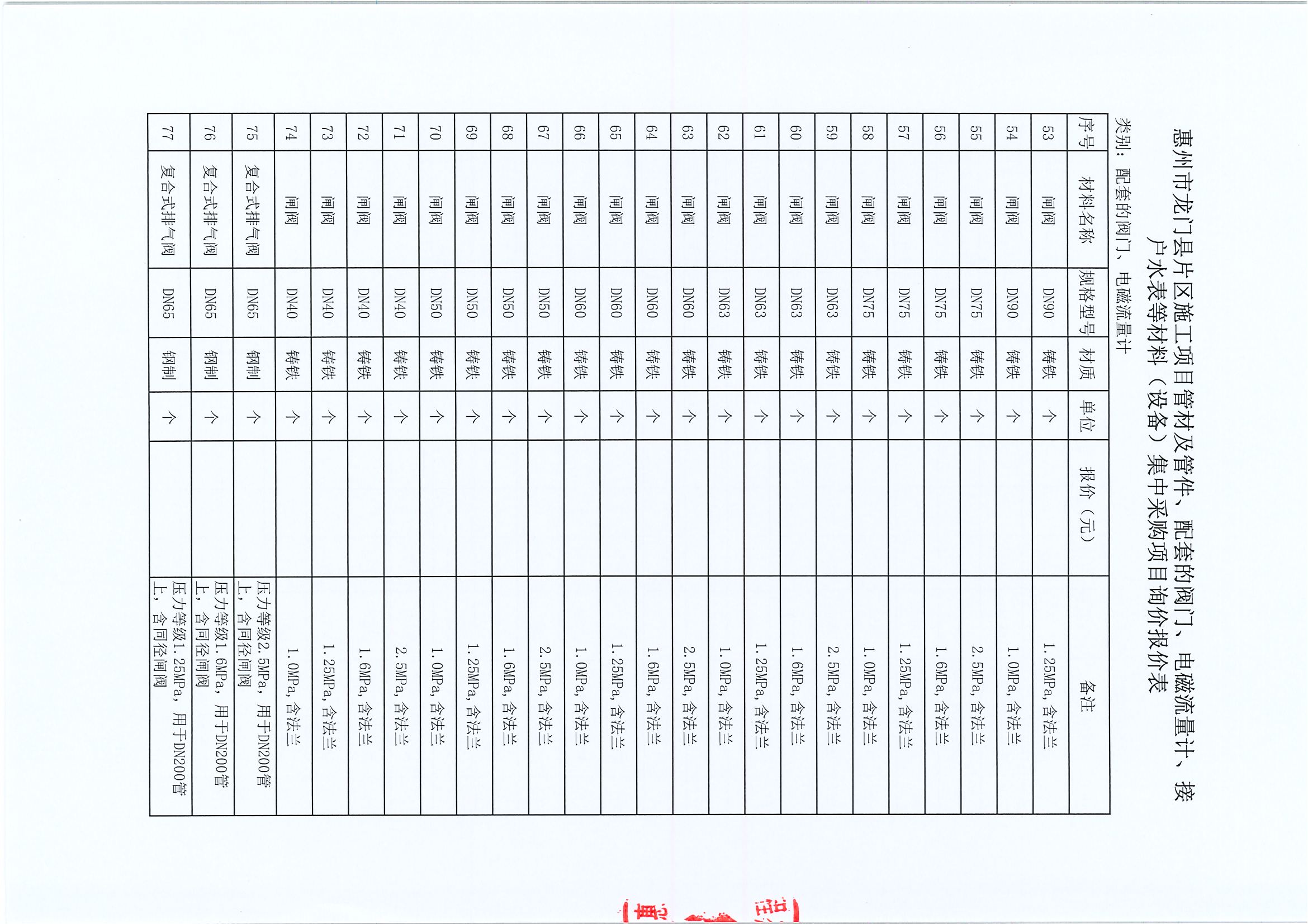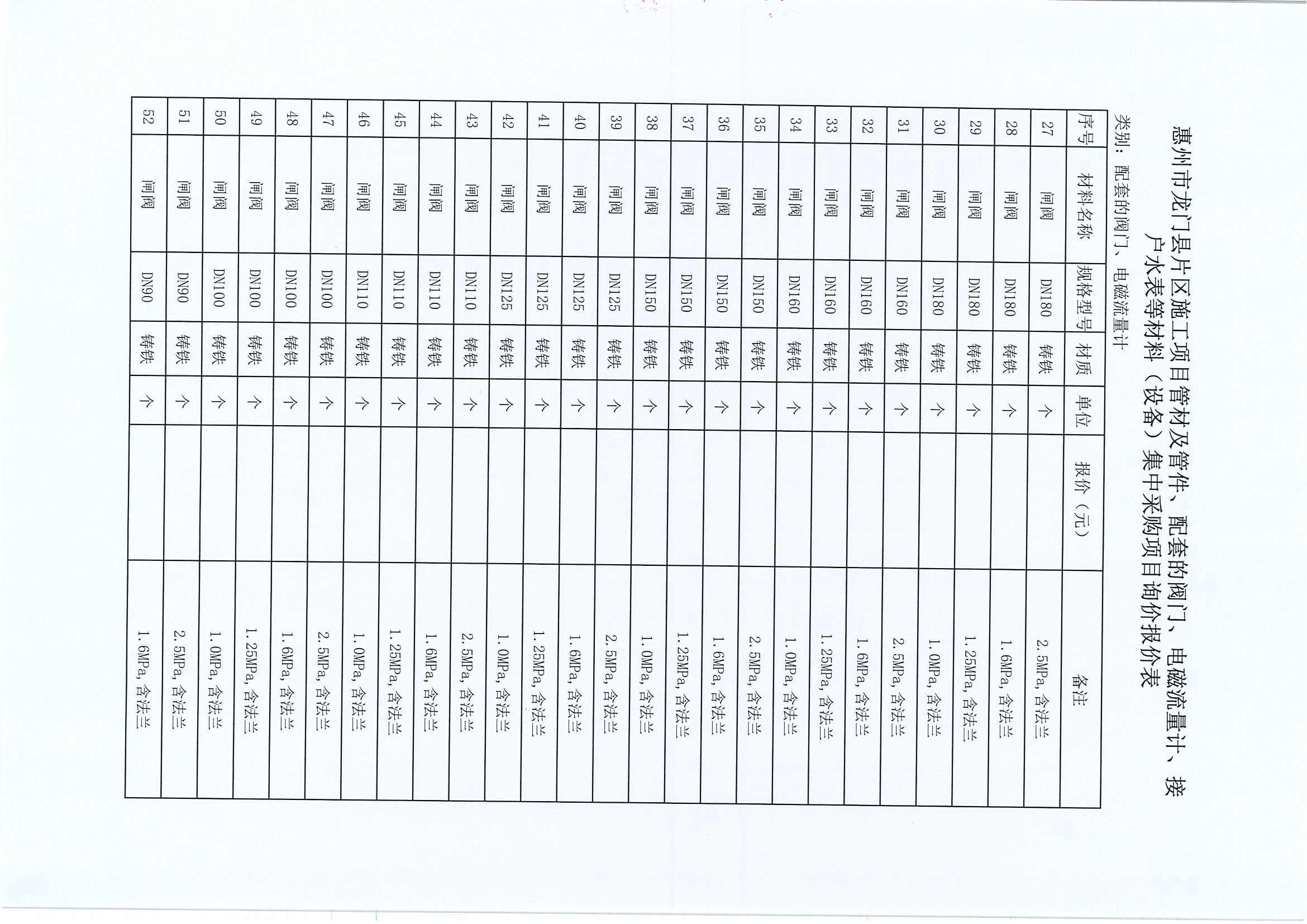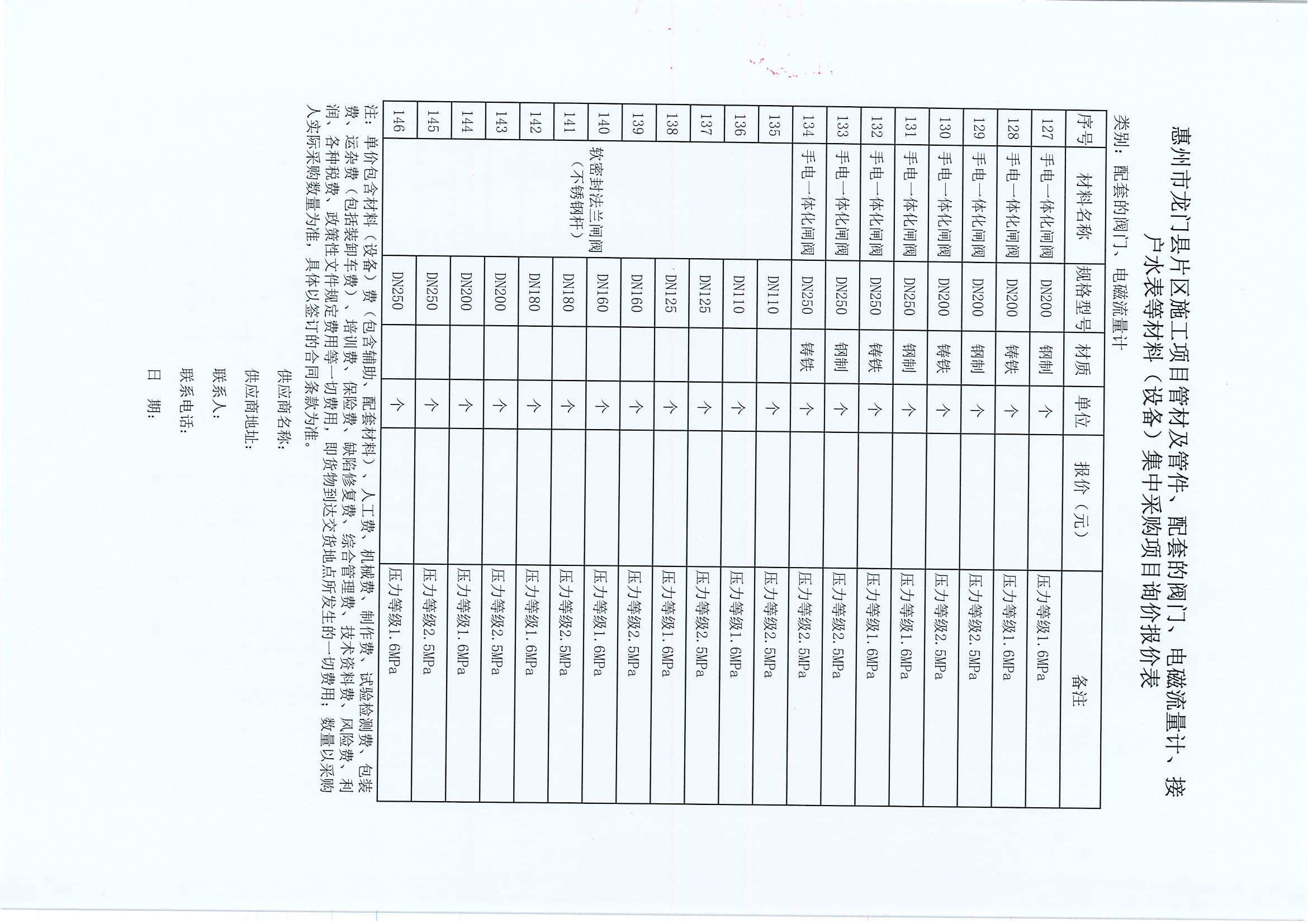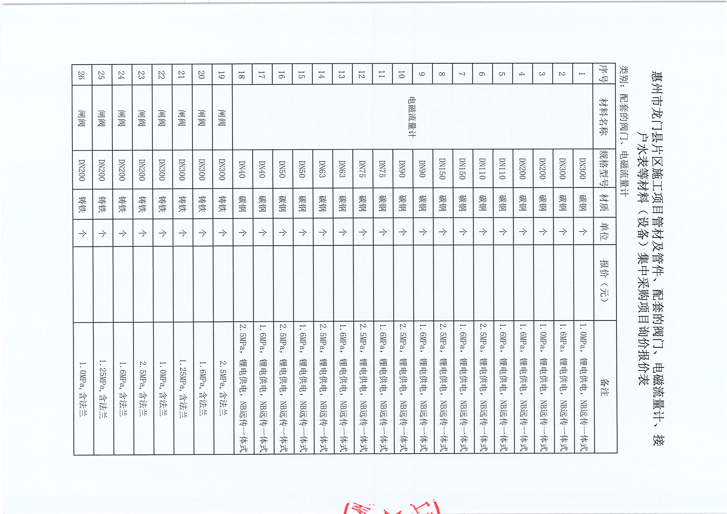 惠州市龍門縣片區(qū)施工項(xiàng)目管材及管件、配套的閥門、電磁流量計(jì)、接戶水表等材料(設(shè)備)集中采購項(xiàng)目詢價(jià)公告