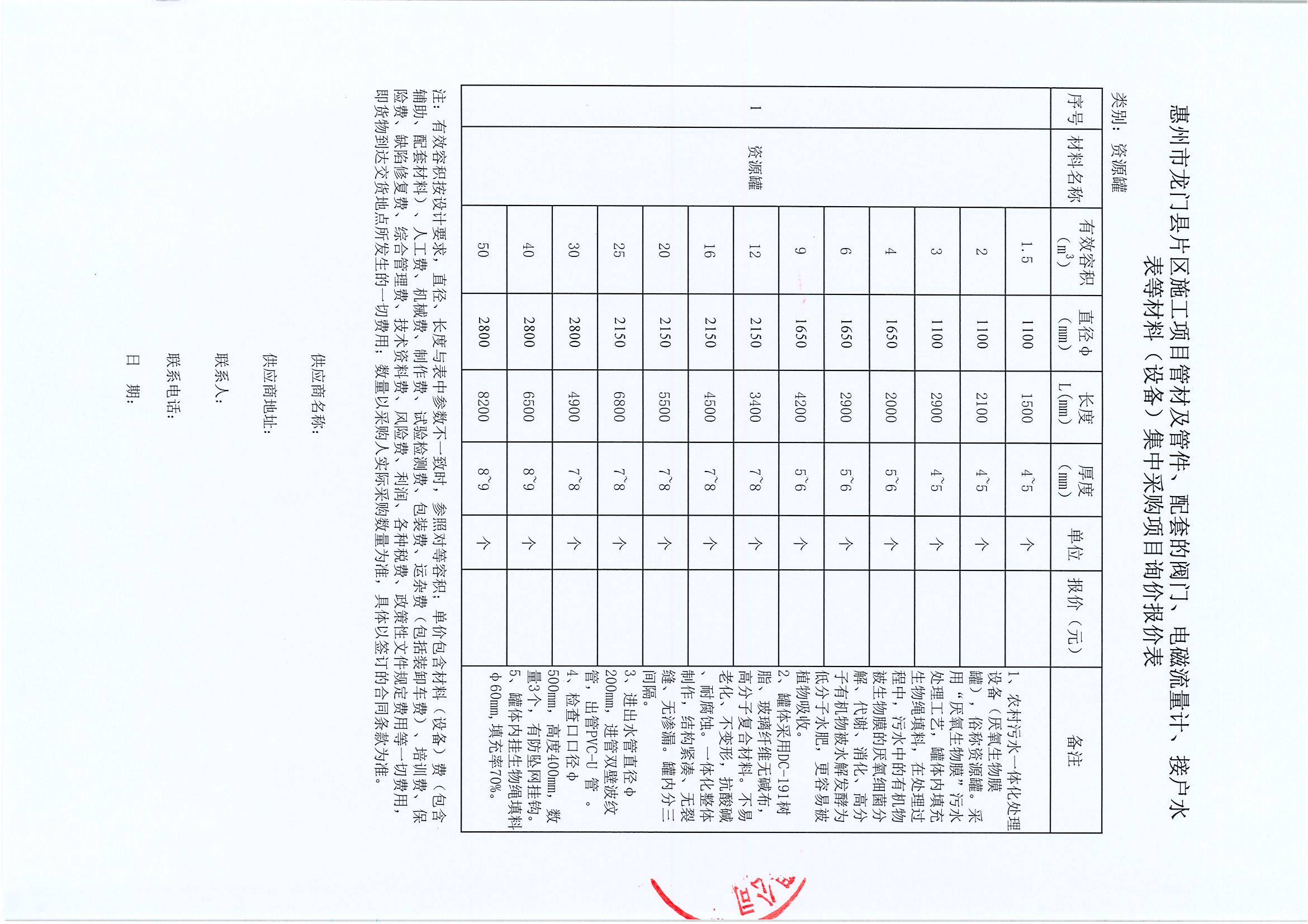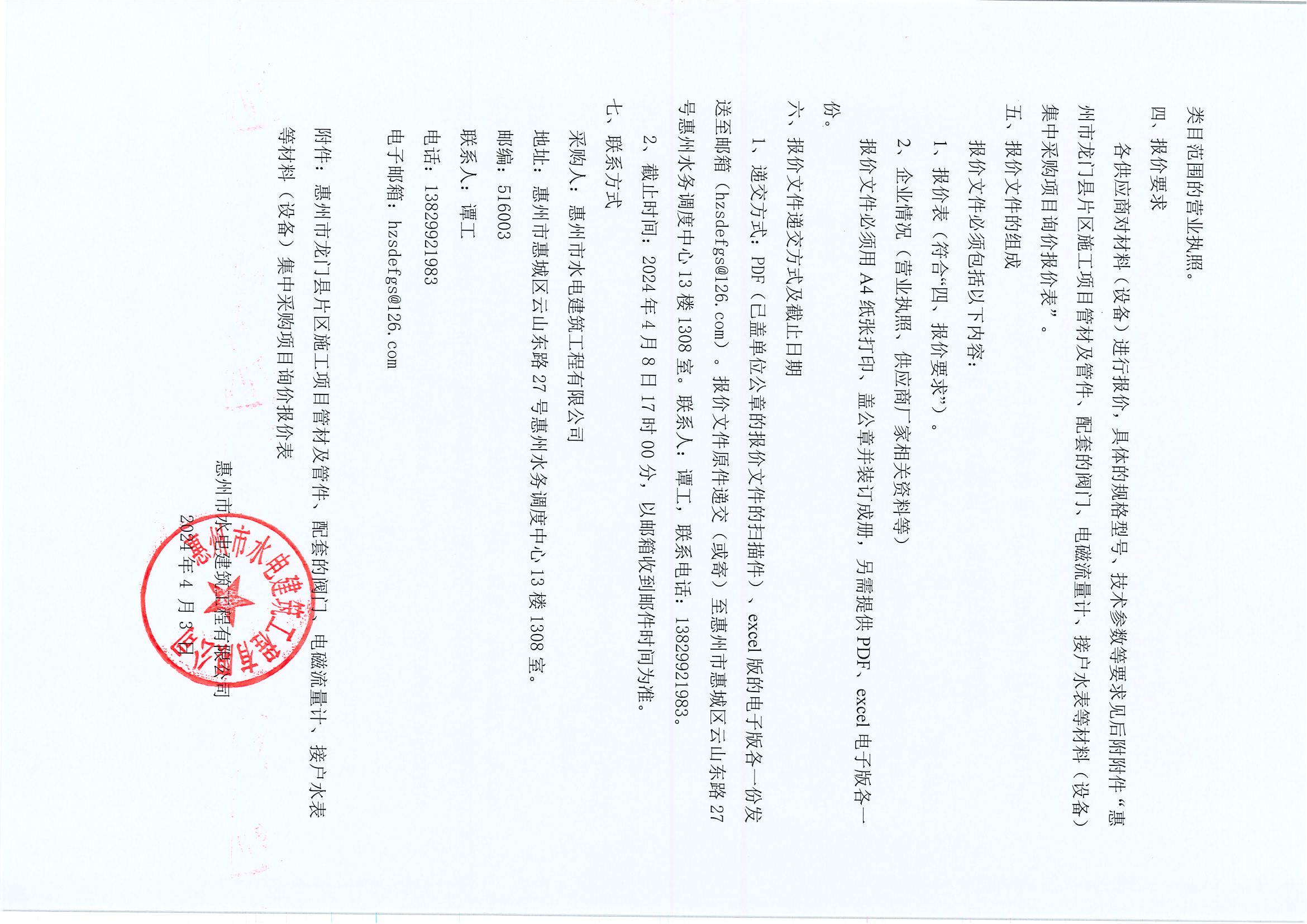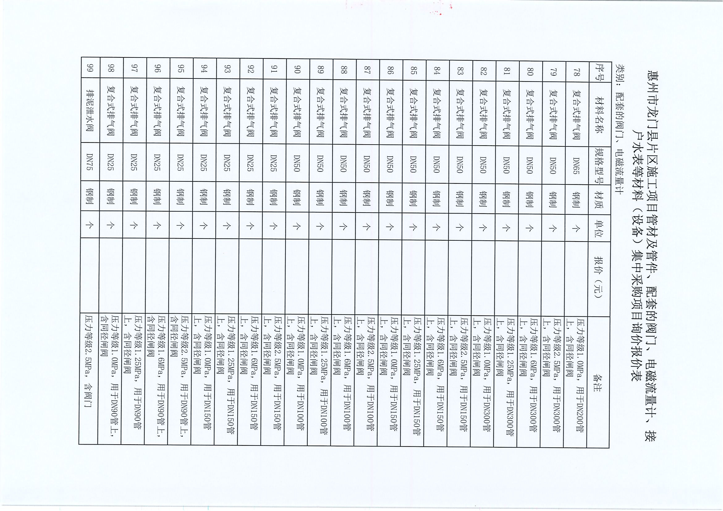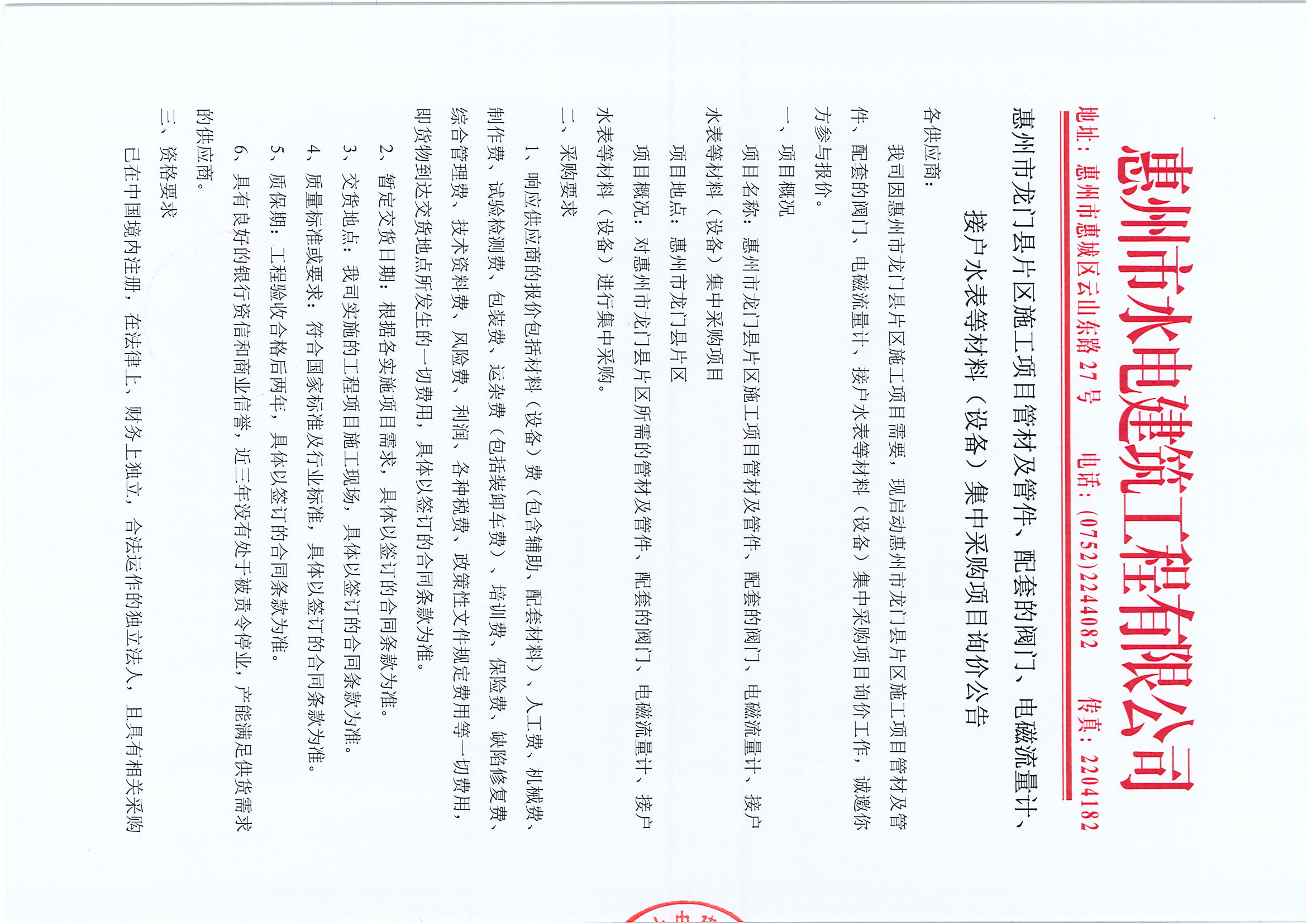 惠州市龍門縣片區(qū)施工項(xiàng)目管材及管件、配套的閥門、電磁流量計(jì)、接戶水表等材料(設(shè)備)集中采購項(xiàng)目詢價(jià)公告