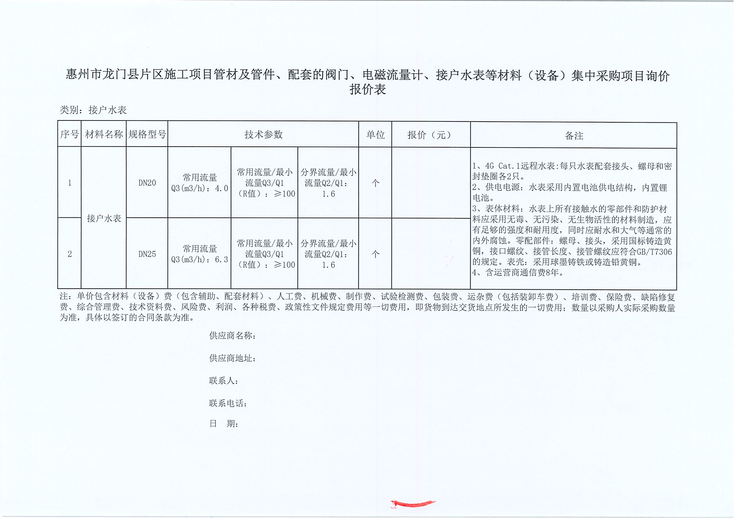 惠州市龍門縣片區(qū)施工項(xiàng)目接戶水表集中采購項(xiàng)目詢價(jià)公告