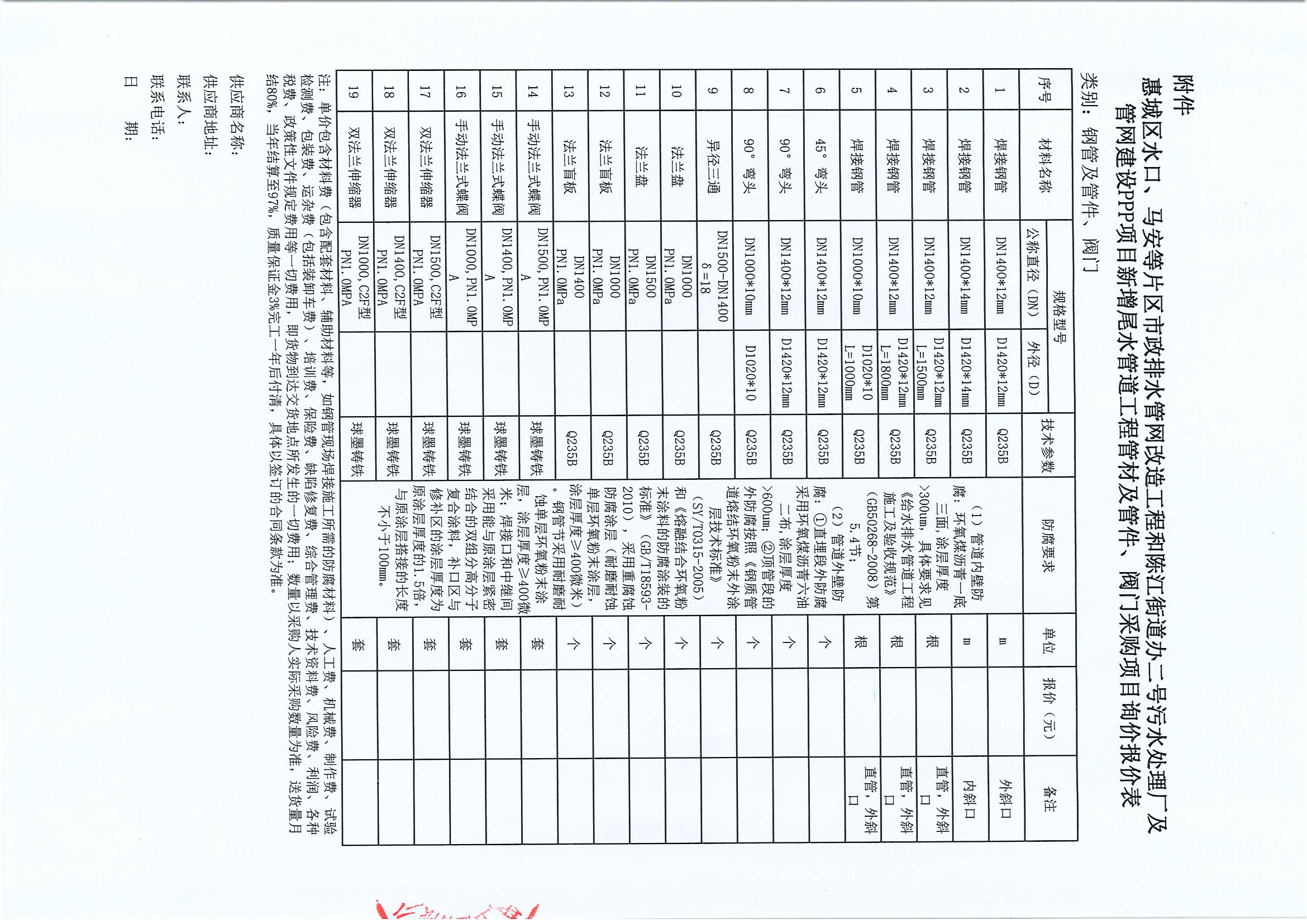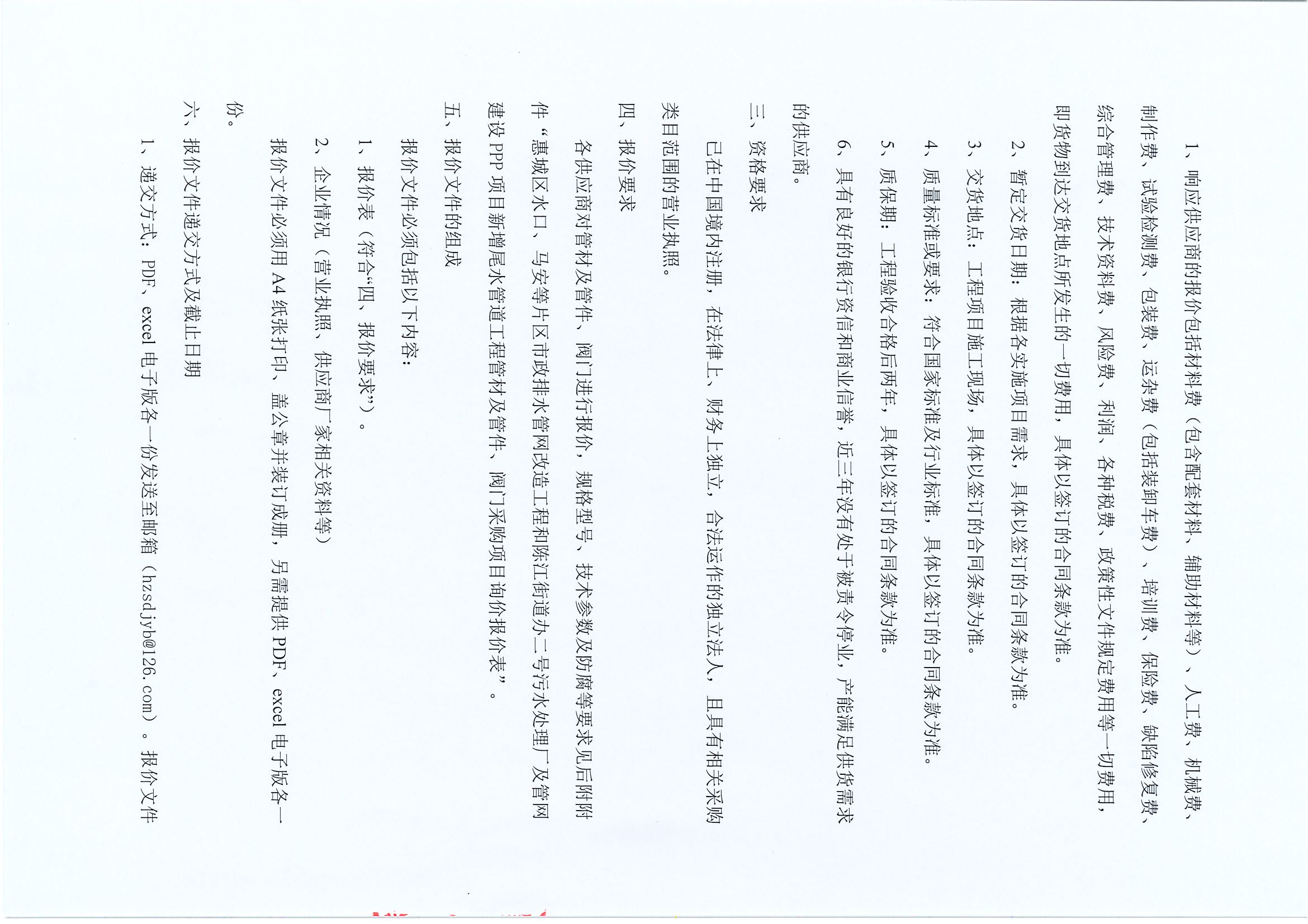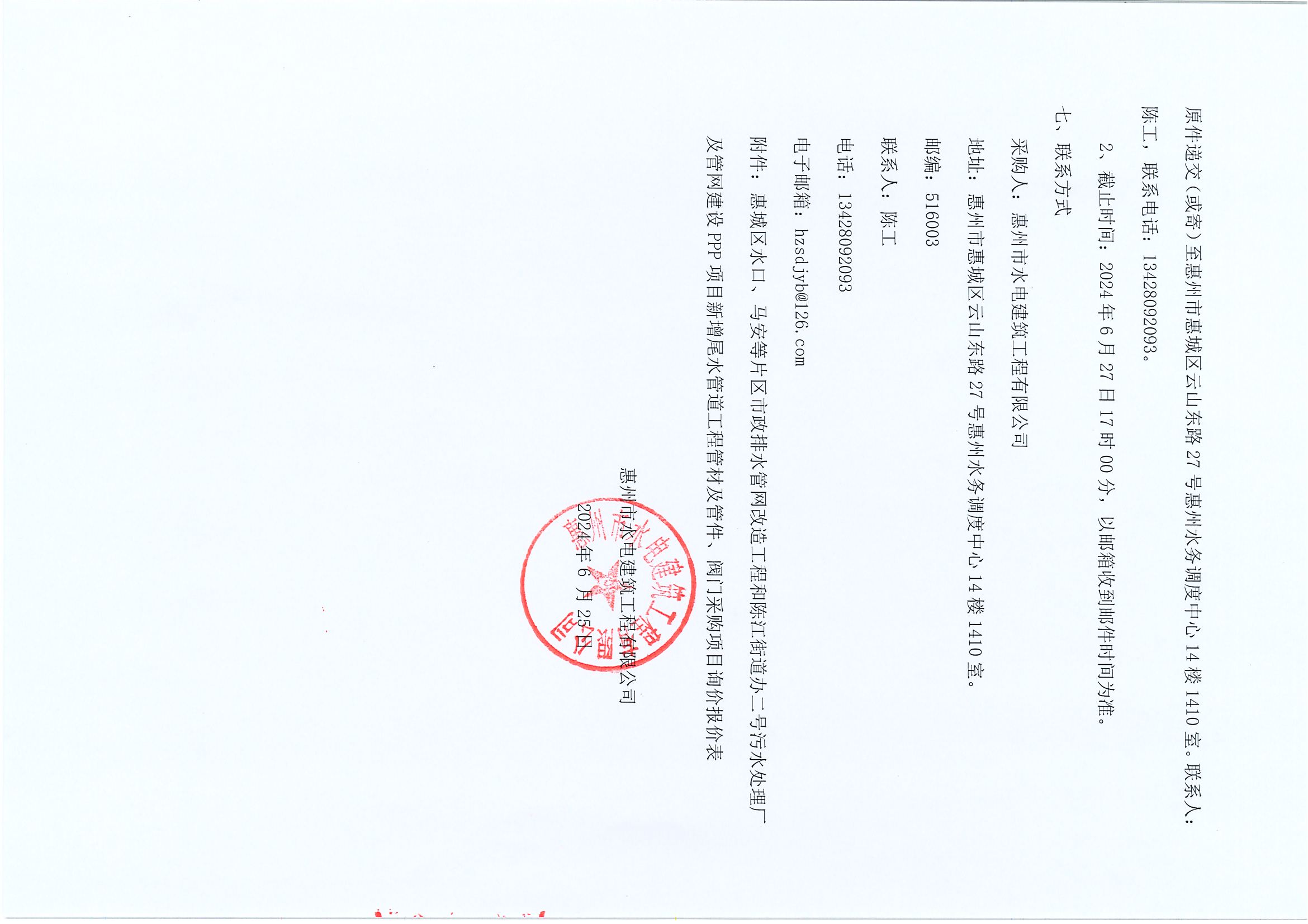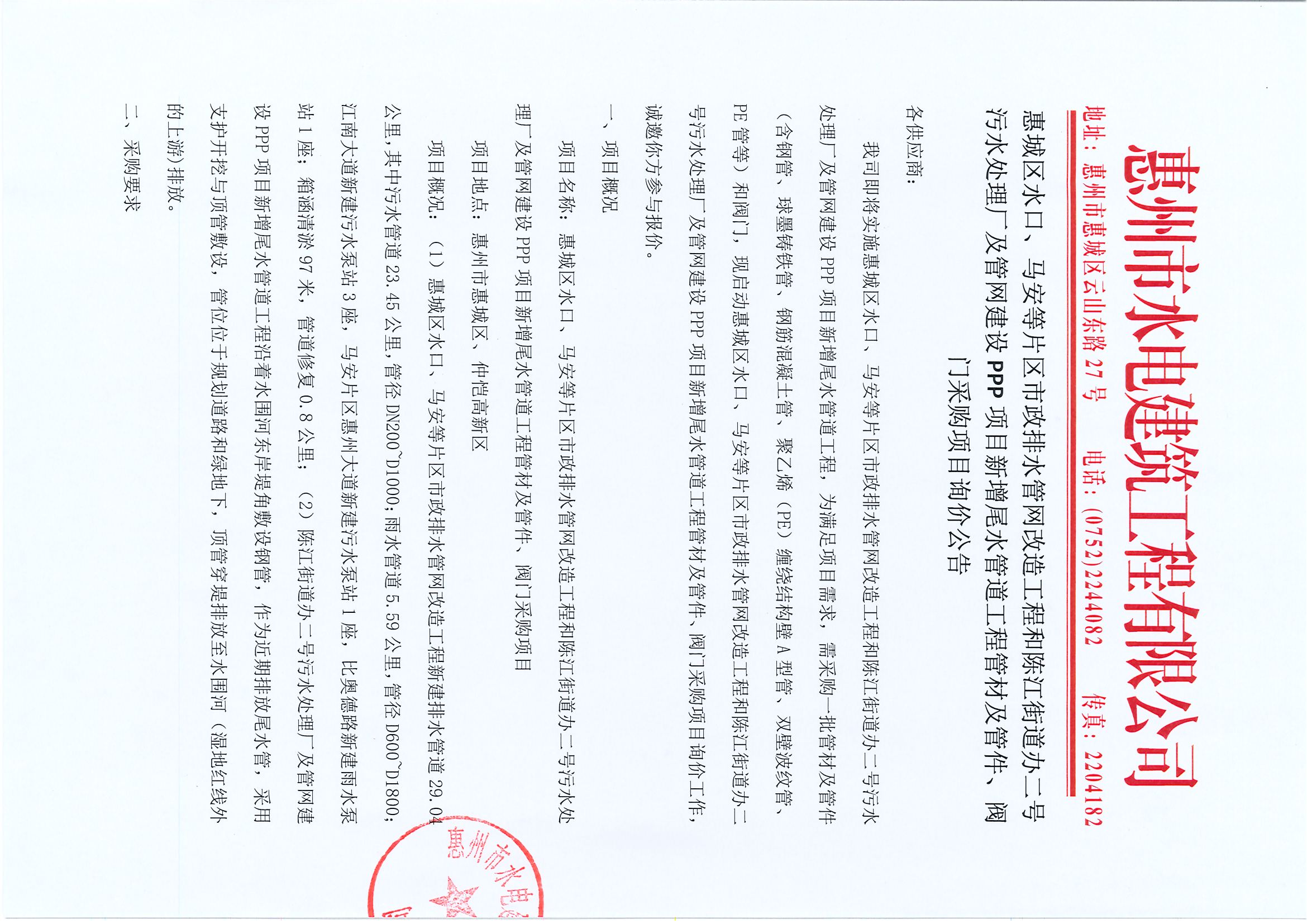 惠城區(qū)水口、馬安等片區(qū)市政排水管網(wǎng)改造工程和陳江街道辦二號(hào)污水處理廠及管網(wǎng)建設(shè)PPP項(xiàng)目新增尾水管道工程管材及管件、閥門采購(gòu)項(xiàng)目詢價(jià)公告