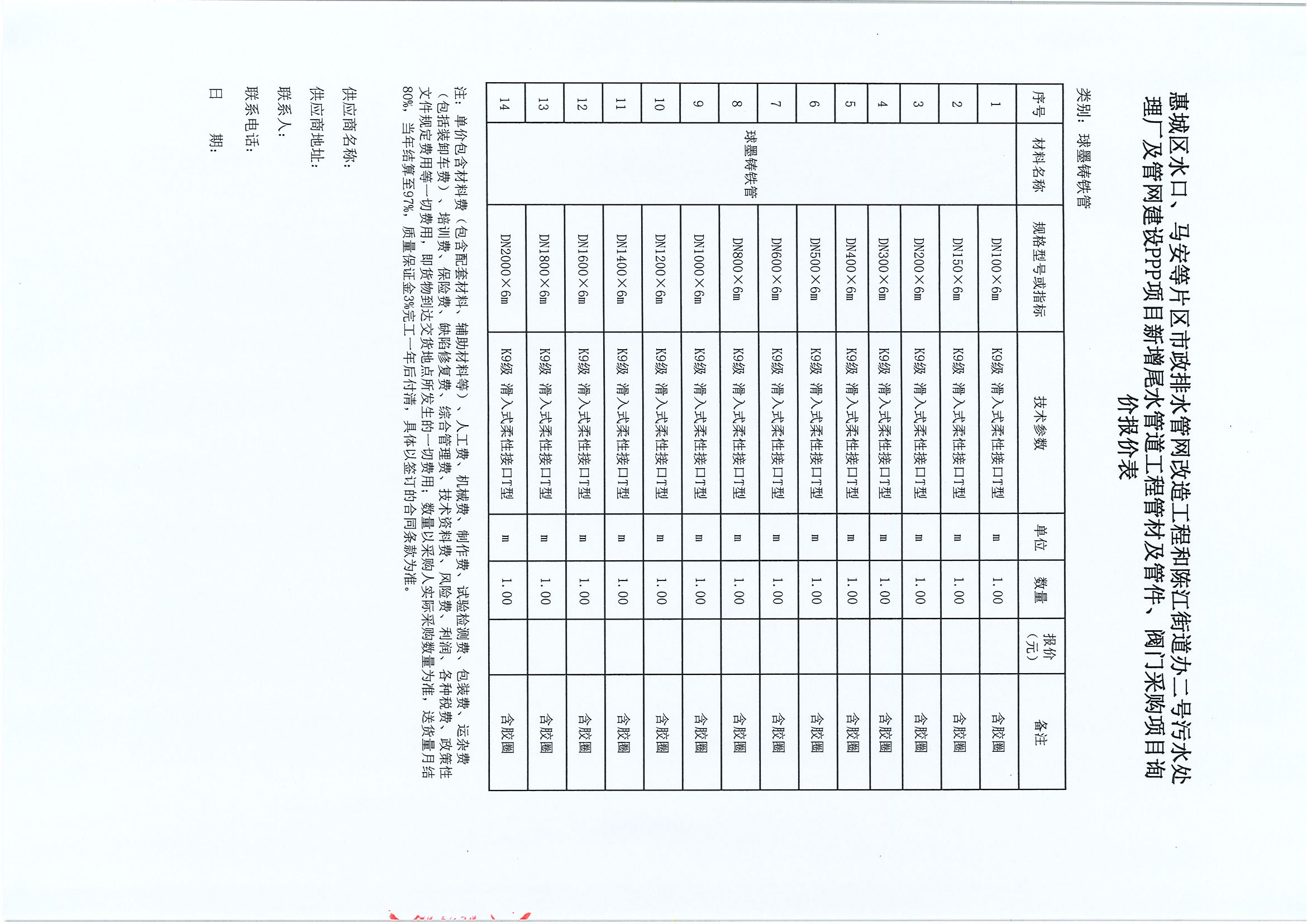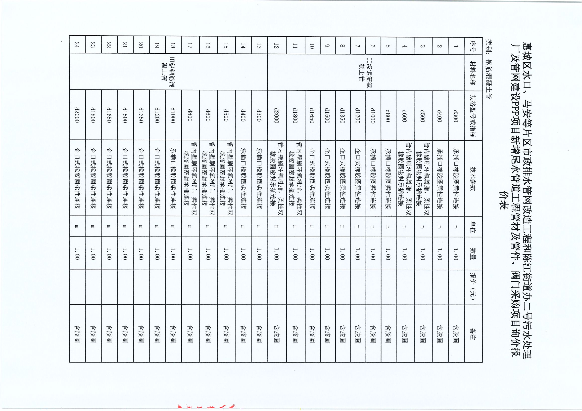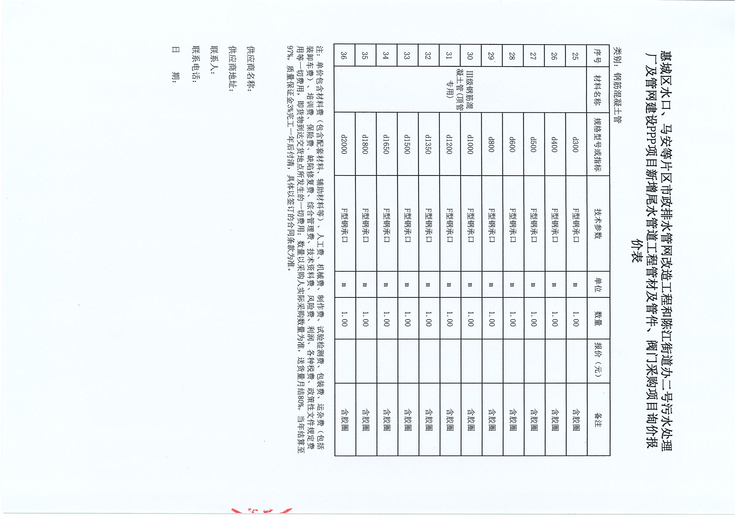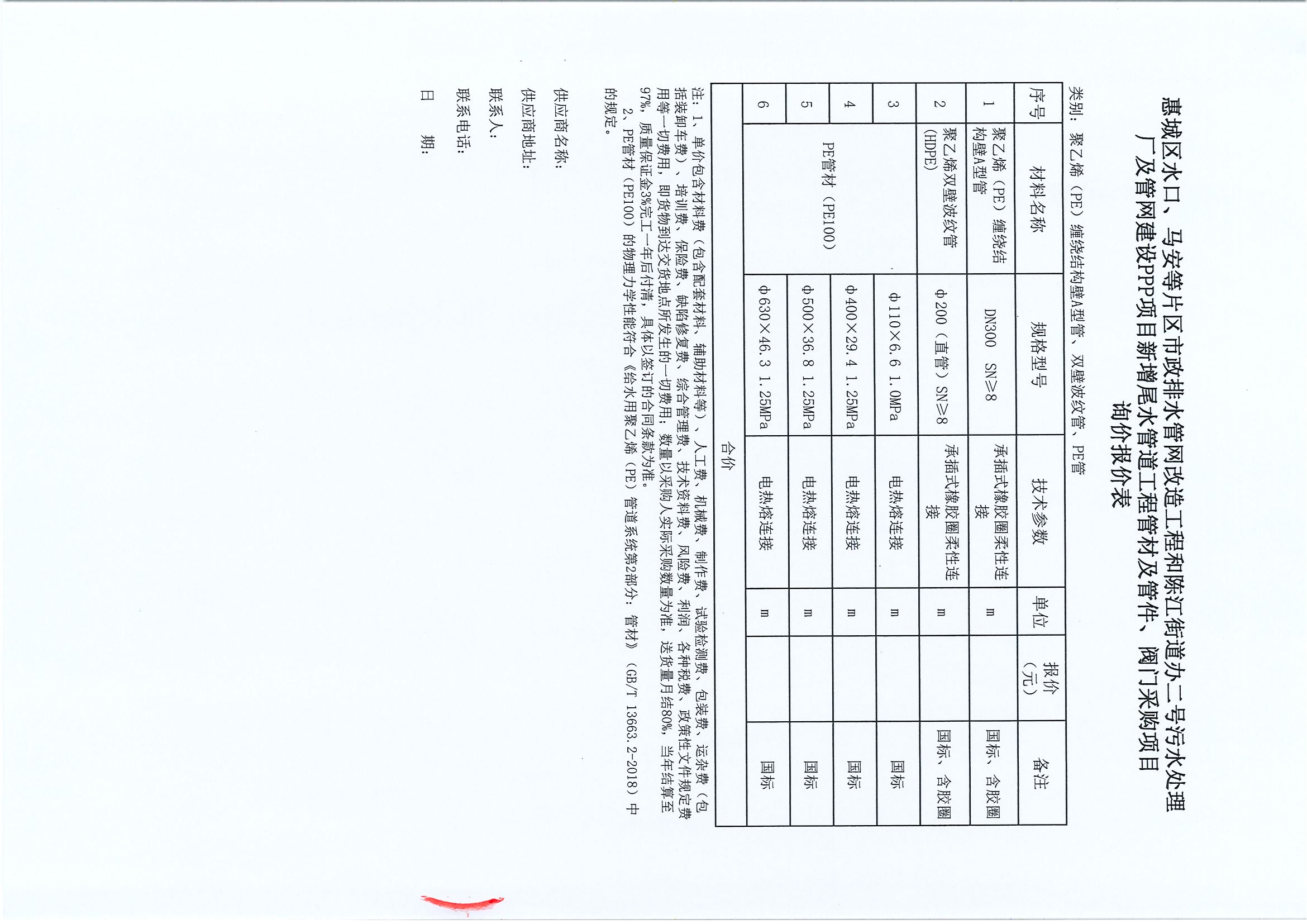 惠城區(qū)水口、馬安等片區(qū)市政排水管網(wǎng)改造工程和陳江街道辦二號(hào)污水處理廠及管網(wǎng)建設(shè)PPP項(xiàng)目新增尾水管道工程管材及管件、閥門采購(gòu)項(xiàng)目詢價(jià)公告