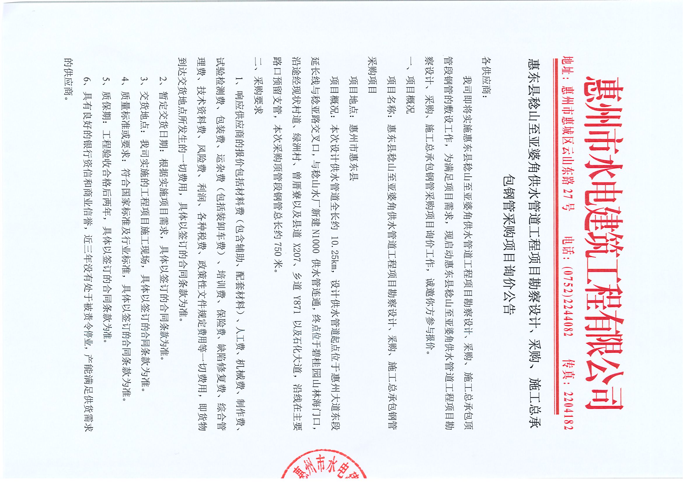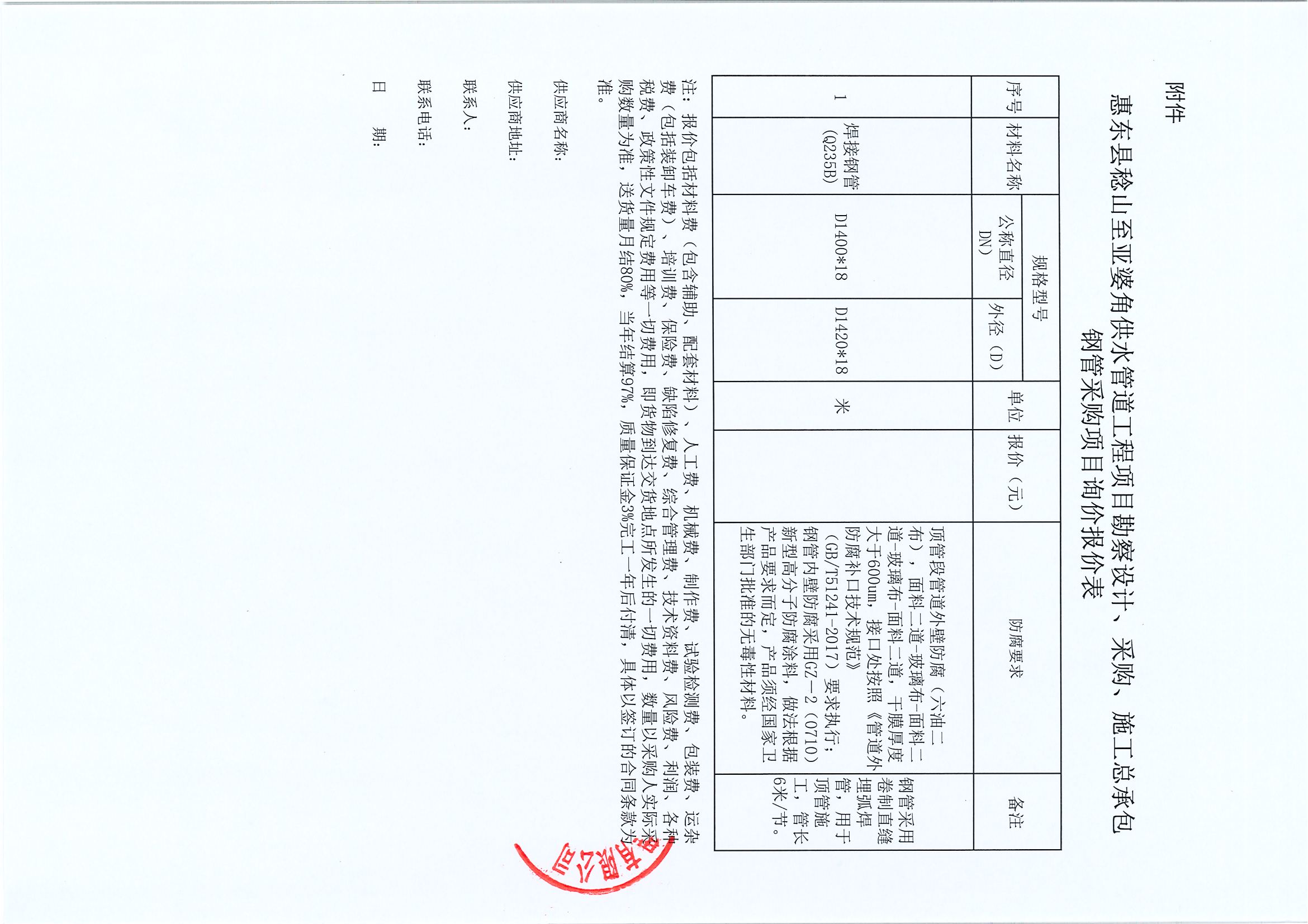 惠東縣稔山至亞婆角供水管道工程項(xiàng)目勘察設(shè)計(jì)、采購(gòu)、施工總承包鋼管采購(gòu)項(xiàng)目詢價(jià)公告