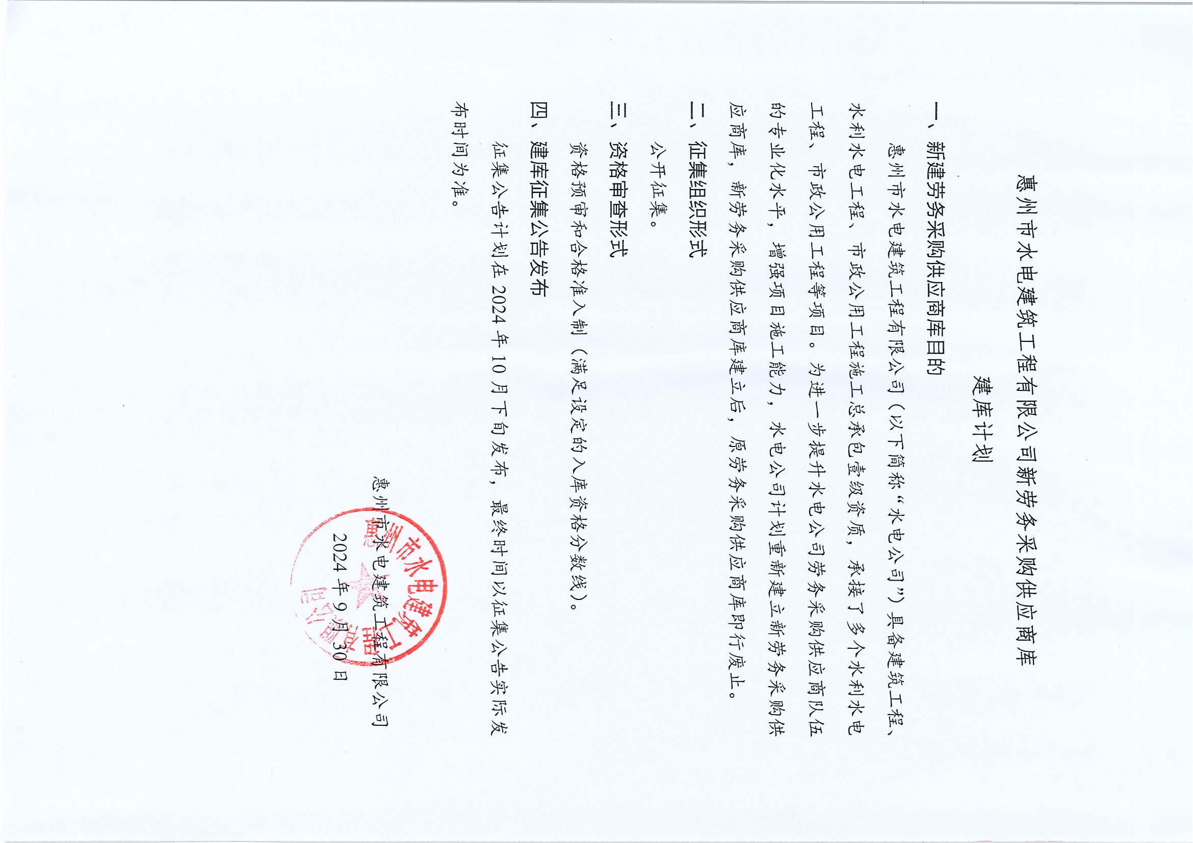 惠州市水電建筑工程有限公司新勞務(wù)采購供應(yīng)商庫建庫計劃