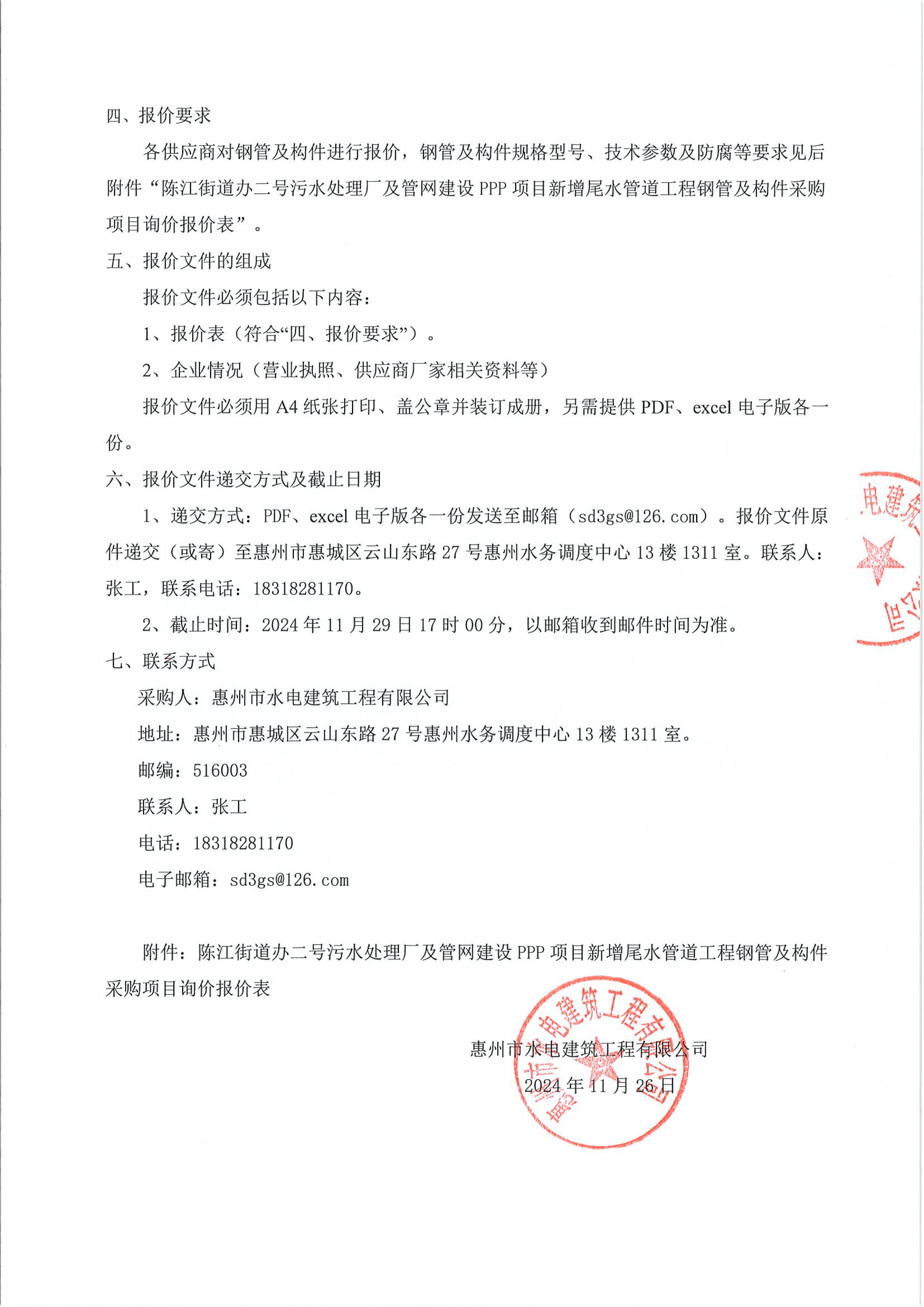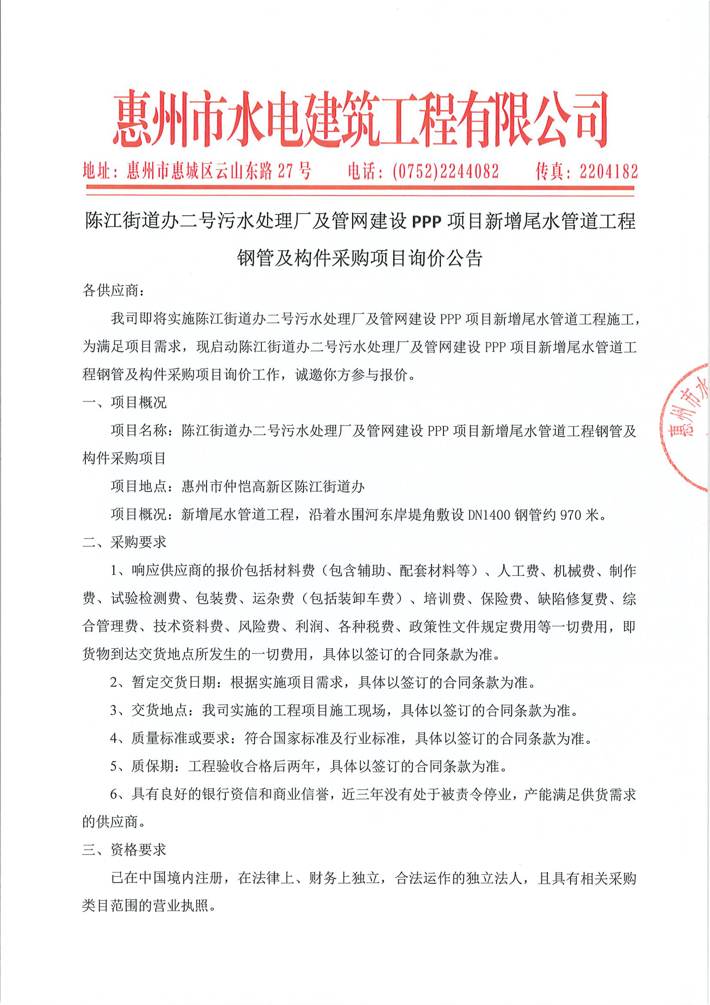陳江街道辦二號(hào)污水處理廠及管網(wǎng)建設(shè)PPP項(xiàng)目新增尾水管道工程鋼管及構(gòu)件采購項(xiàng)目詢價(jià)公告