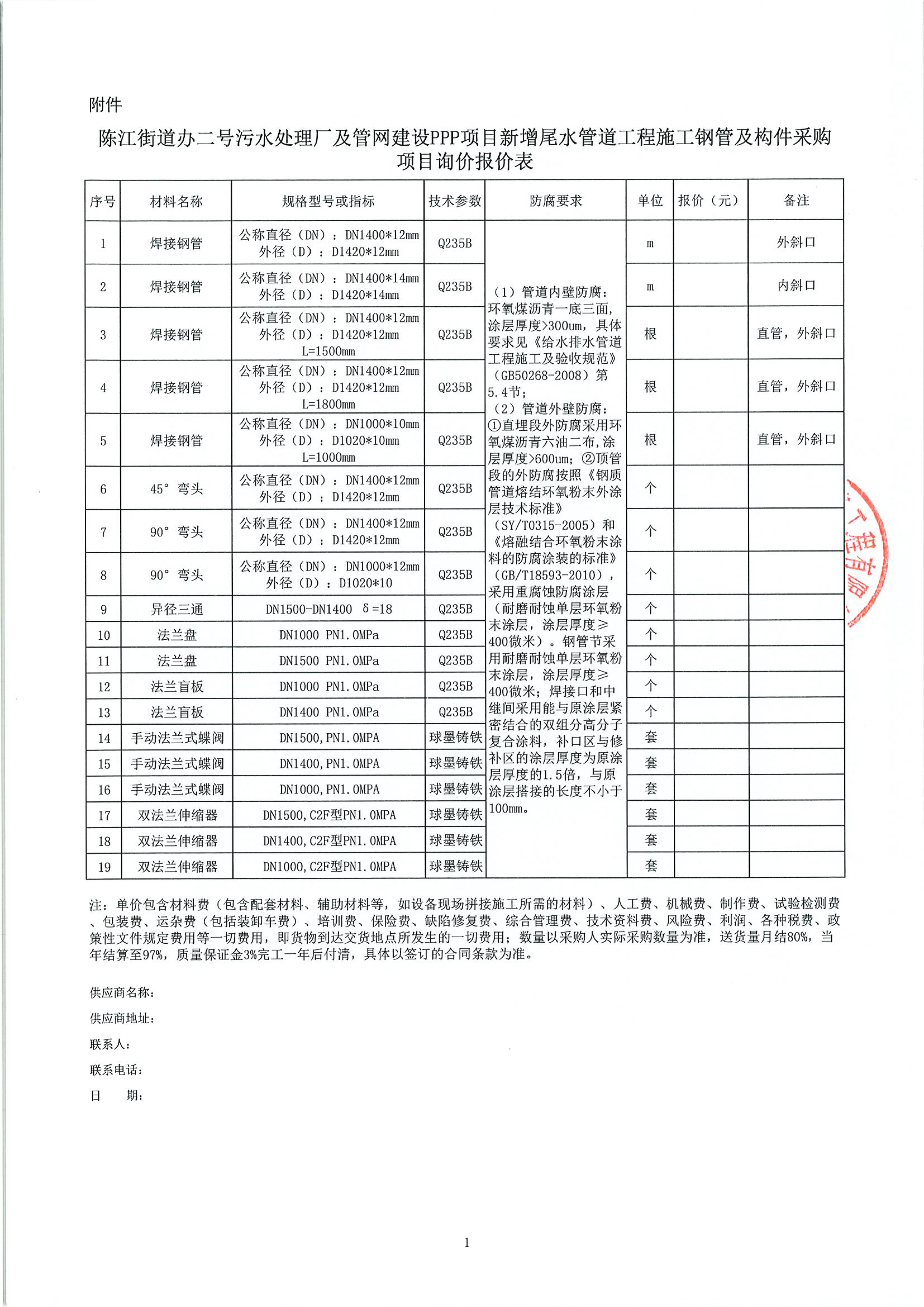 附件:陳江街道辦二號(hào)污水處理廠及管網(wǎng)建設(shè)PPP項(xiàng)目新增尾水管道工程鋼管及構(gòu)件采購項(xiàng)目詢價(jià)報(bào)價(jià)表