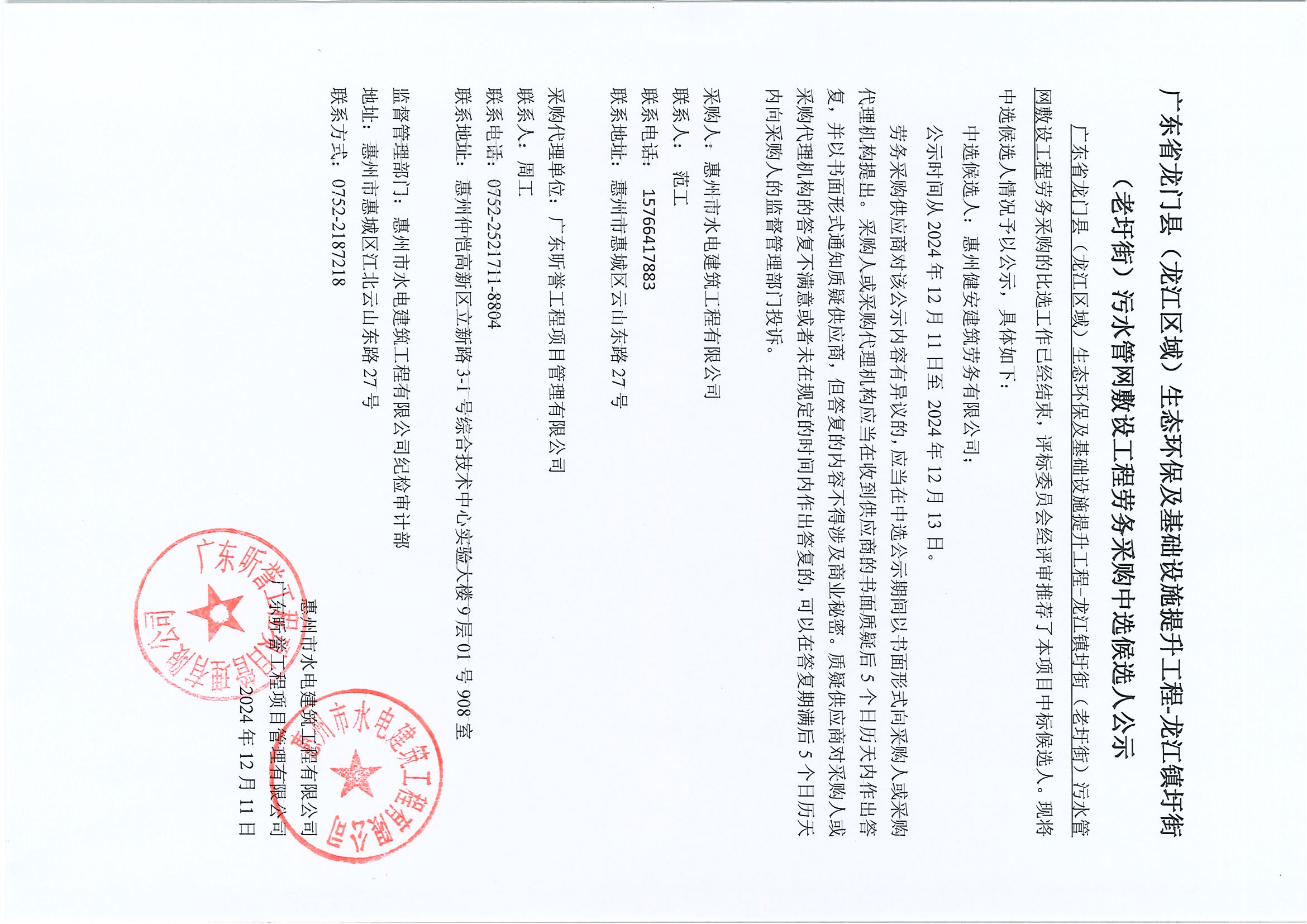 廣東省龍門縣(龍江區(qū)域)生態(tài)環(huán)保及基礎(chǔ)設(shè)施提升工程-龍江鎮(zhèn)圩街(老圩街)污水管網(wǎng)敷設(shè)工程勞務(wù)采購(gòu)中選候選人公示