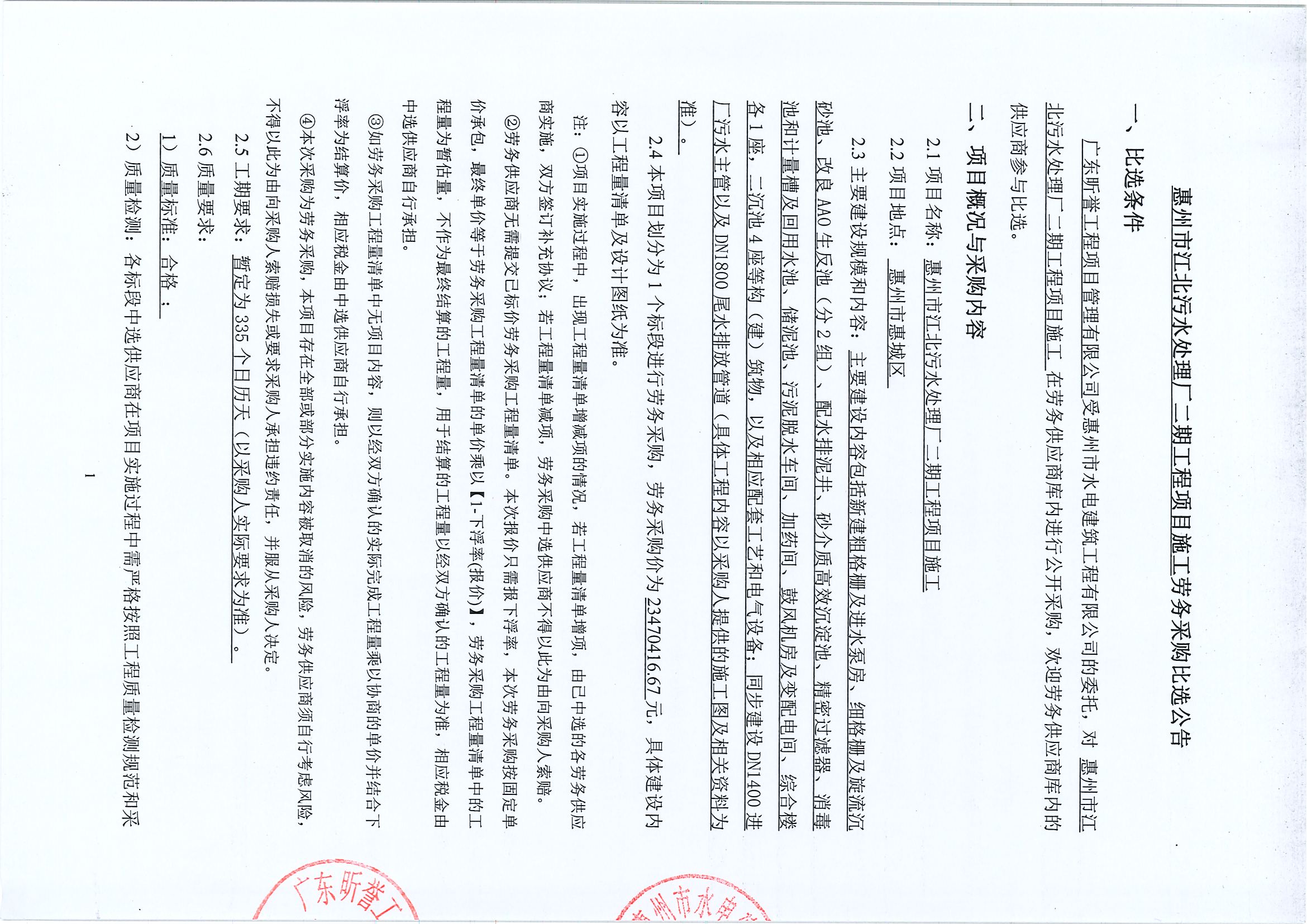 惠州市江北污水處理廠二期工程項(xiàng)目施工勞務(wù)采購比選公告附件:
