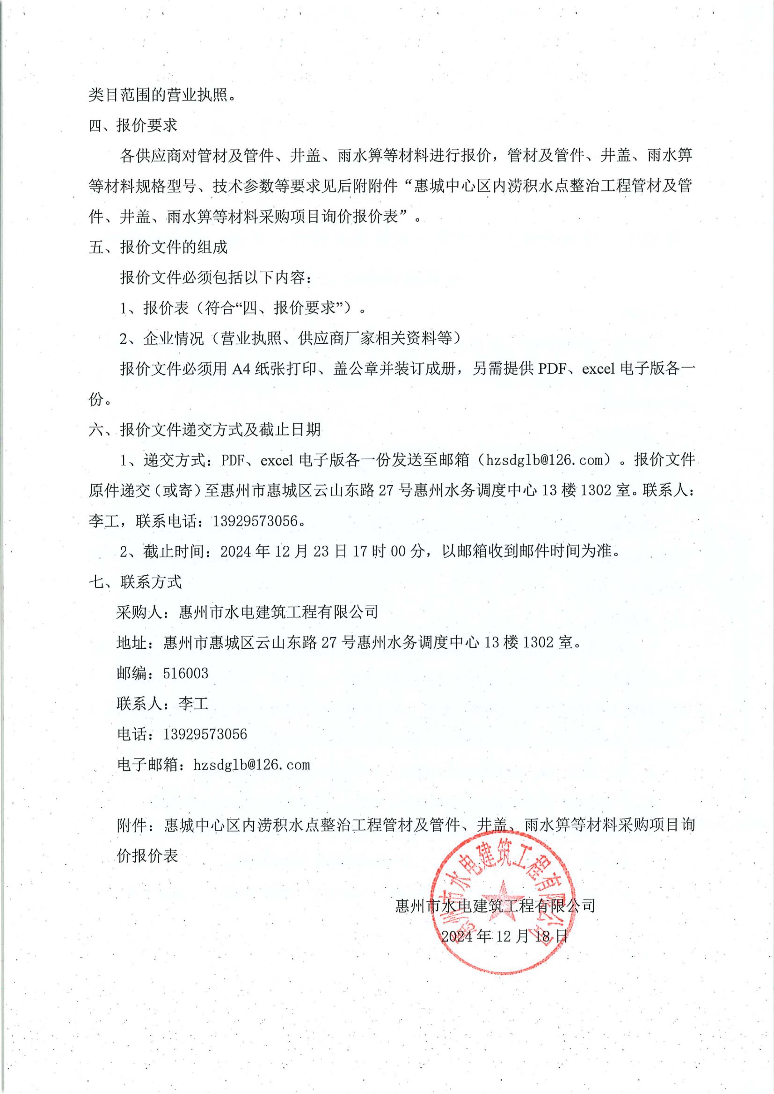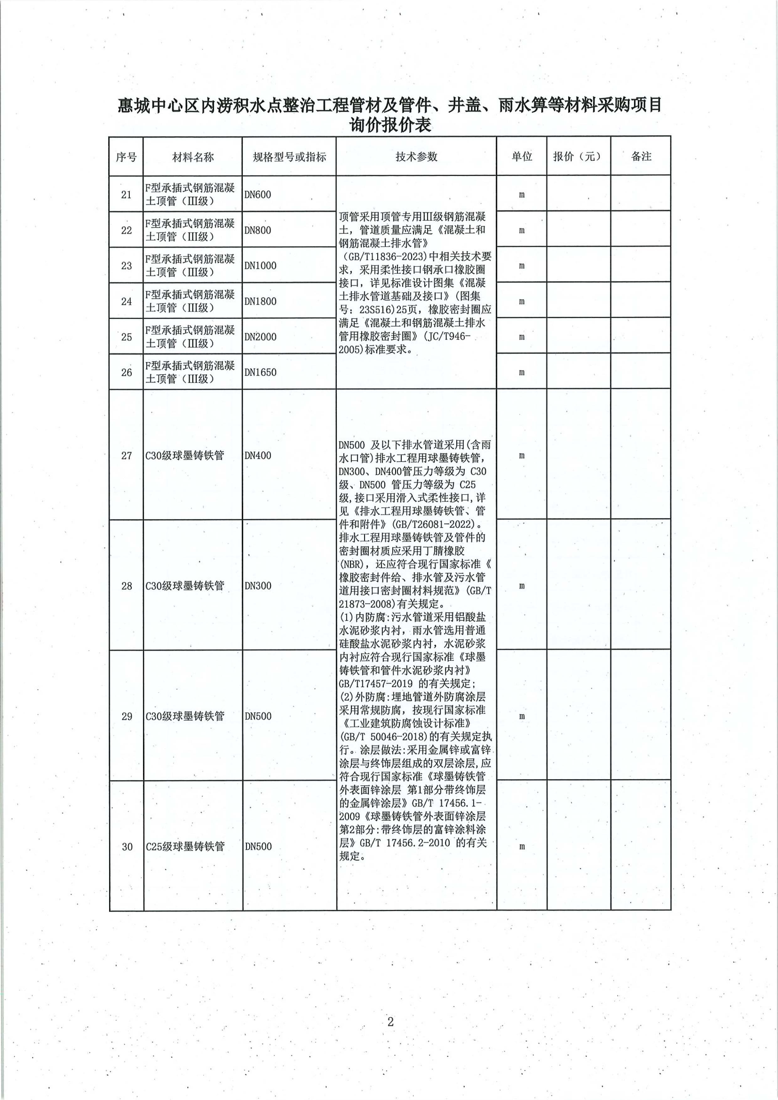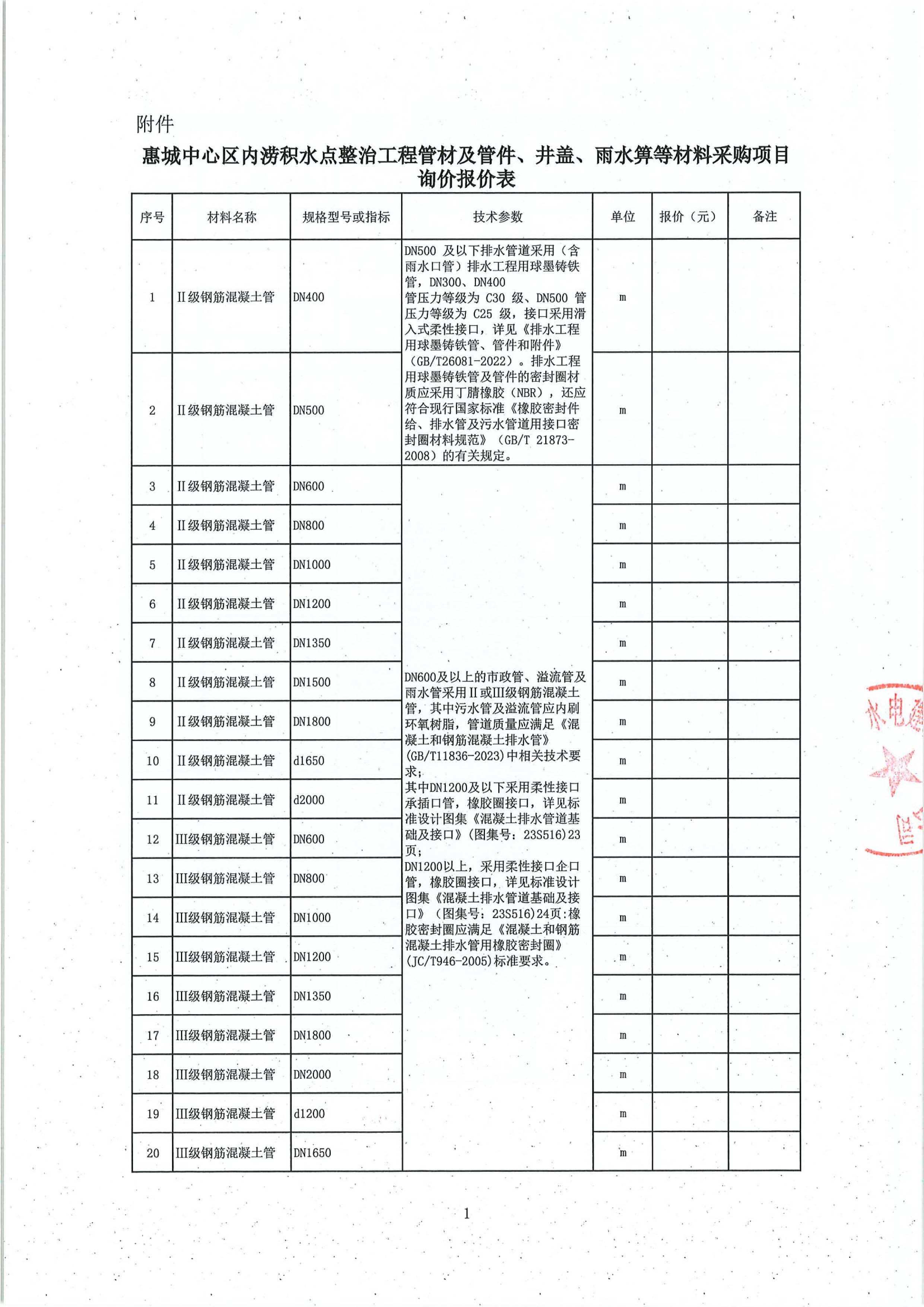 附件:惠城中心區(qū)內(nèi)澇積水點整治工程管材及管件、井蓋、雨水箅等材料采購項目詢價報價表