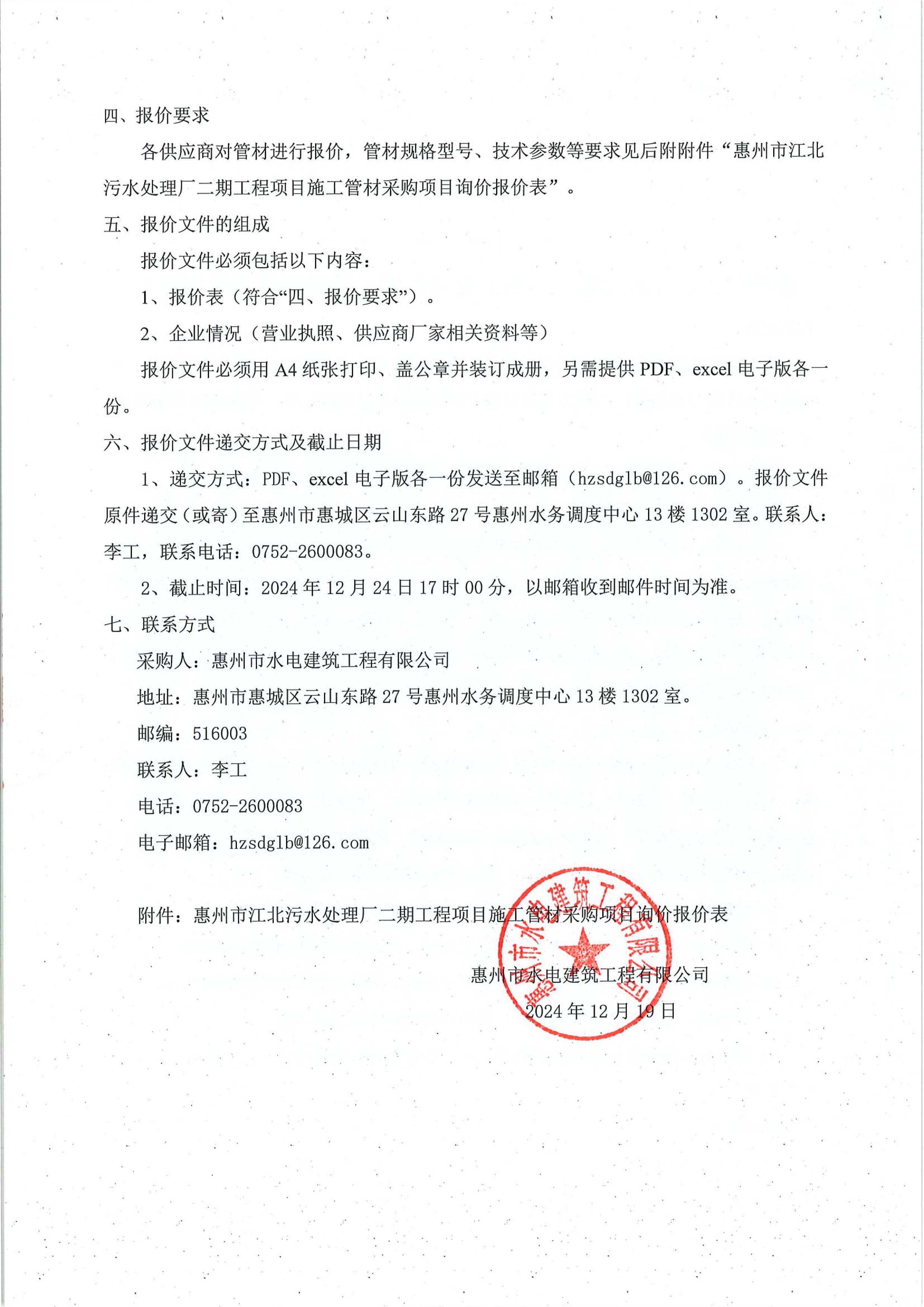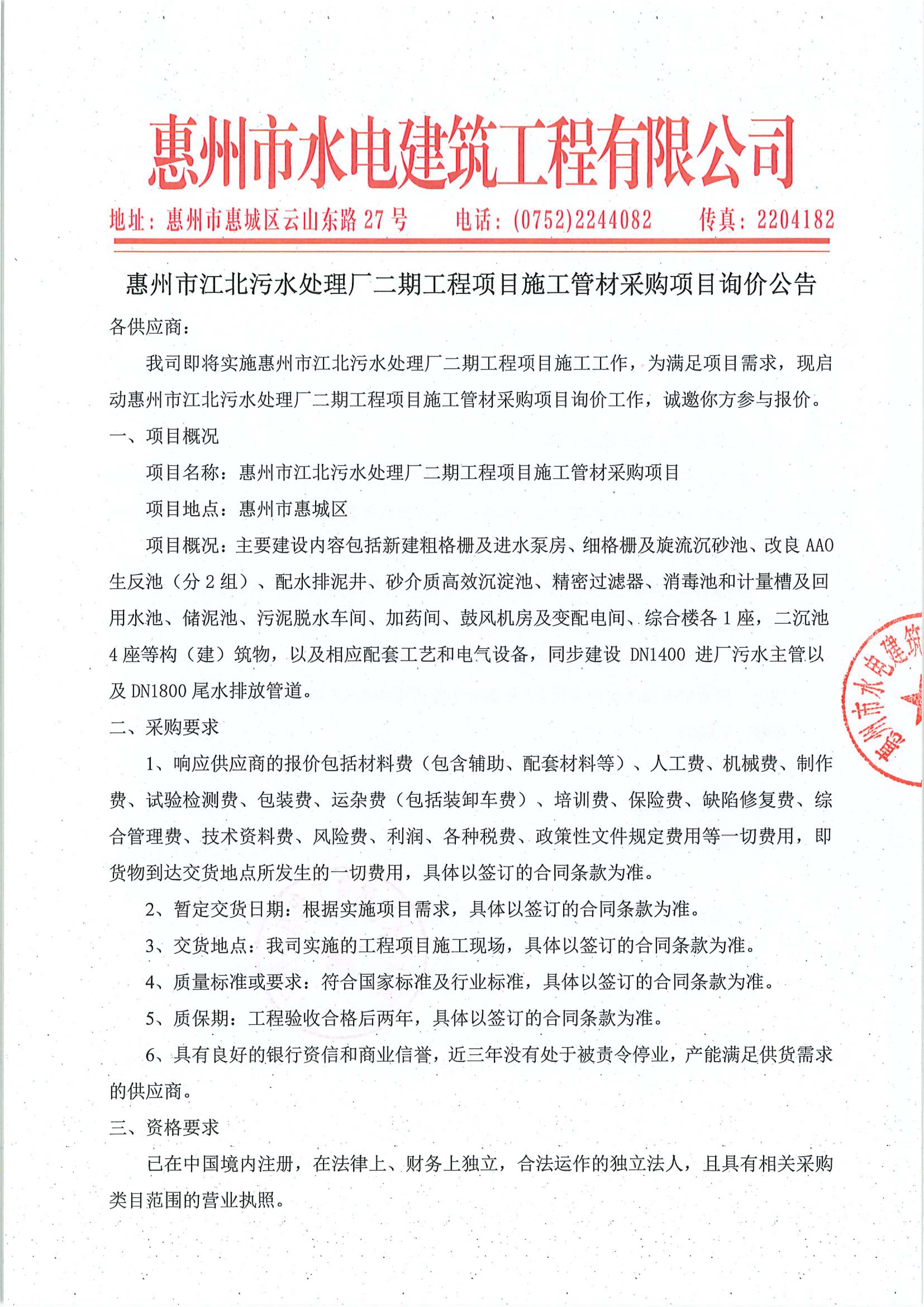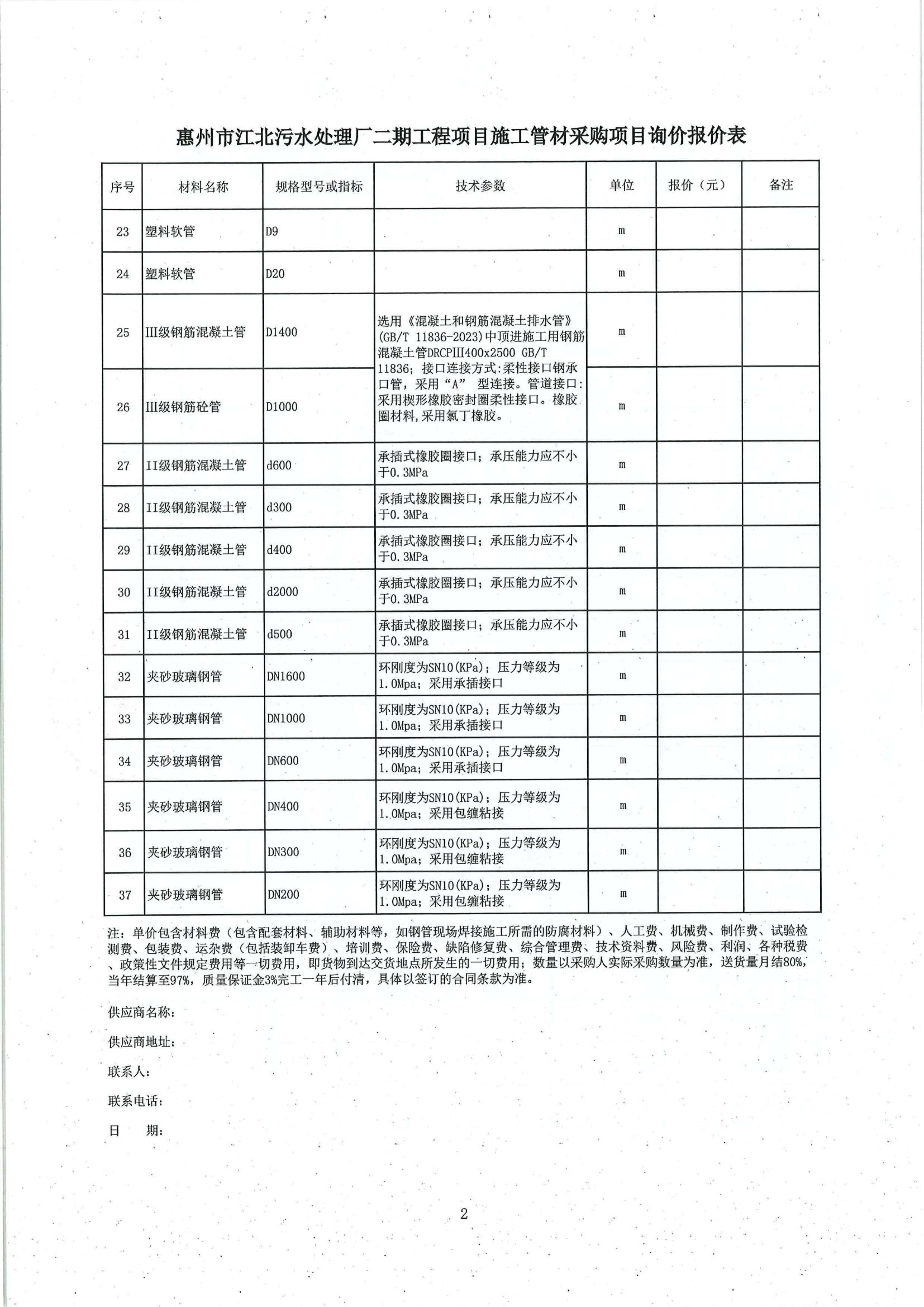 惠州市江北污水處理廠二期工程項目施工管材采購項目詢價公告