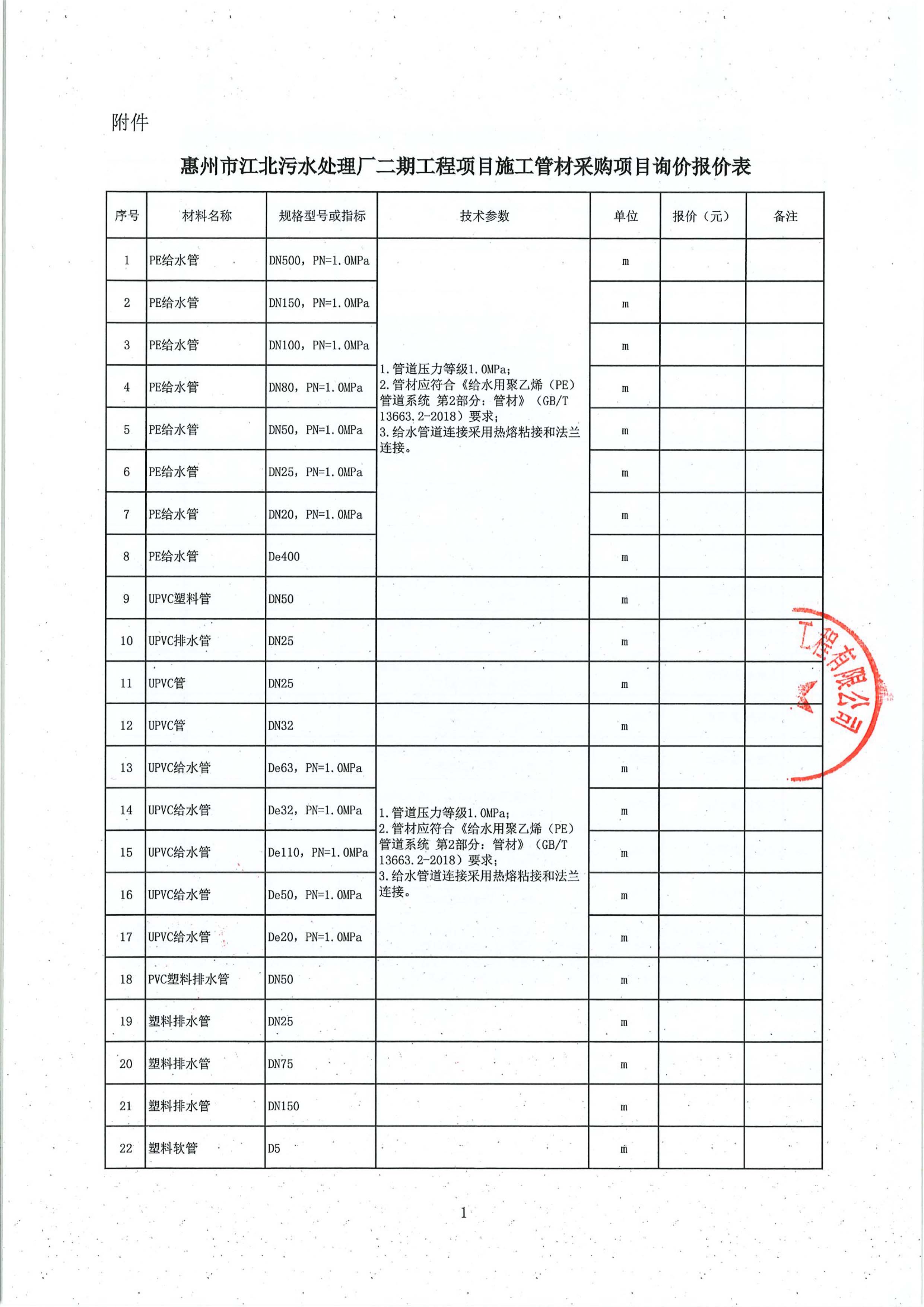 附件:惠州市江北污水處理廠二期工程項目施工管材采購項目詢價報價表