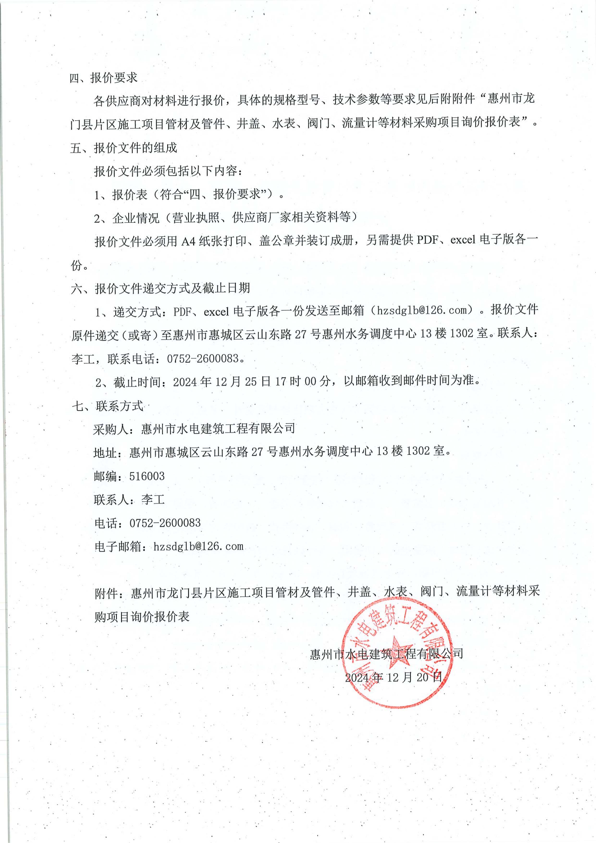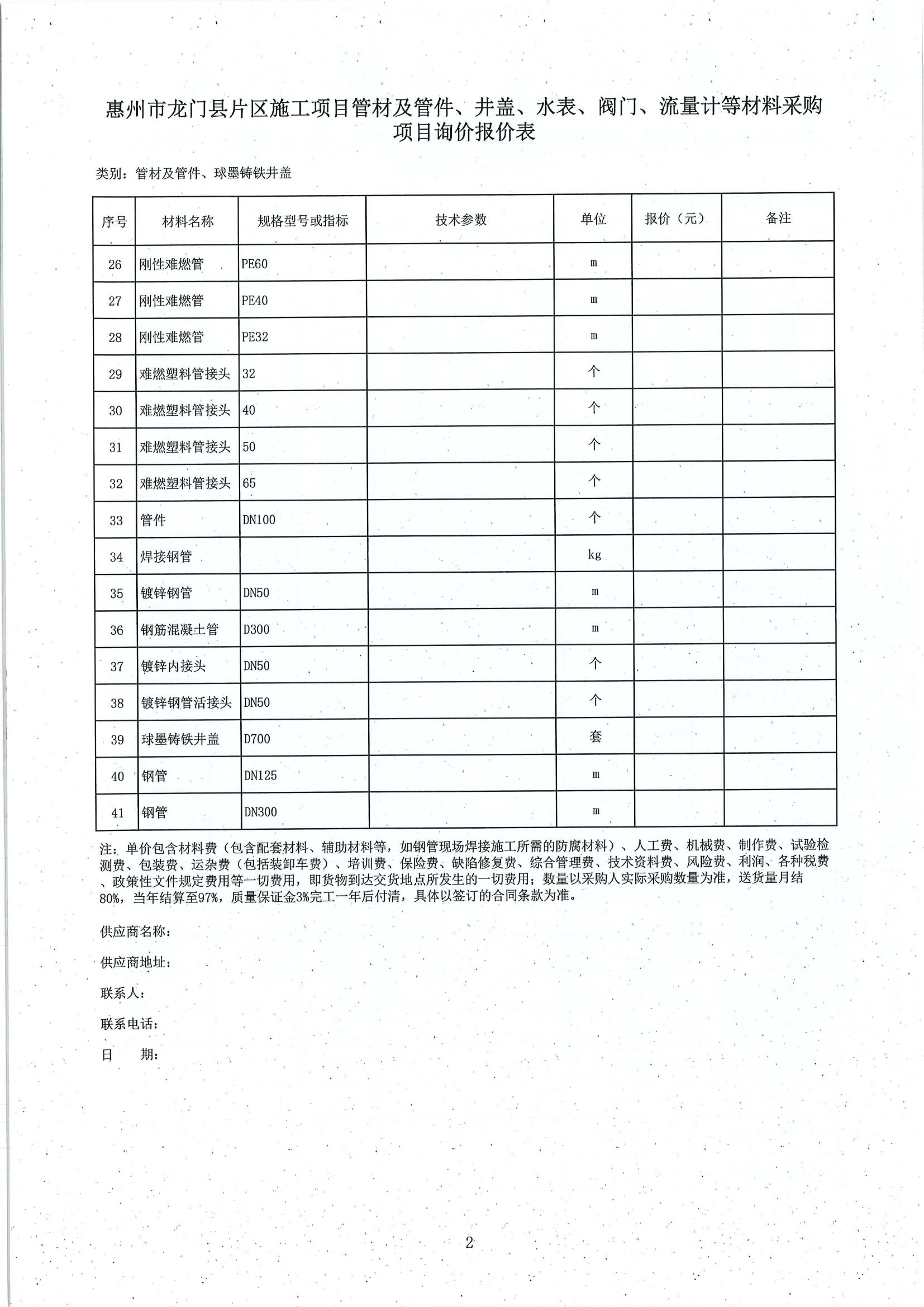 惠州市龍門縣片區(qū)施工項目管材及管件、井蓋、水表、閥門、流量計等材料采購項目詢價公告附件: