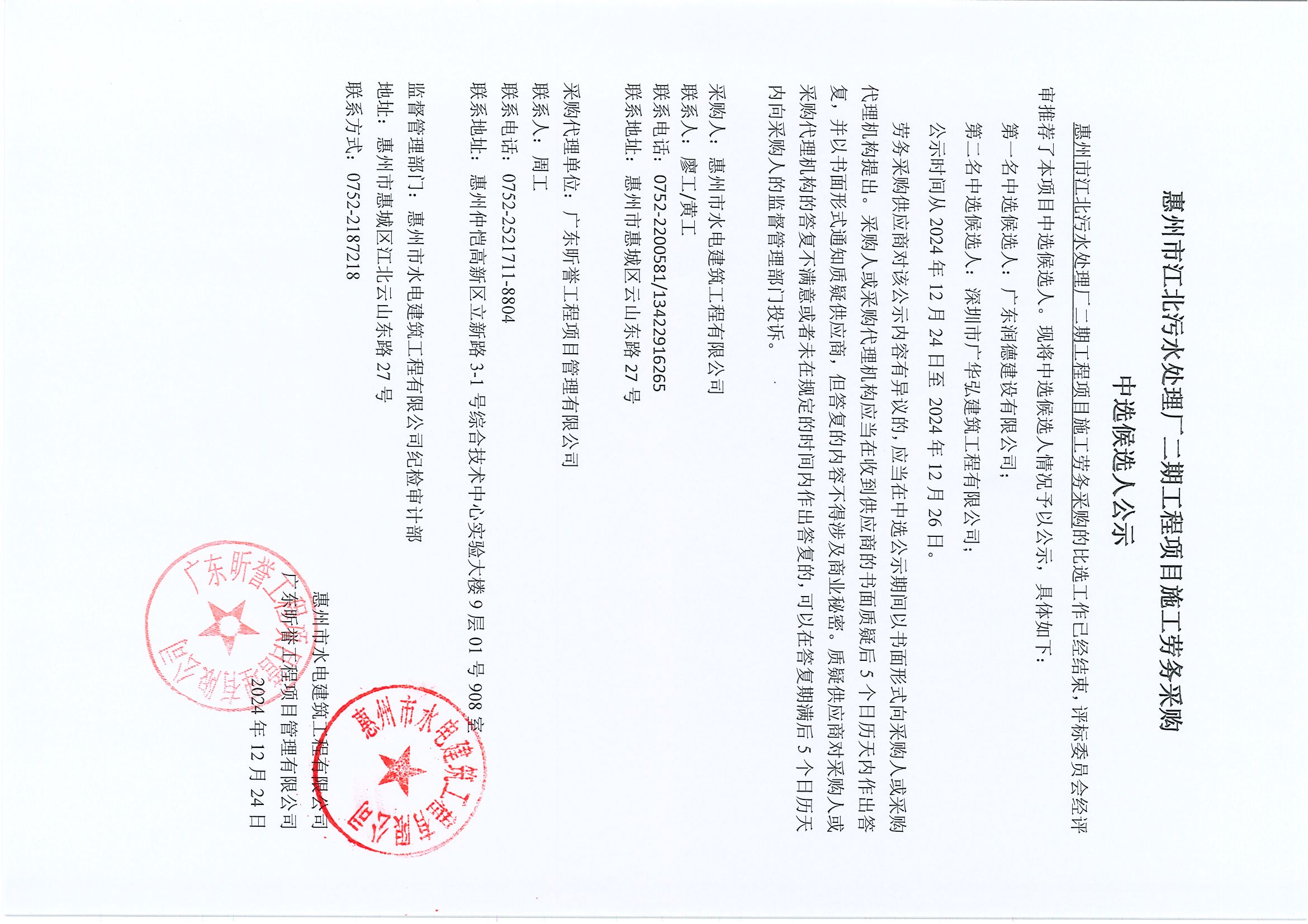 惠州市江北污水處理廠二期工程項(xiàng)目施工勞務(wù)采購(gòu) 中選候選人公示