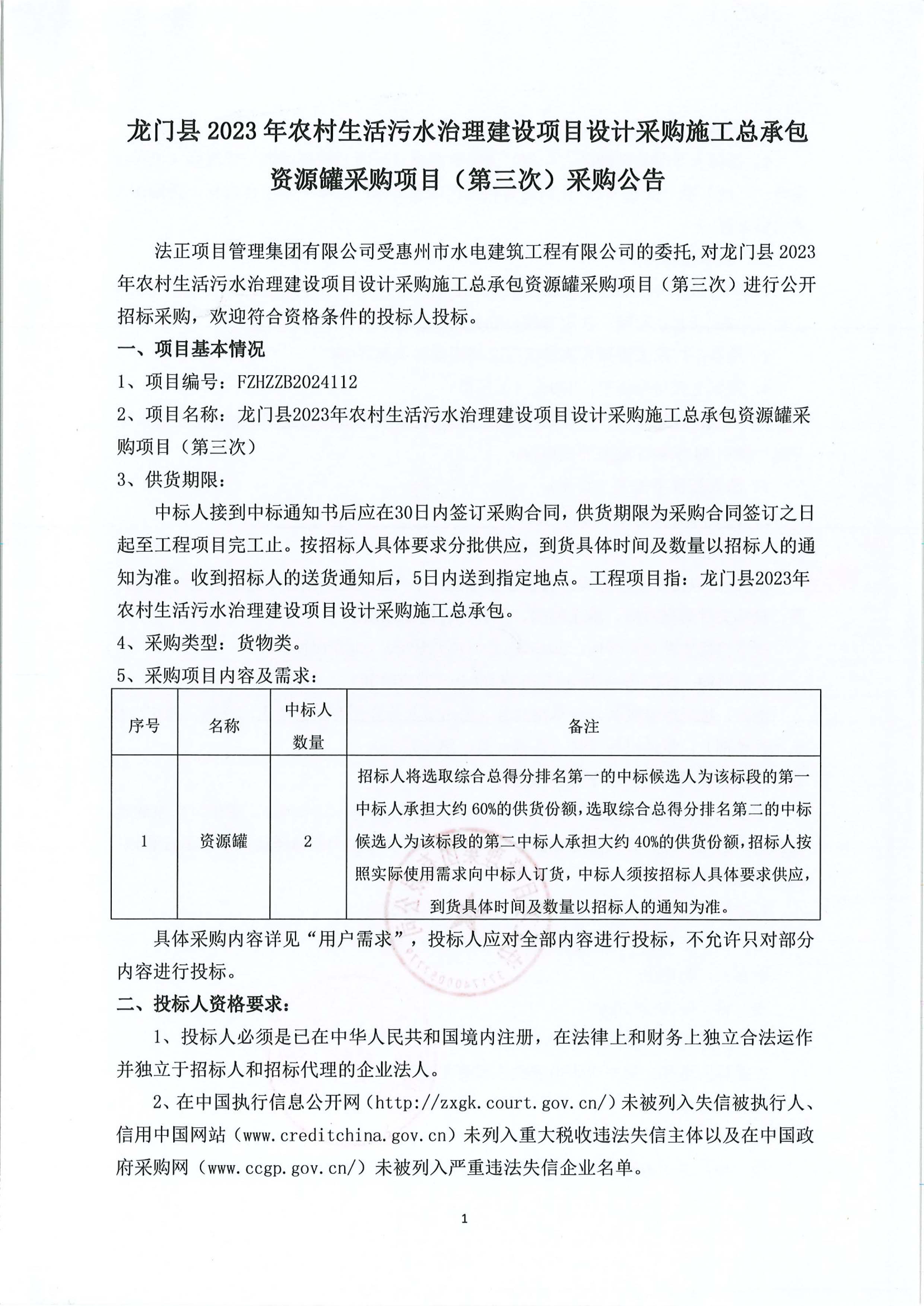 龍門縣2023年農(nóng)村生活污水治理建設(shè)項目設(shè)計采購施工總承包資源罐采購項目(第三次)采購公告