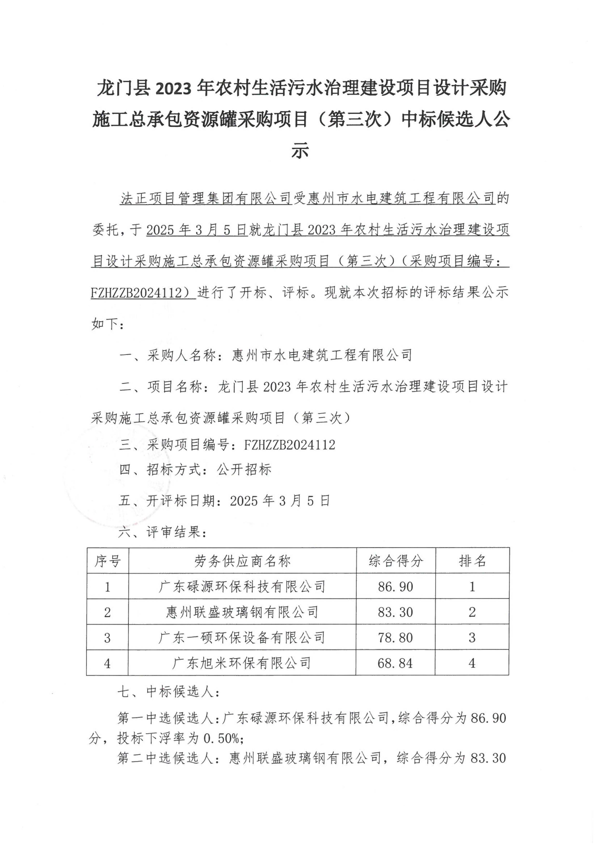龍門縣2023年農(nóng)村生活污水治理建設(shè)項(xiàng)目設(shè)計(jì)采購(gòu)施工總承包資源罐采購(gòu)項(xiàng)目(第三次)中標(biāo)候選人公示