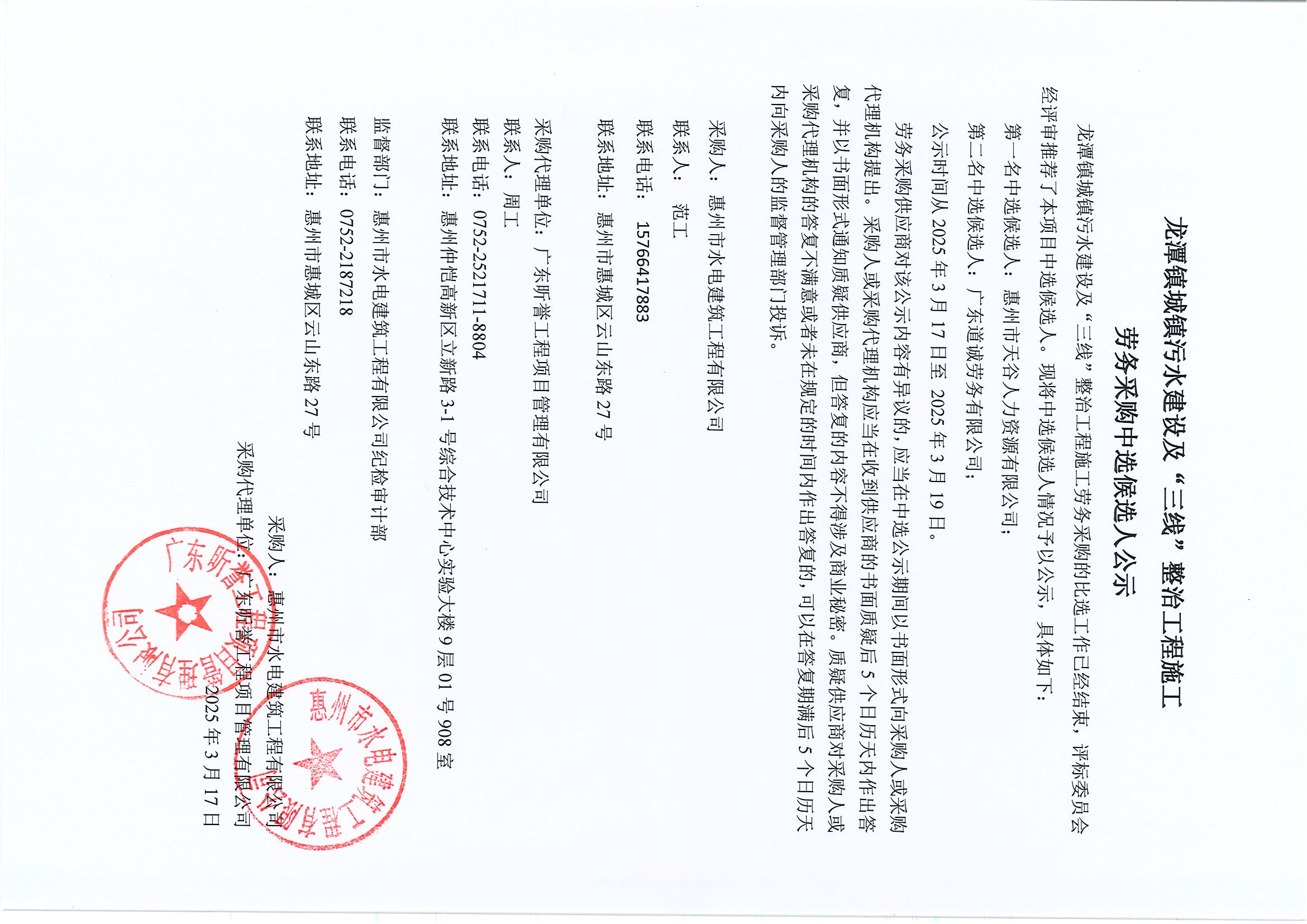 惠東縣新平大道供水管道擴(kuò)容改造工程項(xiàng)目(一期)勘察設(shè)計(jì)采購(gòu)施工總承包(EPC)勞務(wù)采購(gòu)(第二次)中選候選人公示