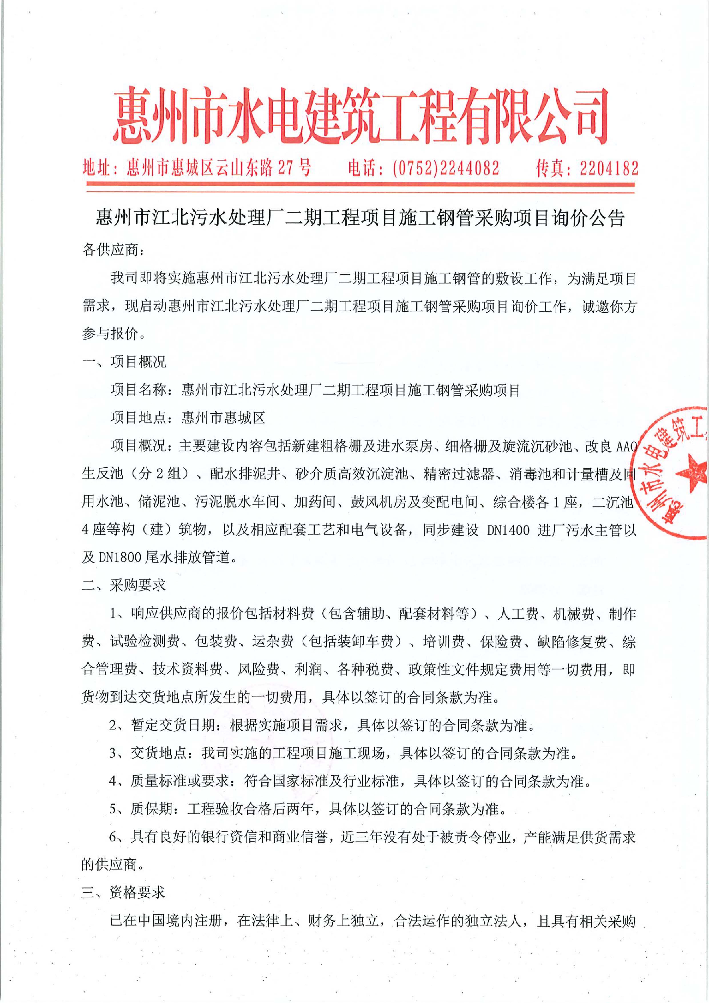 惠州市江北污水處理廠二期工程項目施工鋼管采購項目詢價公告附件: