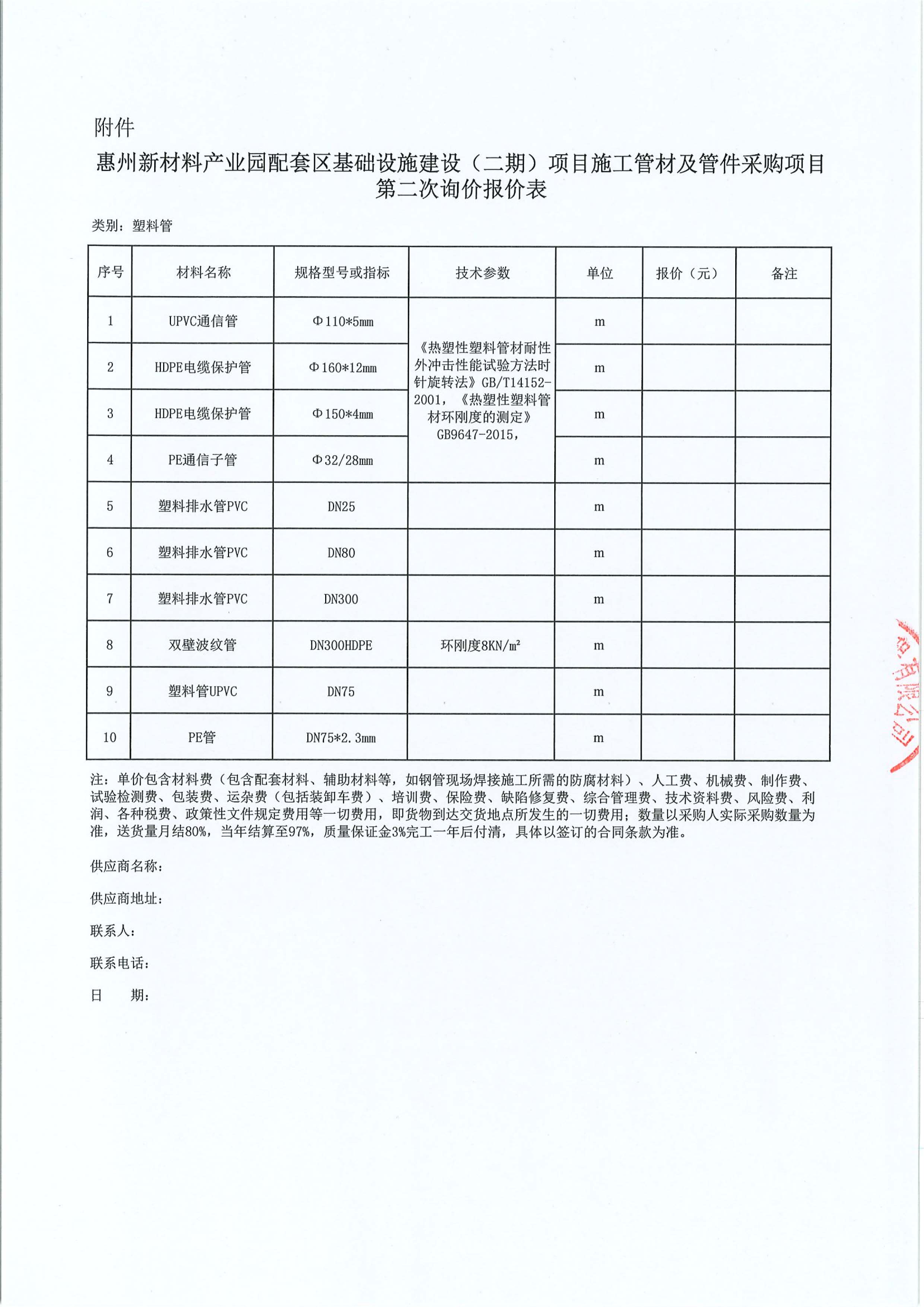 附件:惠州新材料產(chǎn)業(yè)園配套區(qū)基礎(chǔ)設(shè)施建設(shè)(二期)項目施工管材及管件采購項目第二次詢價報價表