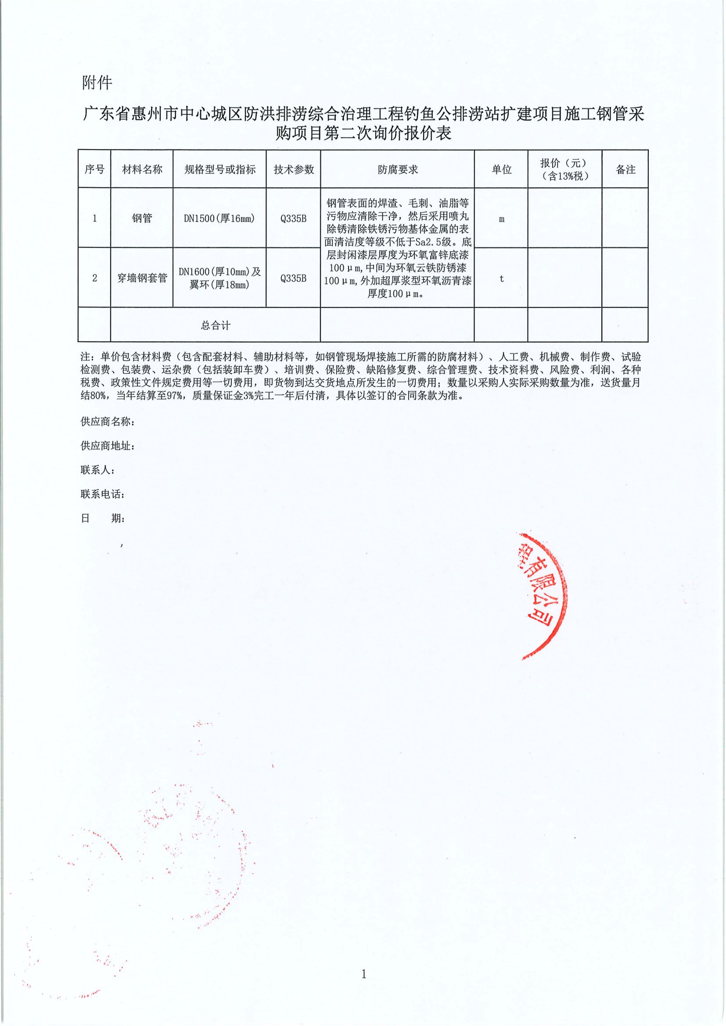廣東省惠州市中心城區(qū)防洪排澇綜合治理工程釣魚(yú)公排澇站擴(kuò)建項(xiàng)目施工鋼管采購(gòu)項(xiàng)目第二次詢價(jià)公告附件: