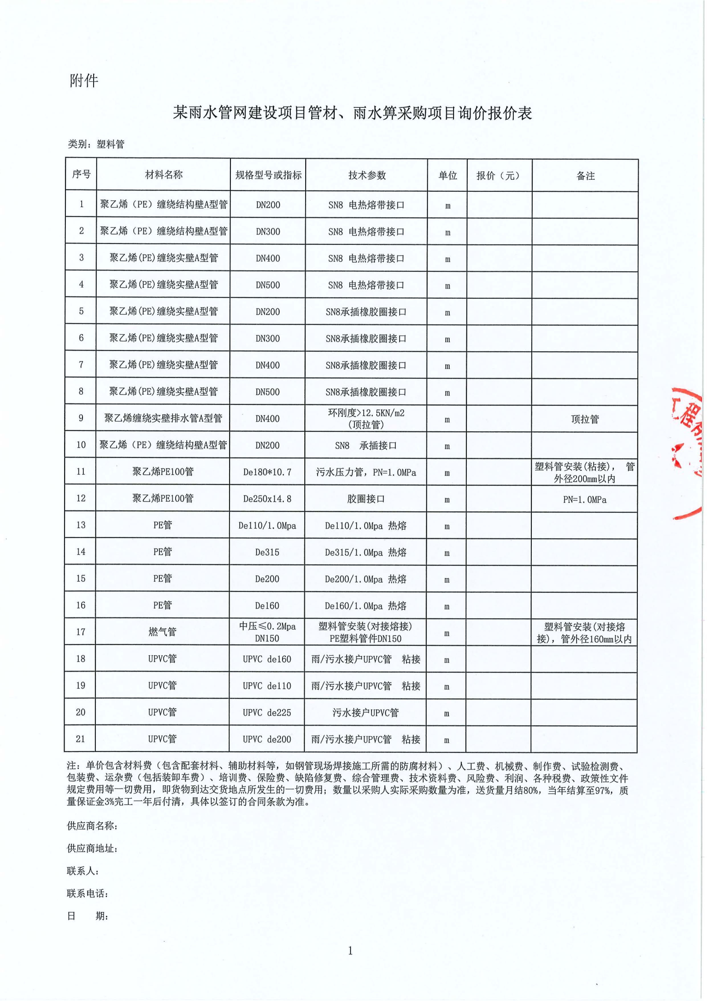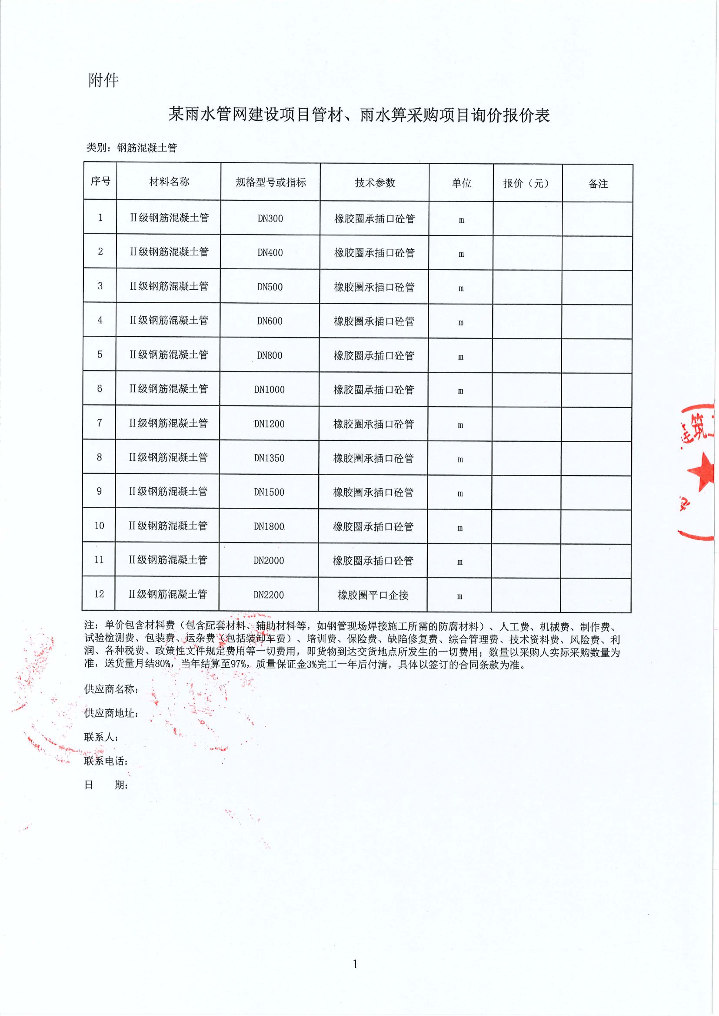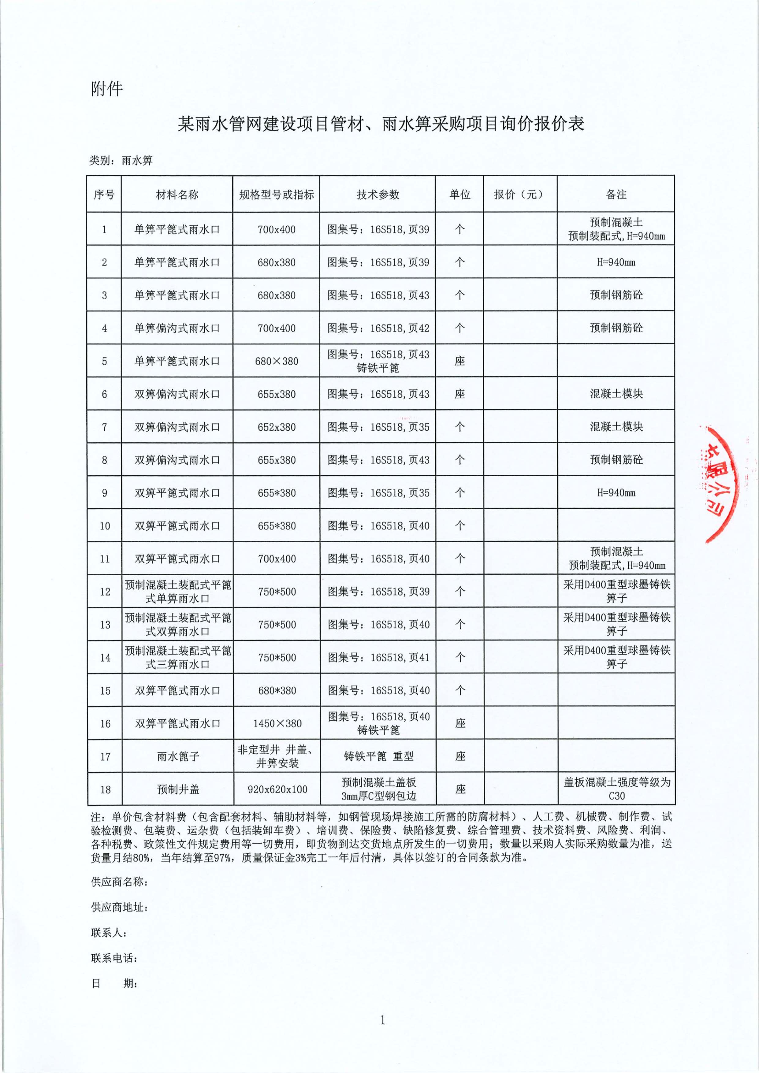 某雨水管網(wǎng)建設(shè)項目管材、雨水箅采購項目詢價公告附件:
