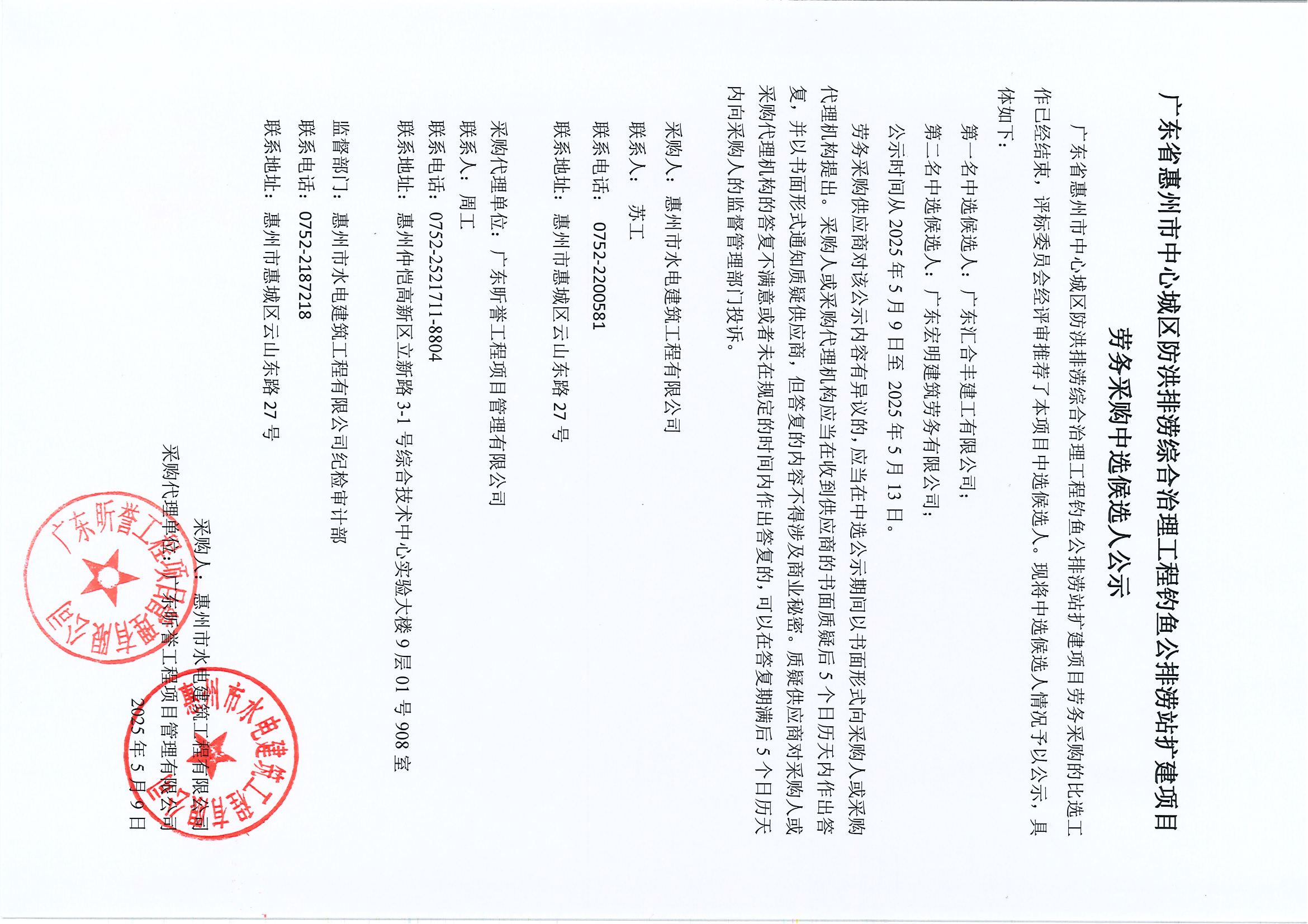 廣東省惠州市中心城區(qū)防洪排澇綜合治理工程釣魚公排澇站擴建項目勞務(wù)采購中選候選人公示
