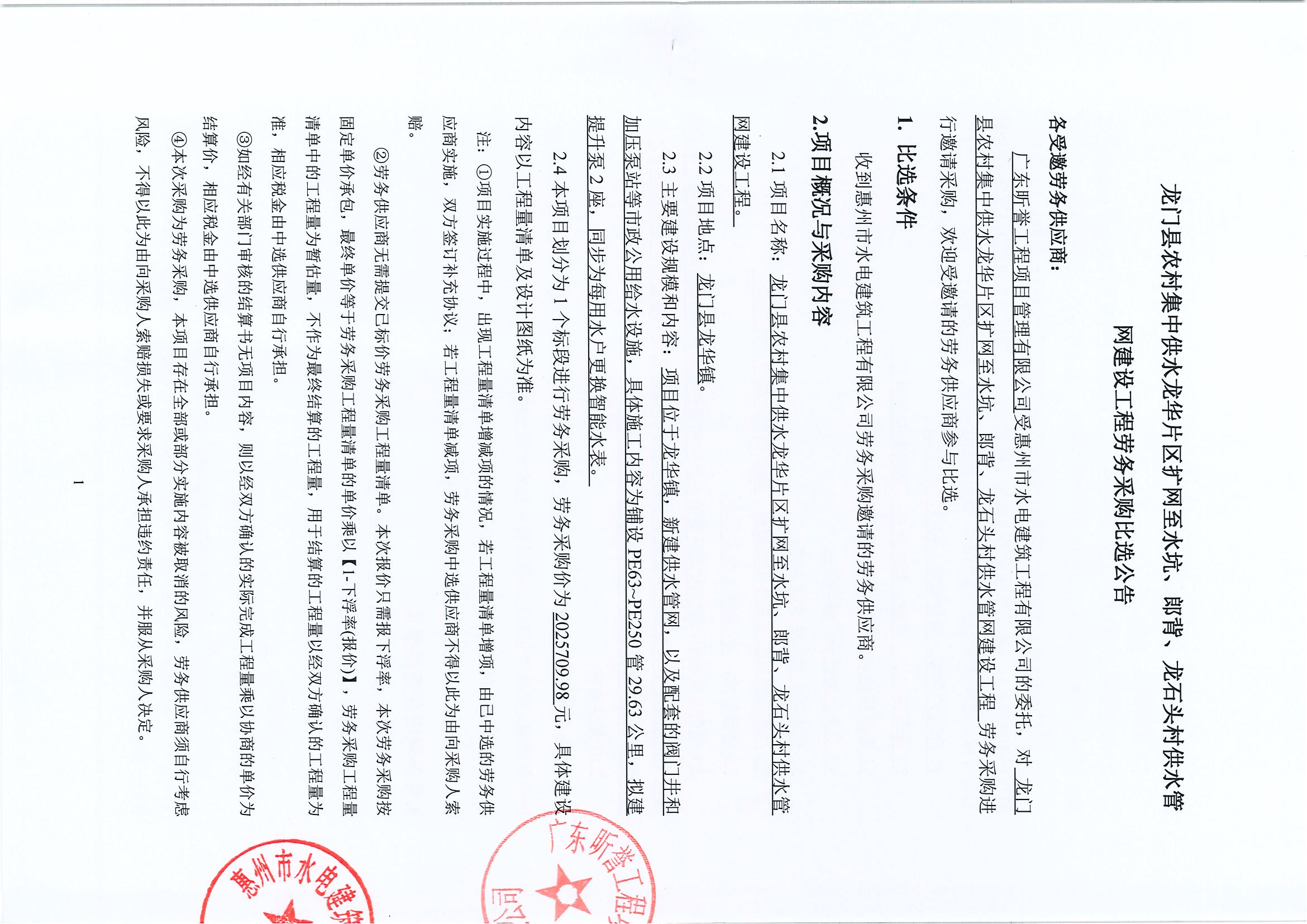 龍門縣農(nóng)村集中供水龍華片區(qū)擴網(wǎng)至水坑、郎背、龍石頭村供水管網(wǎng)建設(shè)工程勞務(wù)采購比選公告