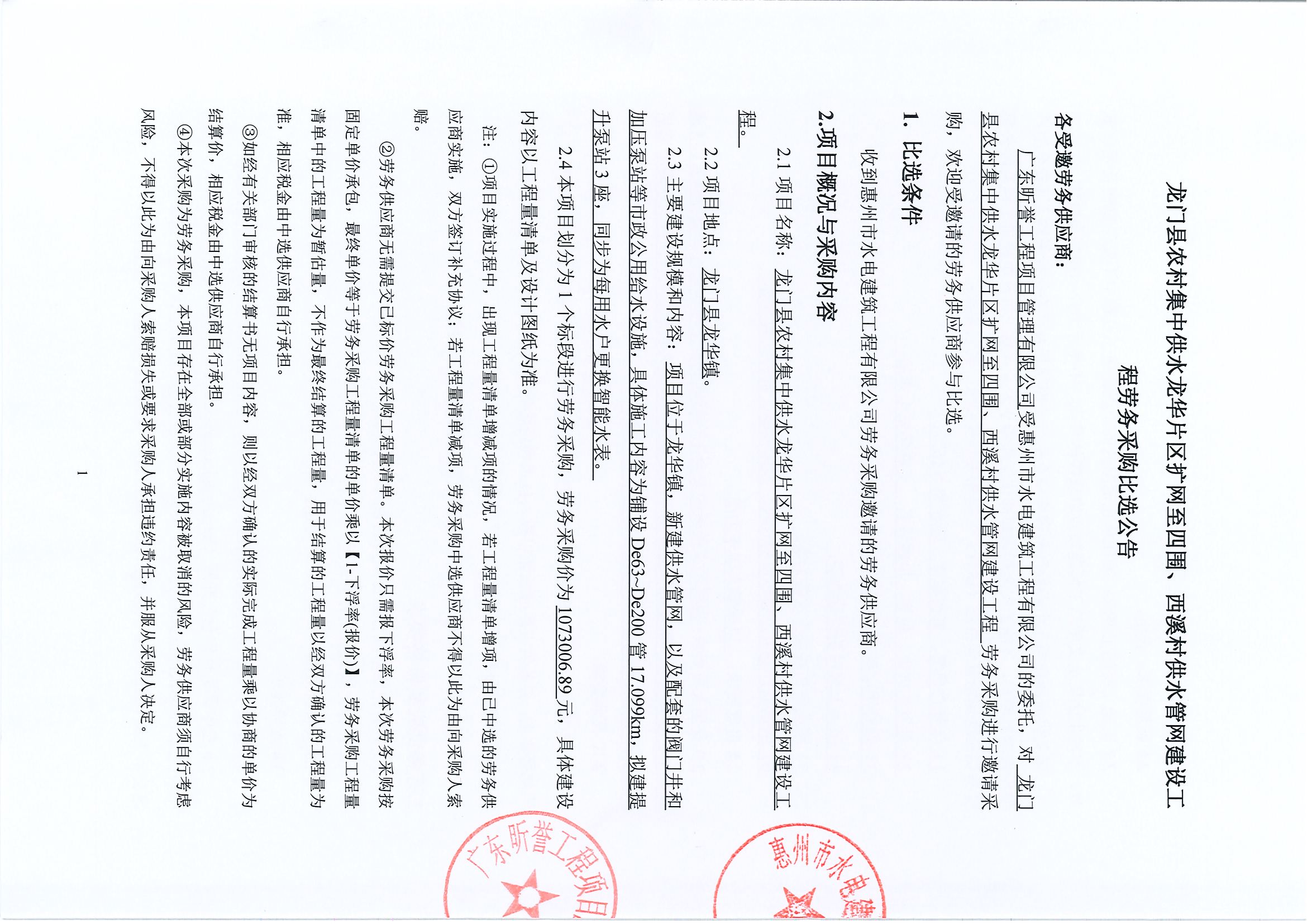 龍門縣農(nóng)村集中供水龍華片區(qū)擴(kuò)網(wǎng)至四圍、西溪村供水管網(wǎng)建設(shè)工程勞務(wù)采購比選公告