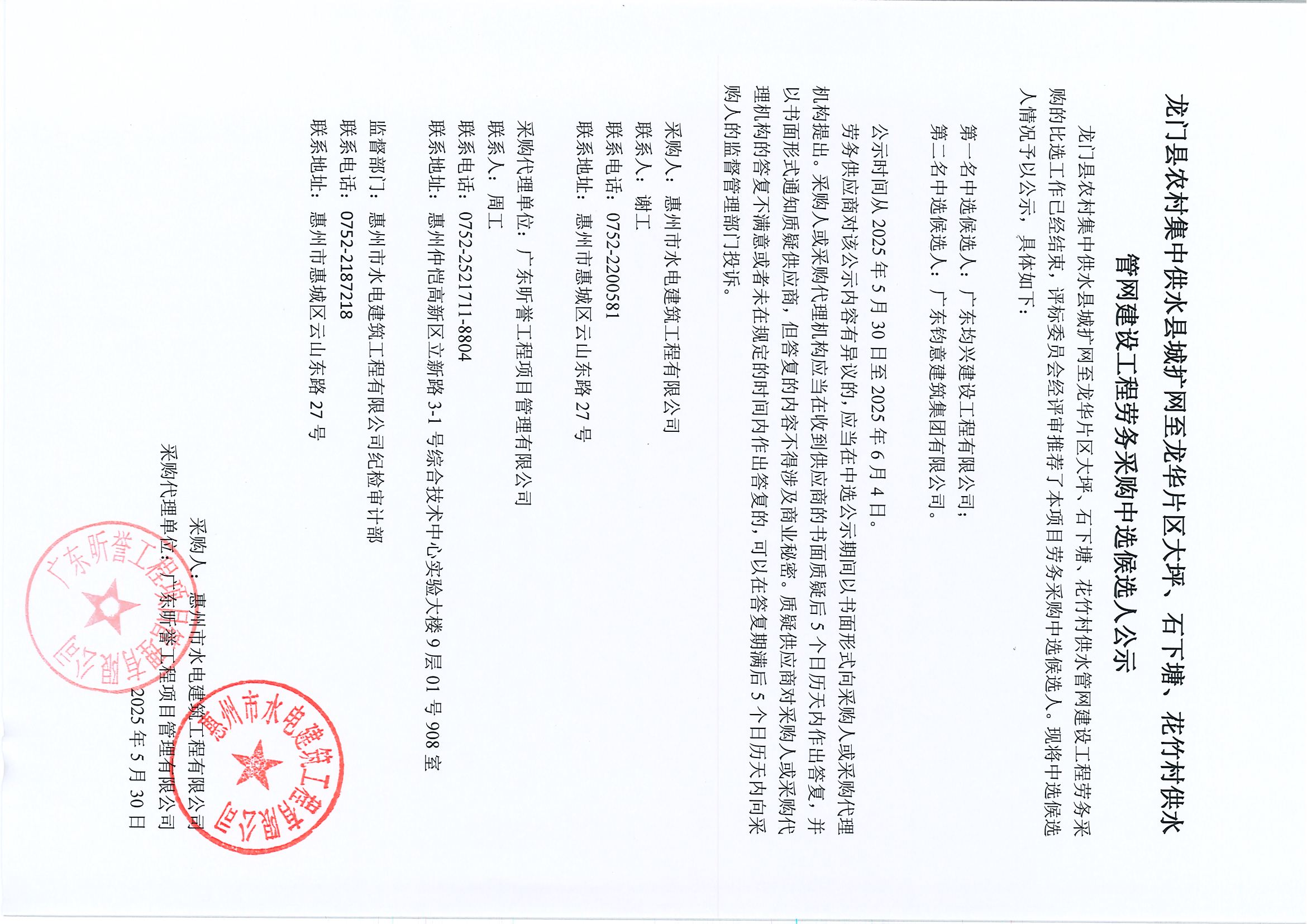 龍門縣農(nóng)村集中供水龍華片區(qū)擴(kuò)網(wǎng)至四圍、西溪村供水管網(wǎng)建設(shè)工程勞務(wù)采購(gòu)中選候選人公示