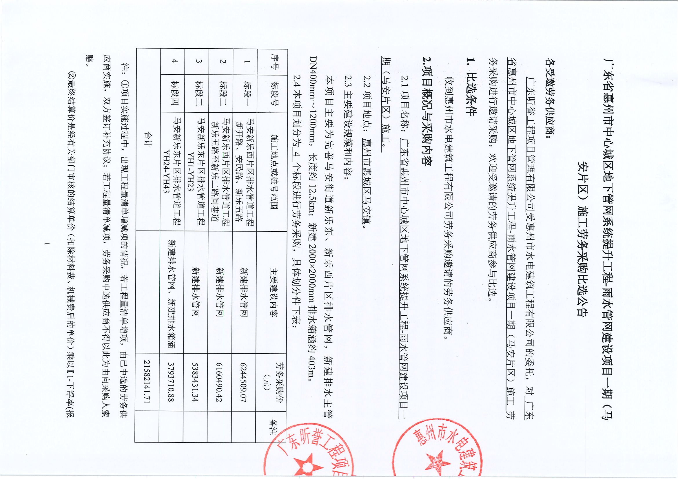 廣東省惠州市中心城區(qū)地下管網(wǎng)系統(tǒng)提升工程-雨水管網(wǎng)建設項目一期(馬安片區(qū))施工勞務采購比選公告