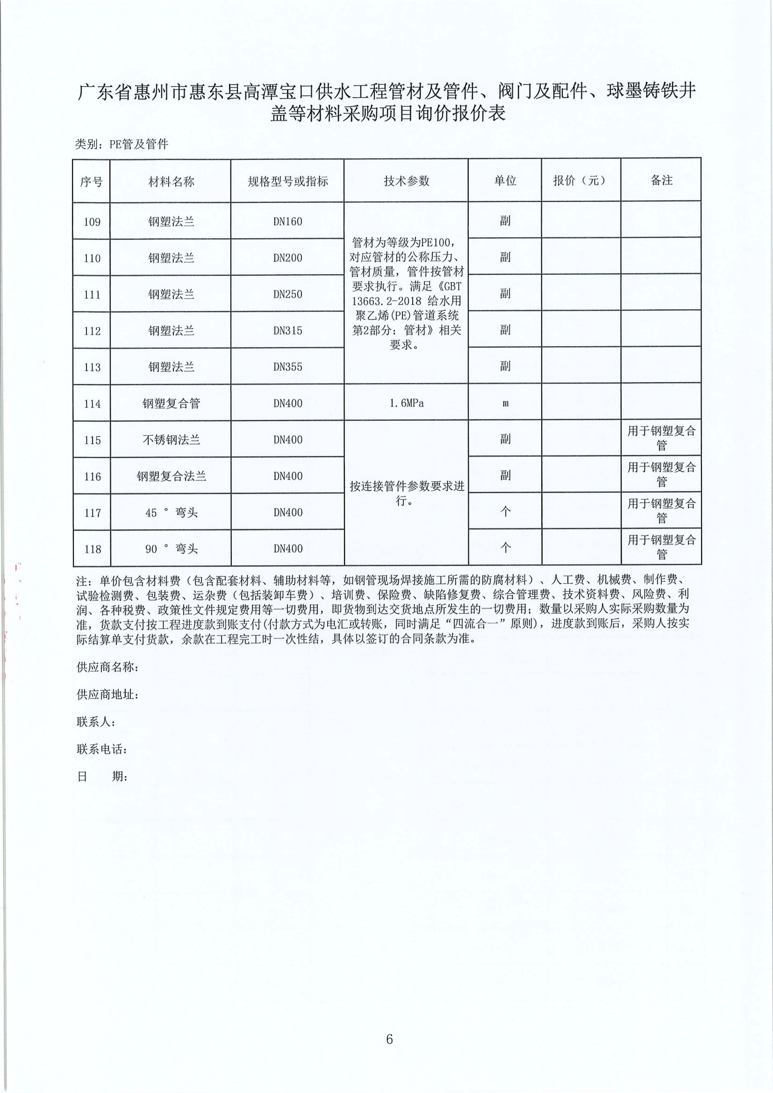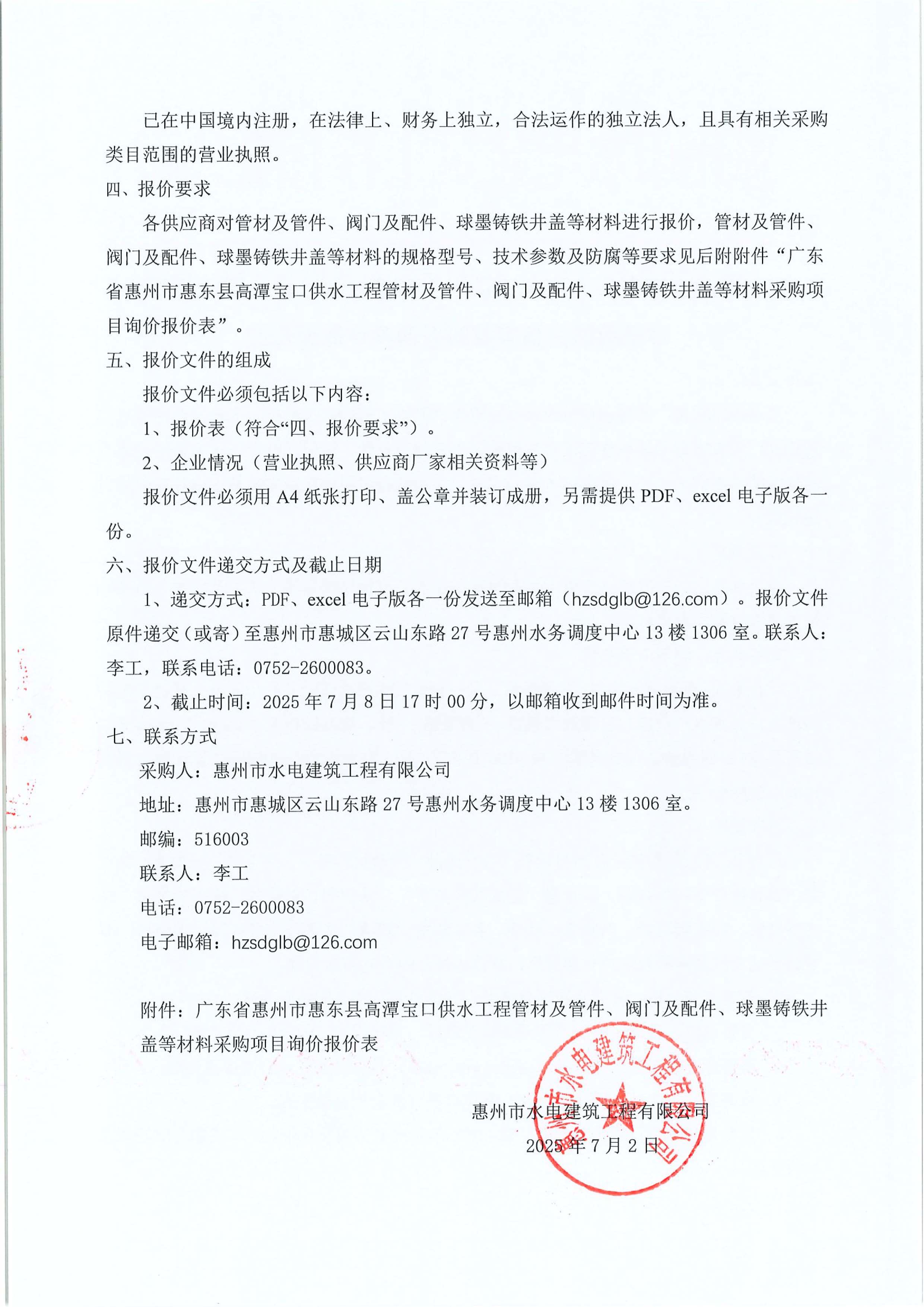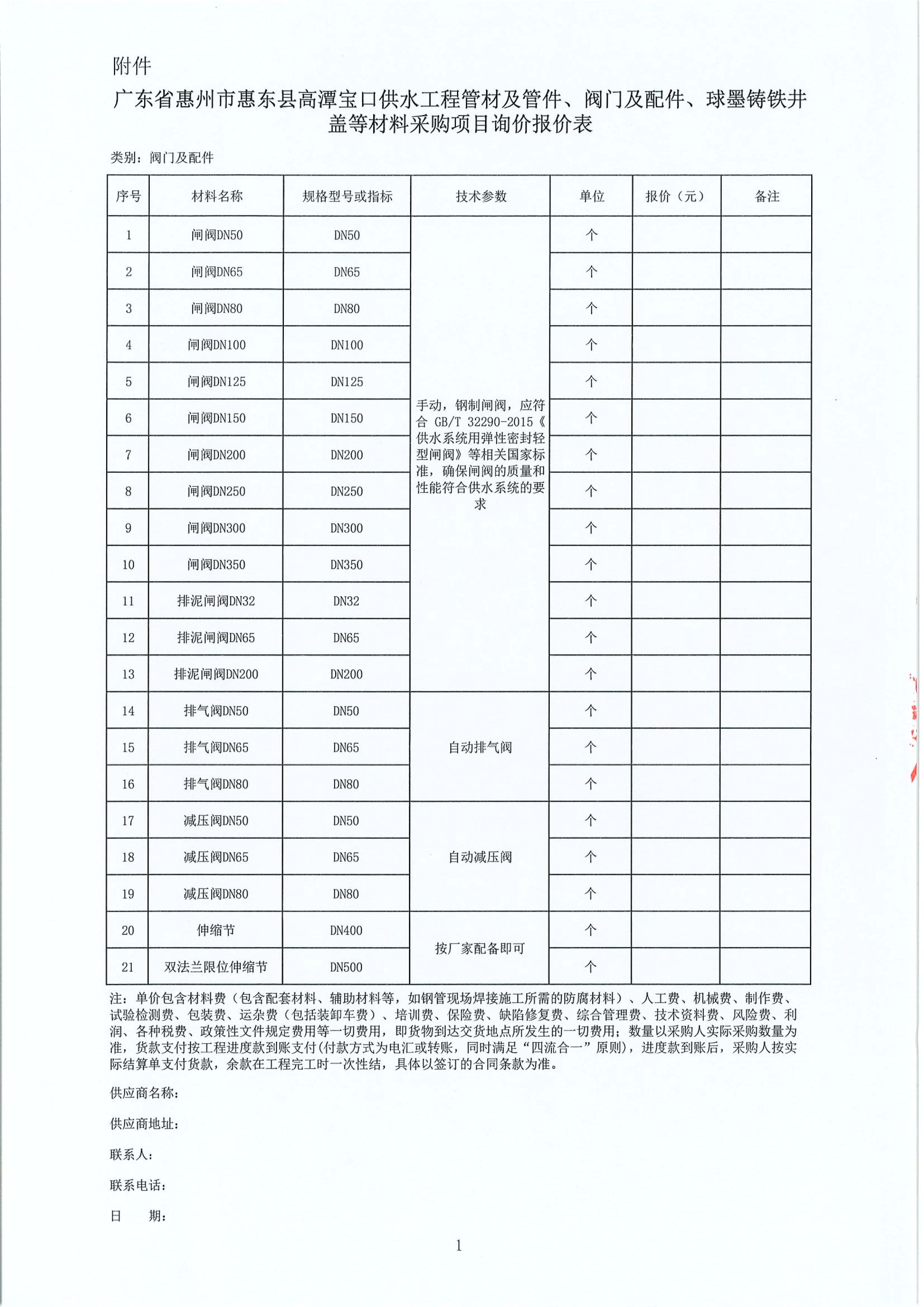 廣東省惠州市惠東縣高潭寶口供水工程施工管材及管件、閥門及配件、球墨鑄鐵井蓋等材料采購項(xiàng)目詢價(jià)公告