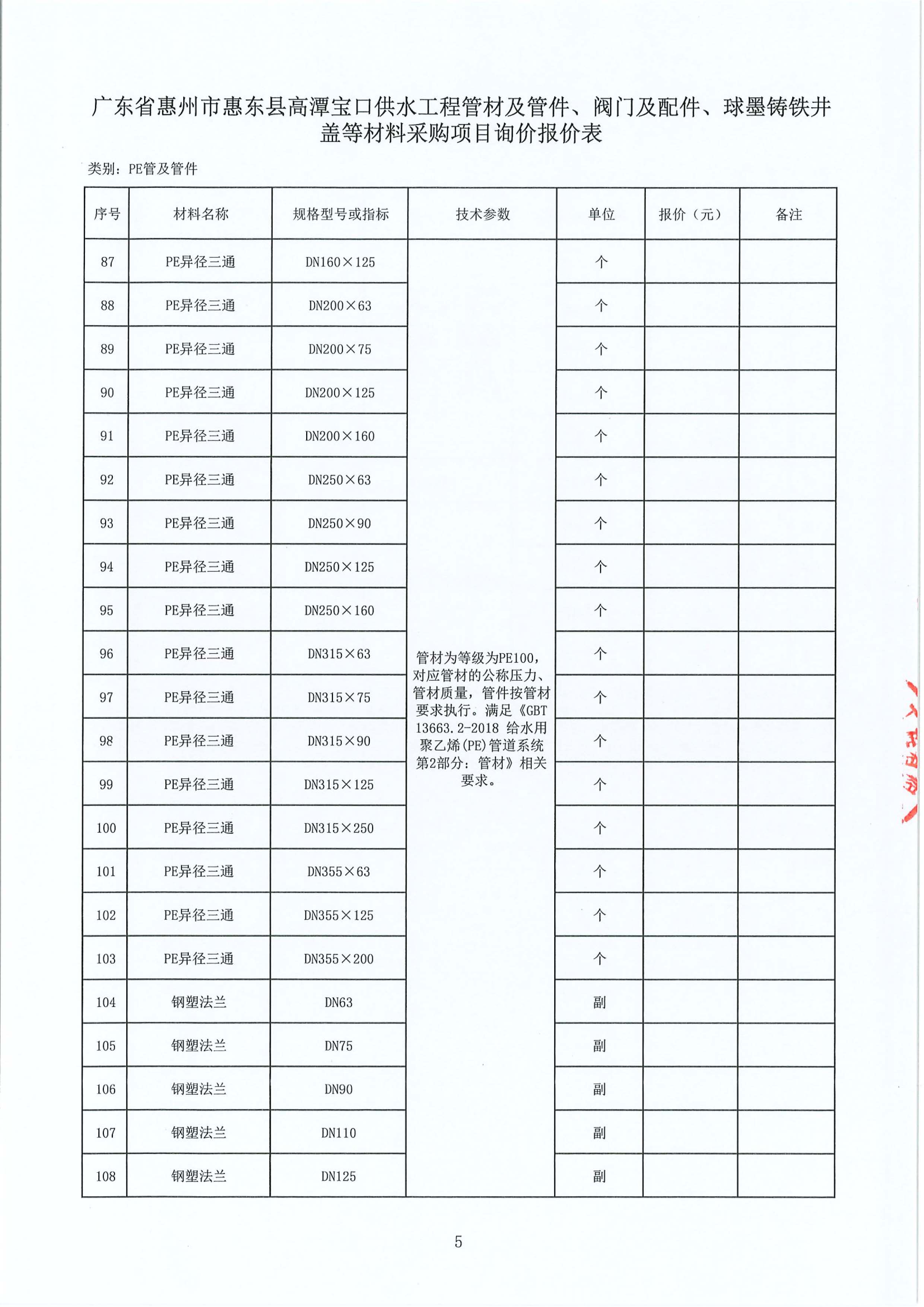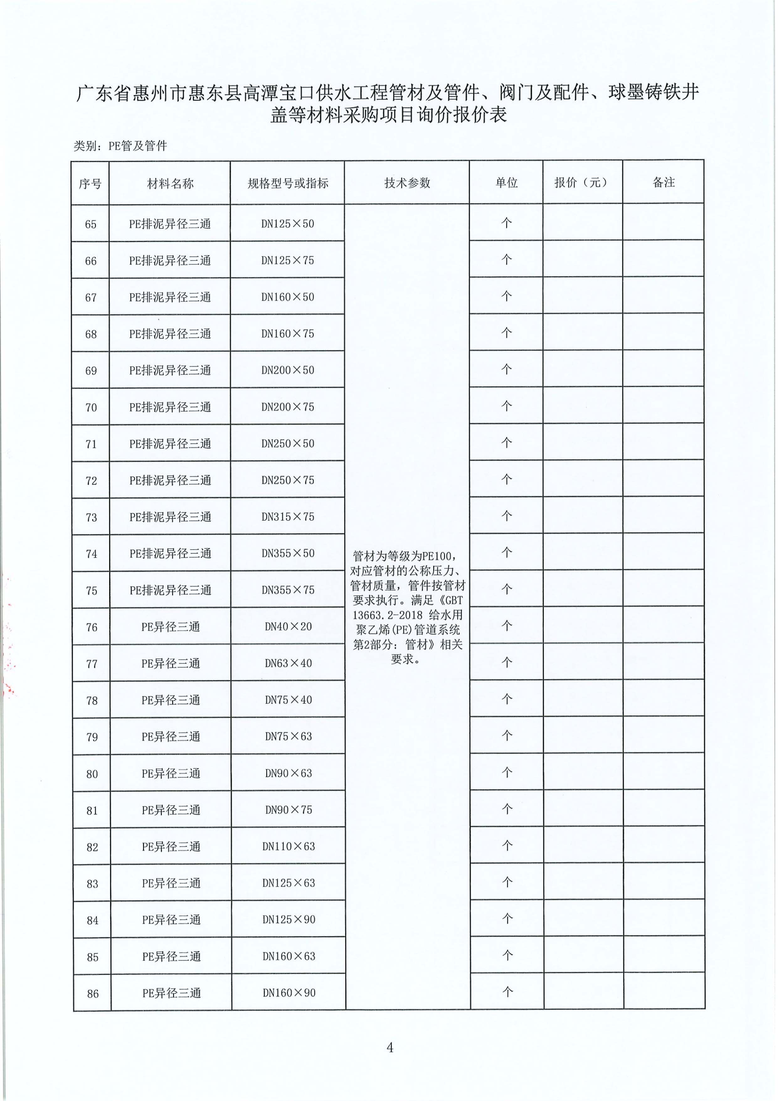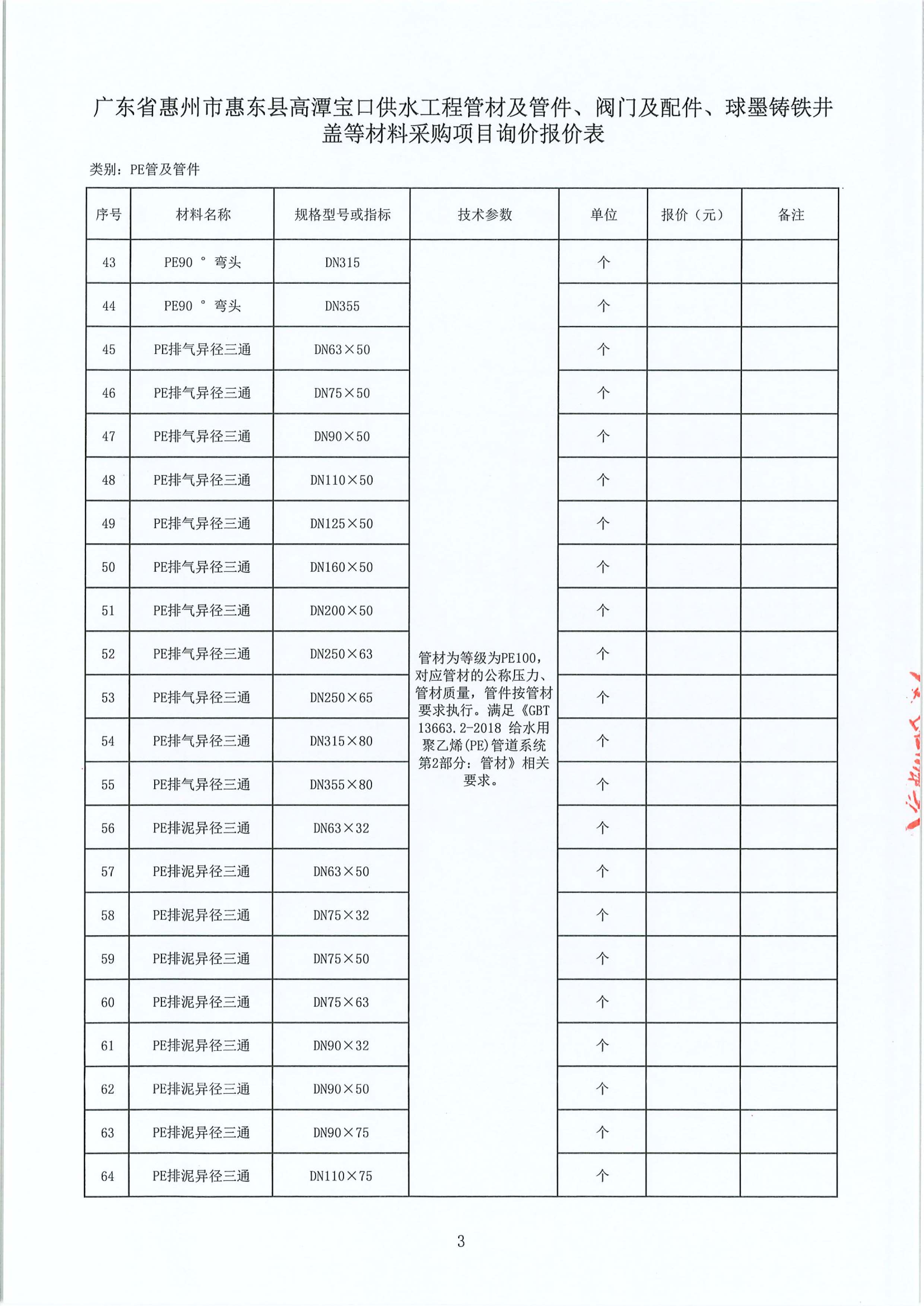 廣東省惠州市惠東縣高潭寶口供水工程施工管材及管件、閥門及配件、球墨鑄鐵井蓋等材料采購項(xiàng)目詢價(jià)公告