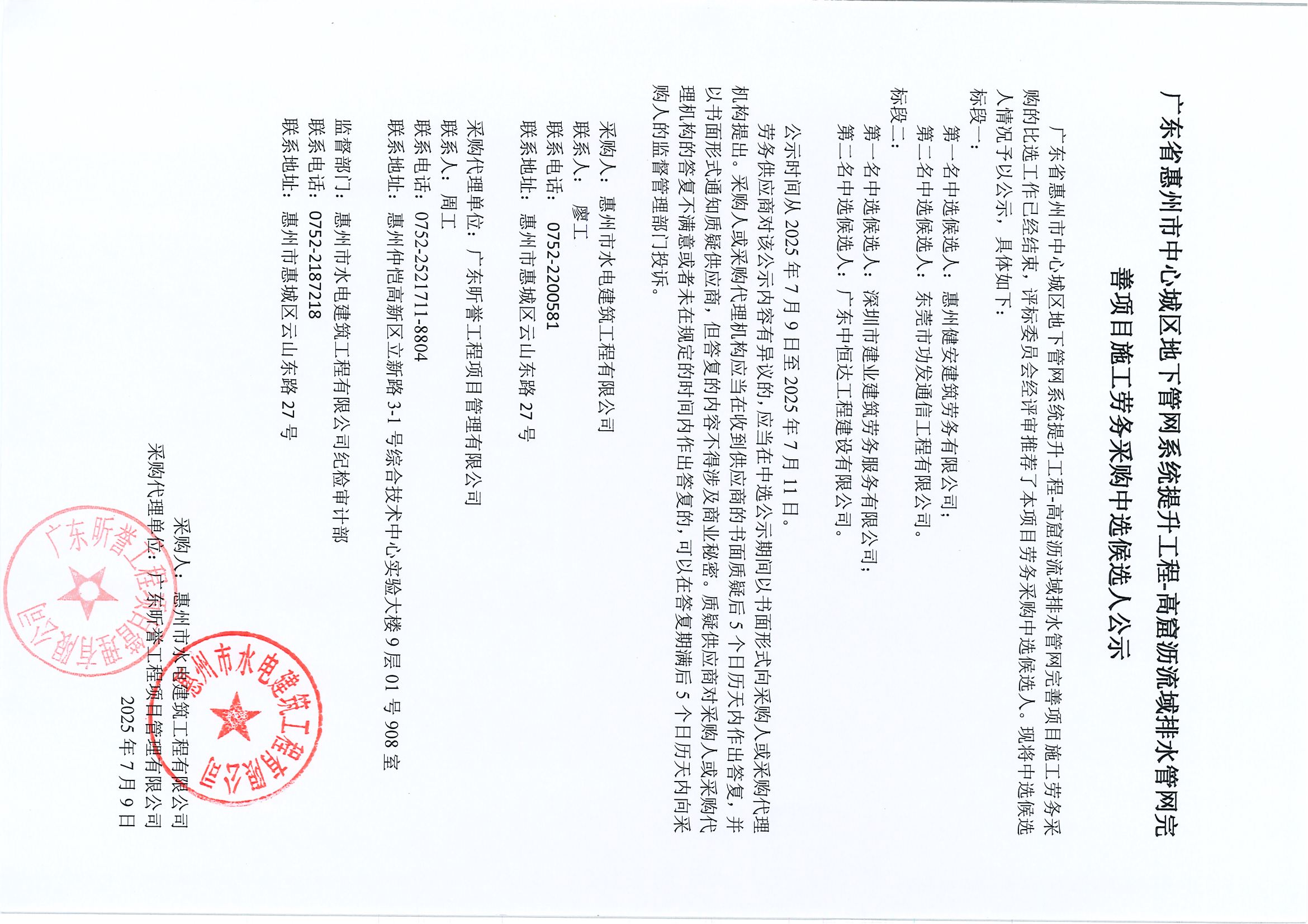 廣東省惠州市中心城區(qū)地下管網(wǎng)系統(tǒng)提升工程-高窟瀝流域排水管網(wǎng)完善項(xiàng)目施工勞務(wù)采購(gòu)中選候選人公示