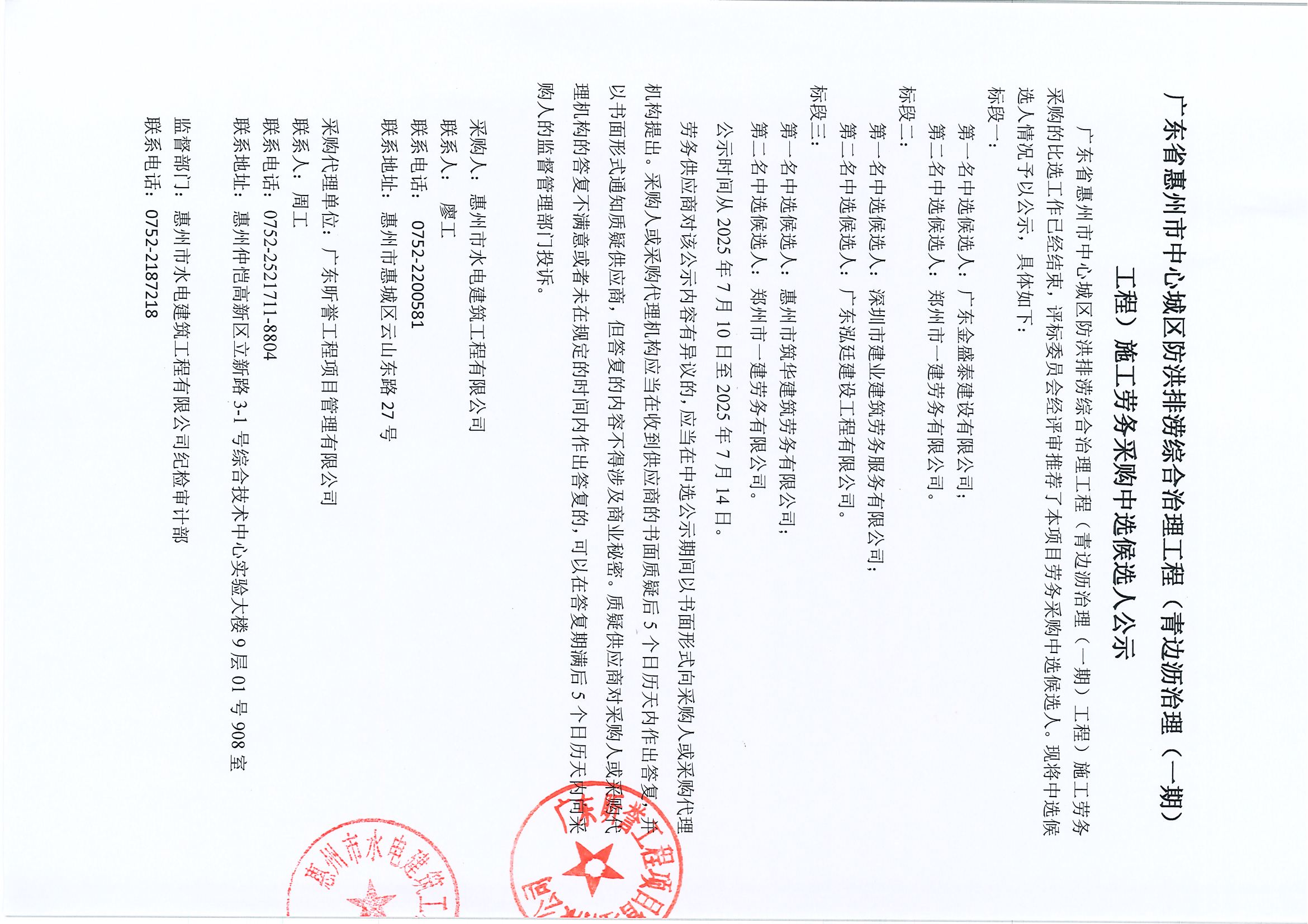 廣東省惠州市中心城區(qū)防洪排澇綜合治理工程(青邊瀝治理(一期)工程)施工勞務(wù)采購(gòu)中選候選人公示