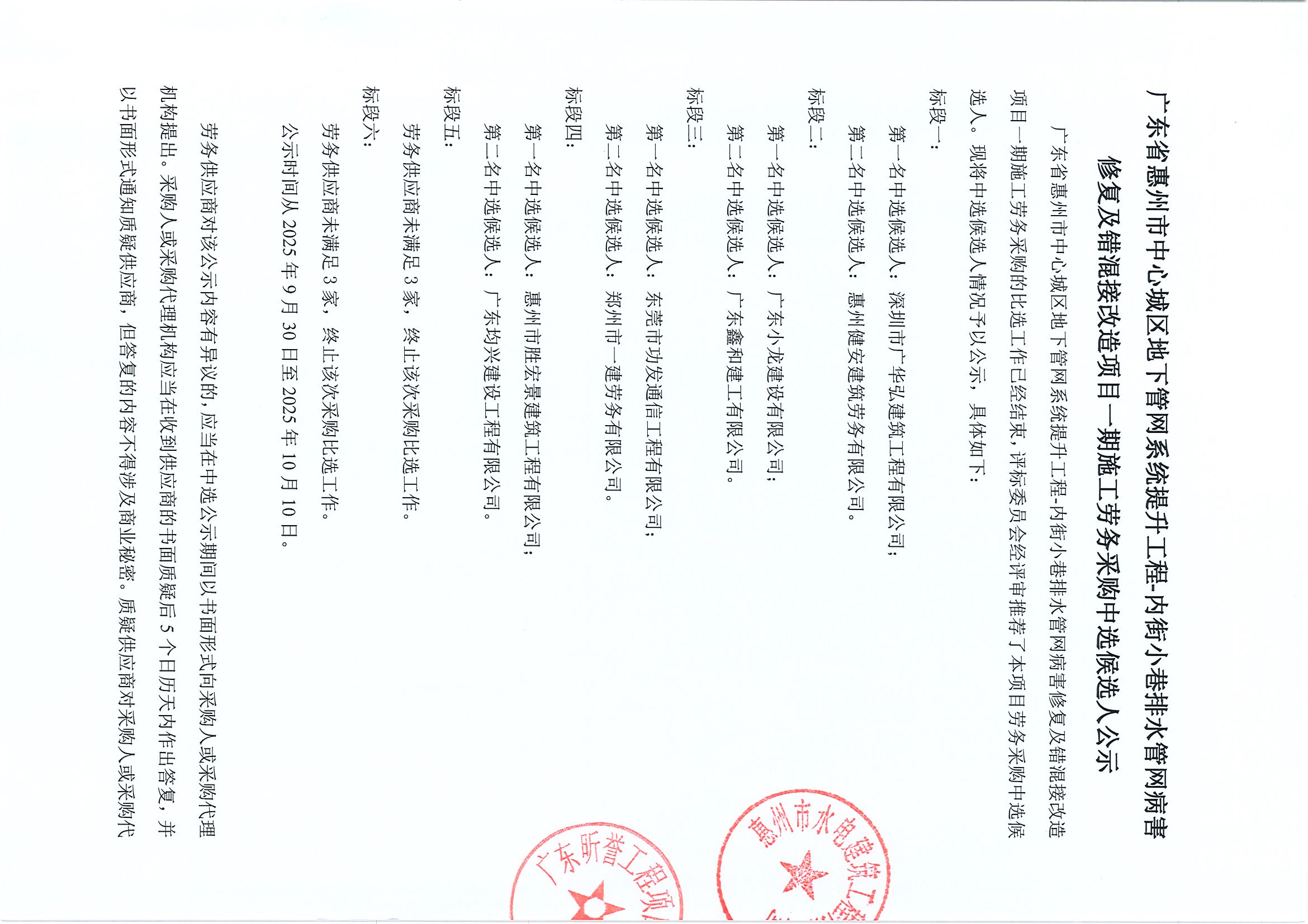 廣東省惠州市中心城區(qū)地下管網(wǎng)系統(tǒng)提升工程-內(nèi)街小巷排水管網(wǎng)病害修復(fù)及錯(cuò)混接改造項(xiàng)目一期施工勞務(wù)采購(gòu)中選候選人公示