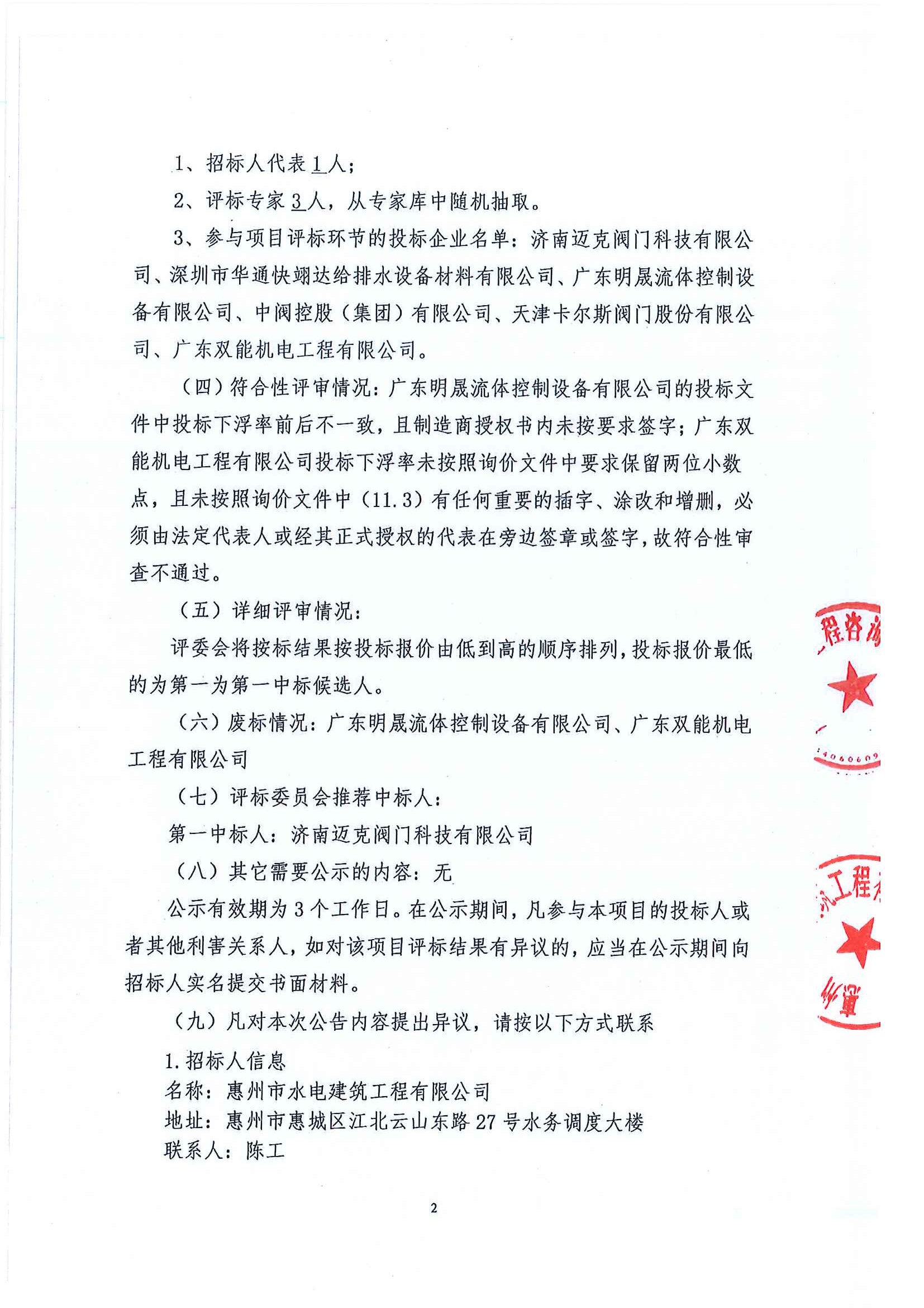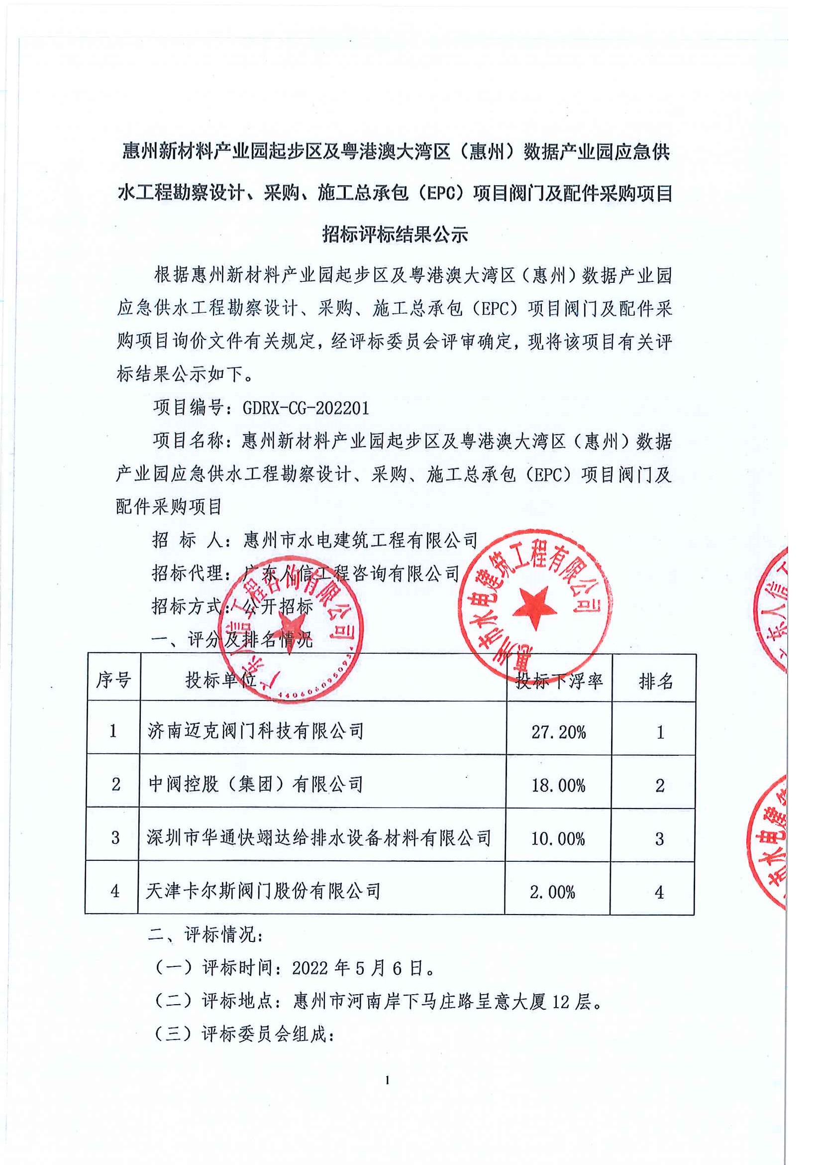 惠州新材料產業(yè)園起步區(qū)及粵港澳大灣區(qū)(惠州)數(shù)據(jù)產業(yè)園應急供水工程勘察設計、采購、施工總承包(EPC)項目閥門及配件采購項目招標評標結果公示