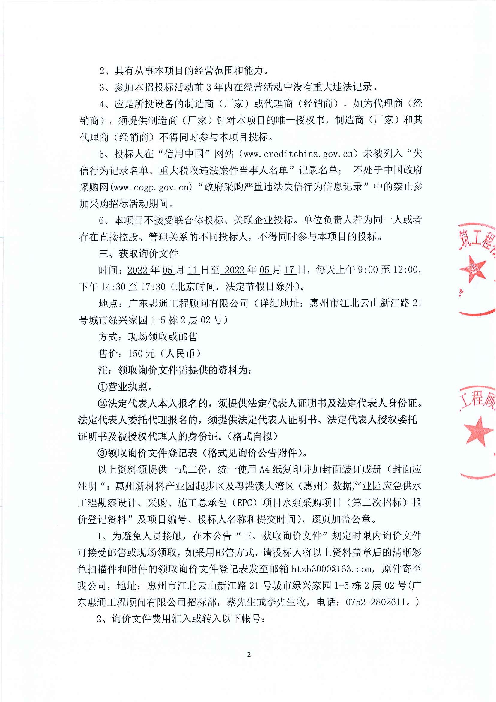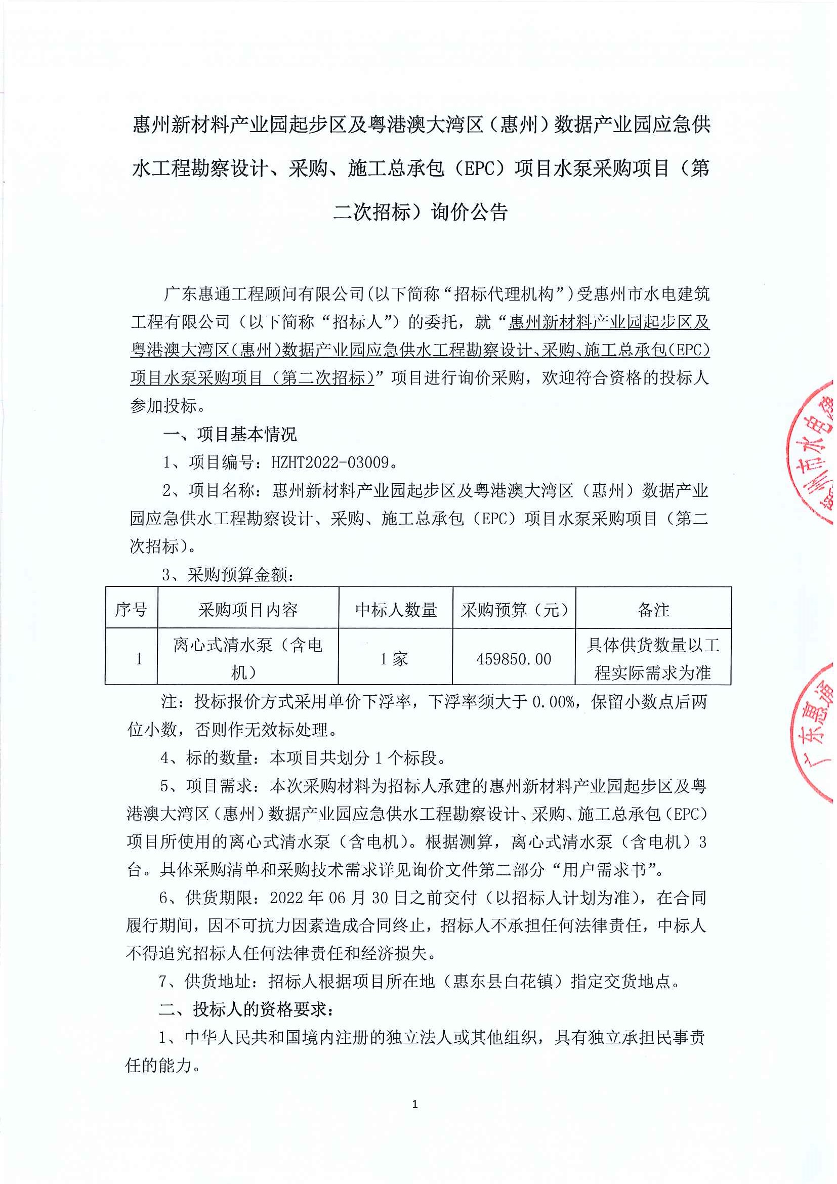 附件1:惠州新材料產(chǎn)業(yè)園起步區(qū)及粵港澳大灣區(qū)(惠州)數(shù)據(jù)產(chǎn)業(yè)園應(yīng)急供水工程勘察設(shè)計、采購、施工總承包(EPC)項目水泵采購項目(第二次招標(biāo))詢價文件
