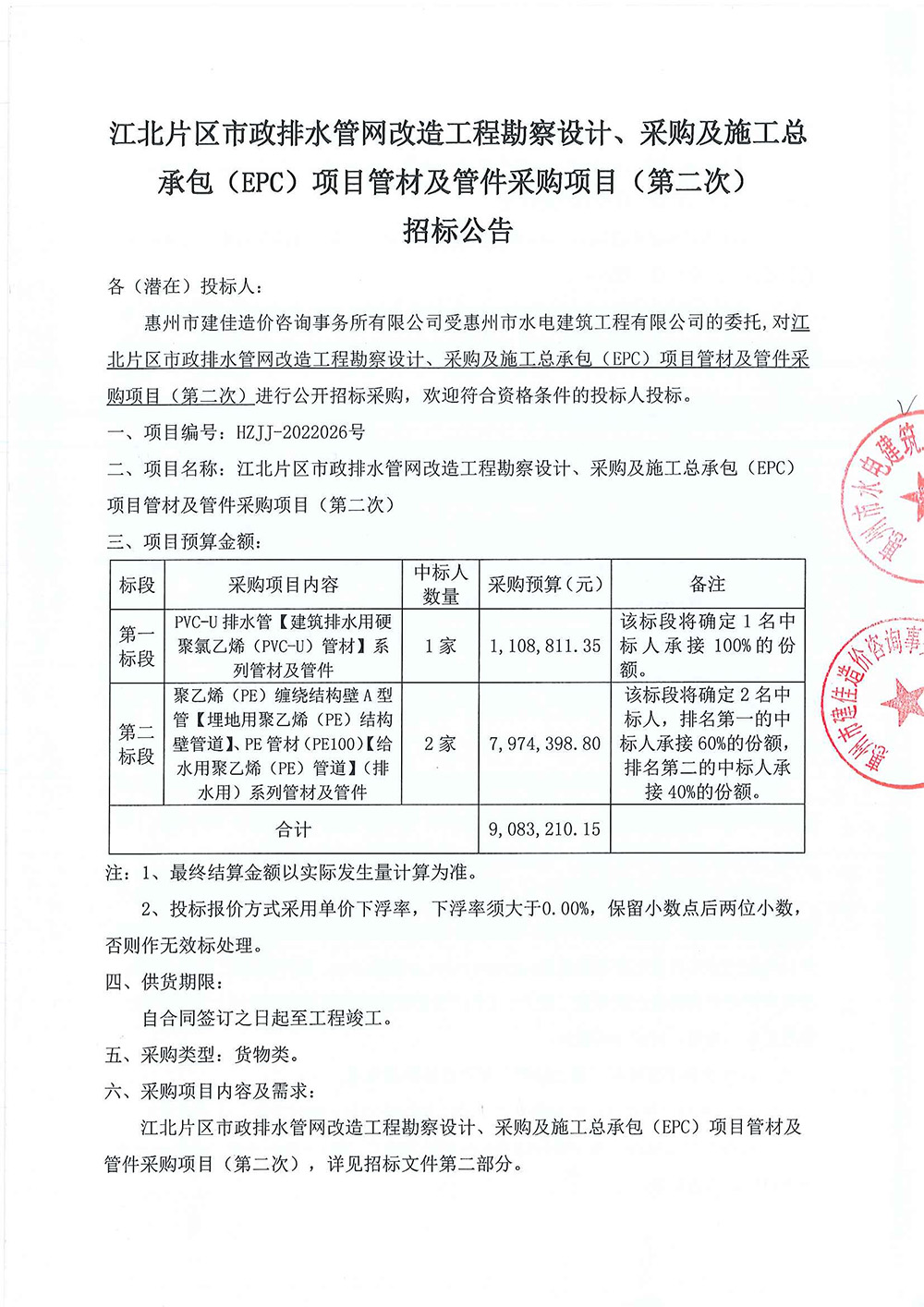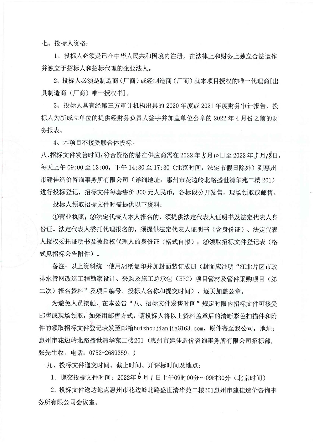 江北片區(qū)市政排水管網(wǎng)改造工程勘察設(shè)計(jì)、采購及施工總承包(EPC)項(xiàng)目管材及管件采購項(xiàng)目(第二次)招標(biāo)公告