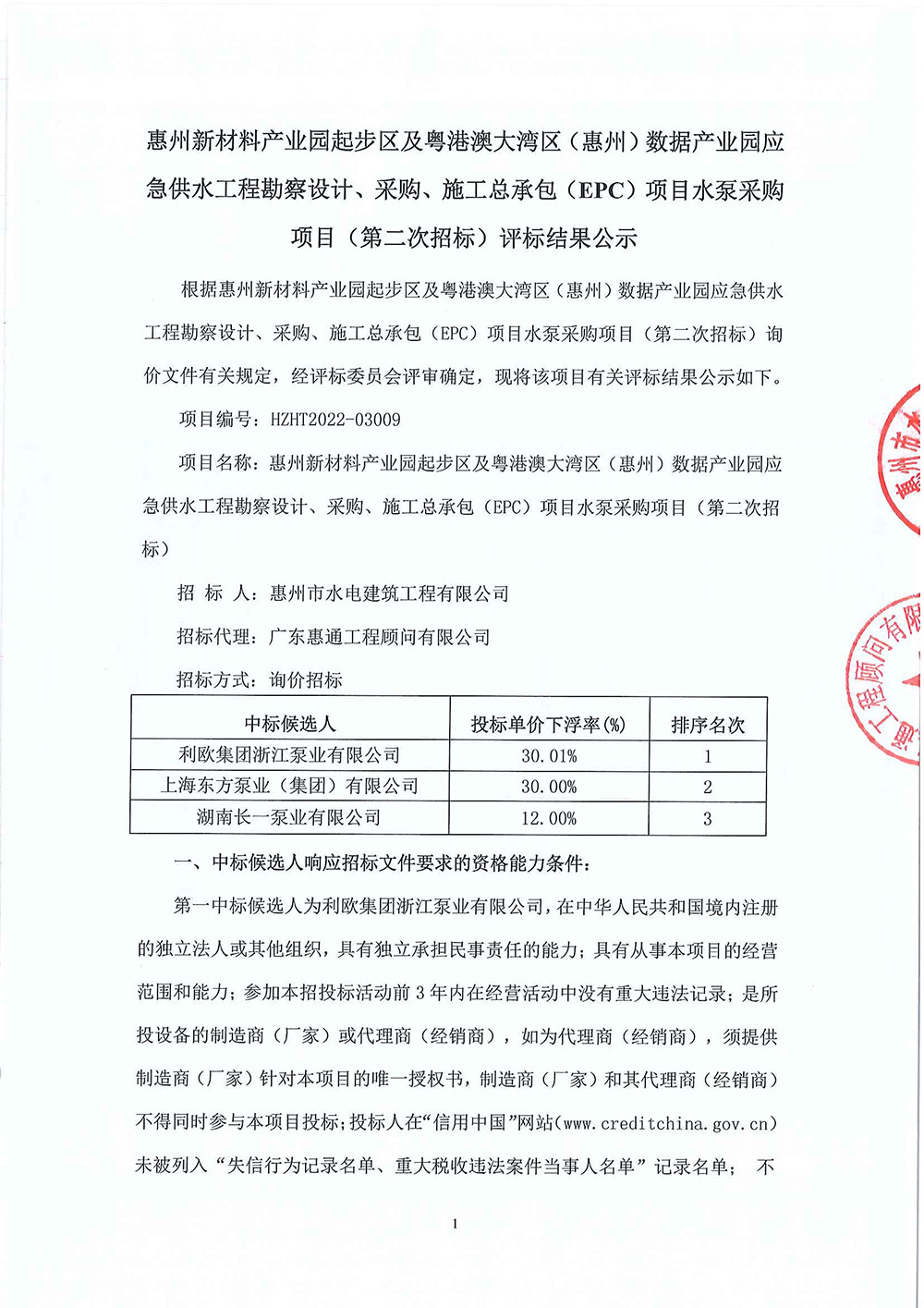 惠州新材料產(chǎn)業(yè)園起步區(qū)及粵港澳大灣區(qū)(惠州)數(shù)據(jù)產(chǎn)業(yè)園應(yīng)急供水工程勘察設(shè)計(jì)、采購(gòu)、施工總承包(EPC)項(xiàng)目水泵采購(gòu)項(xiàng)目(第二次招標(biāo))評(píng)標(biāo)結(jié)果公示