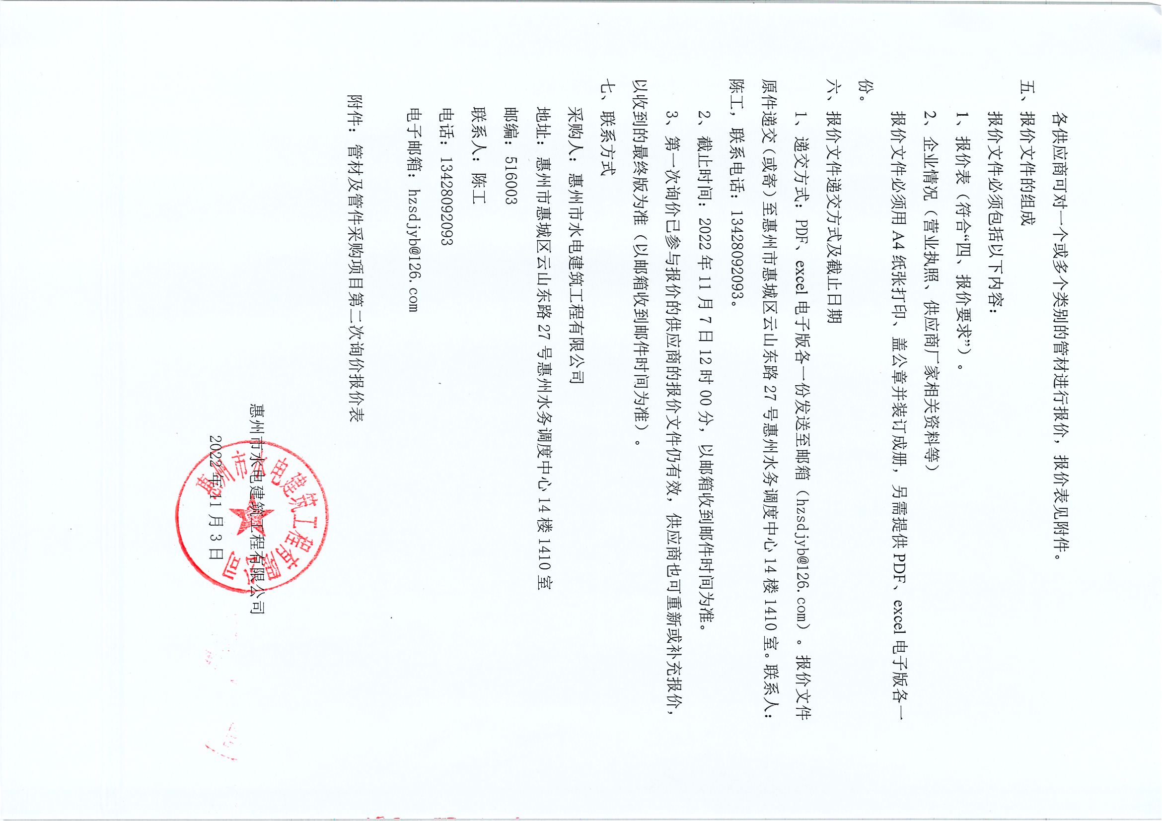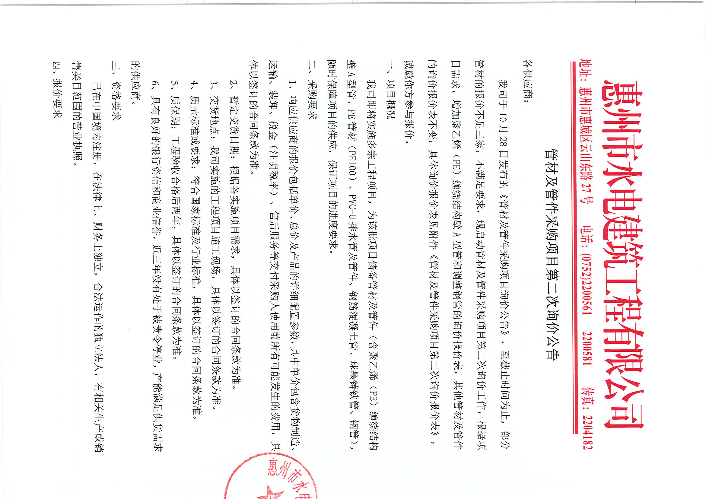 管材及管件采購(gòu)項(xiàng)目第二次詢價(jià)公告