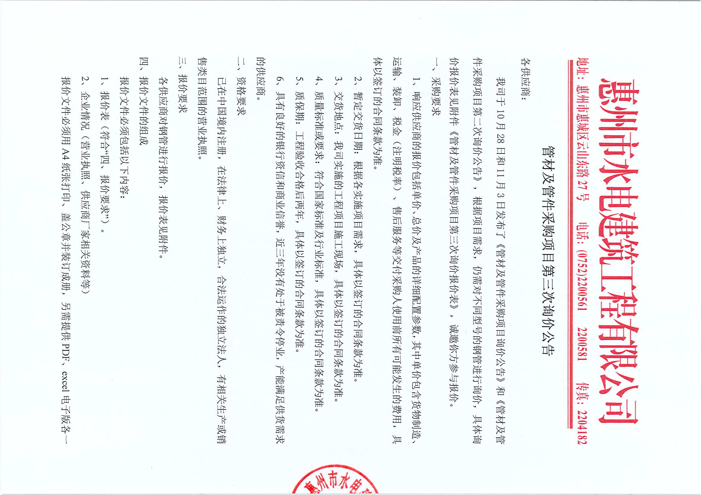 管材及管件采購(gòu)項(xiàng)目第三次詢價(jià)公告