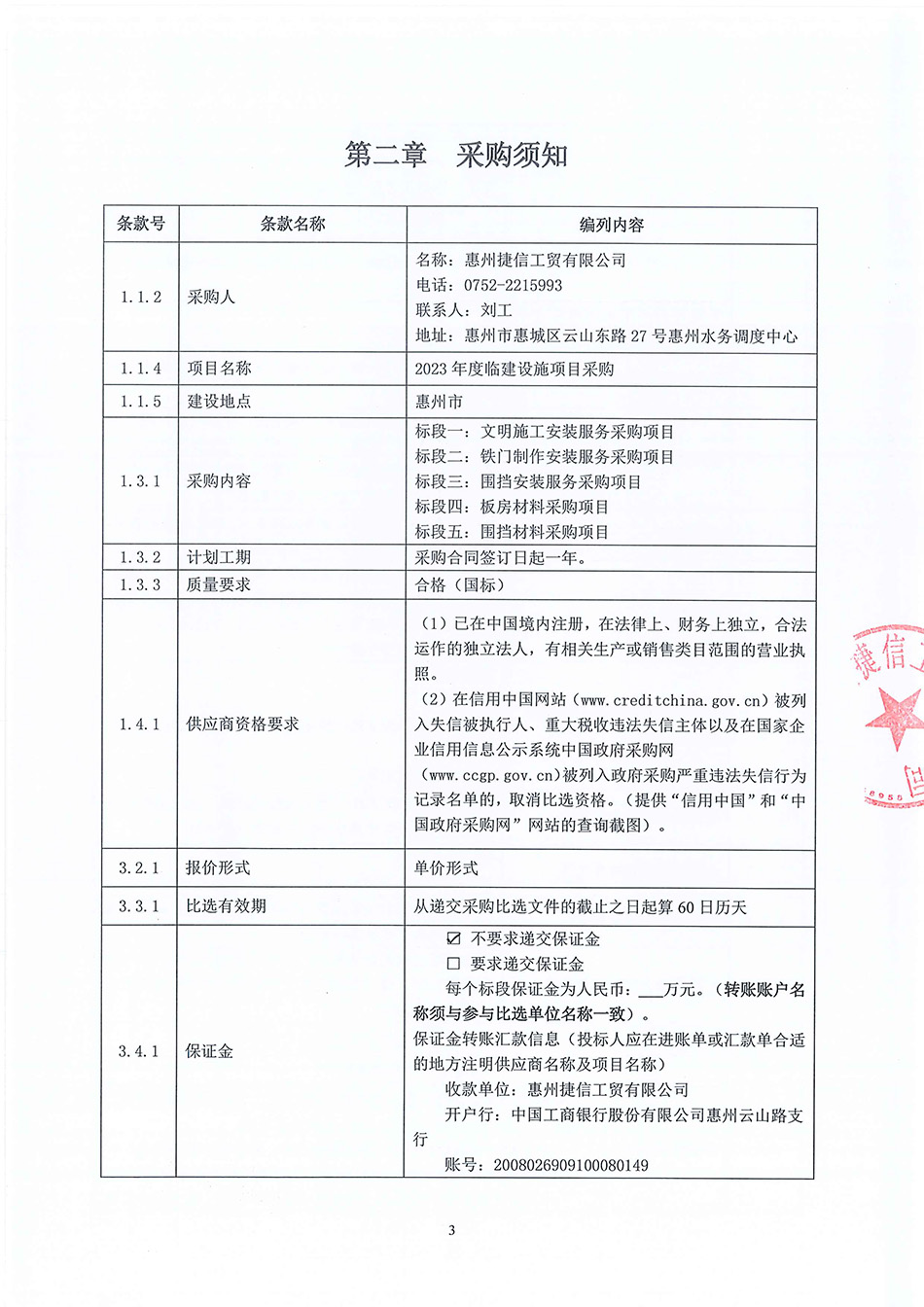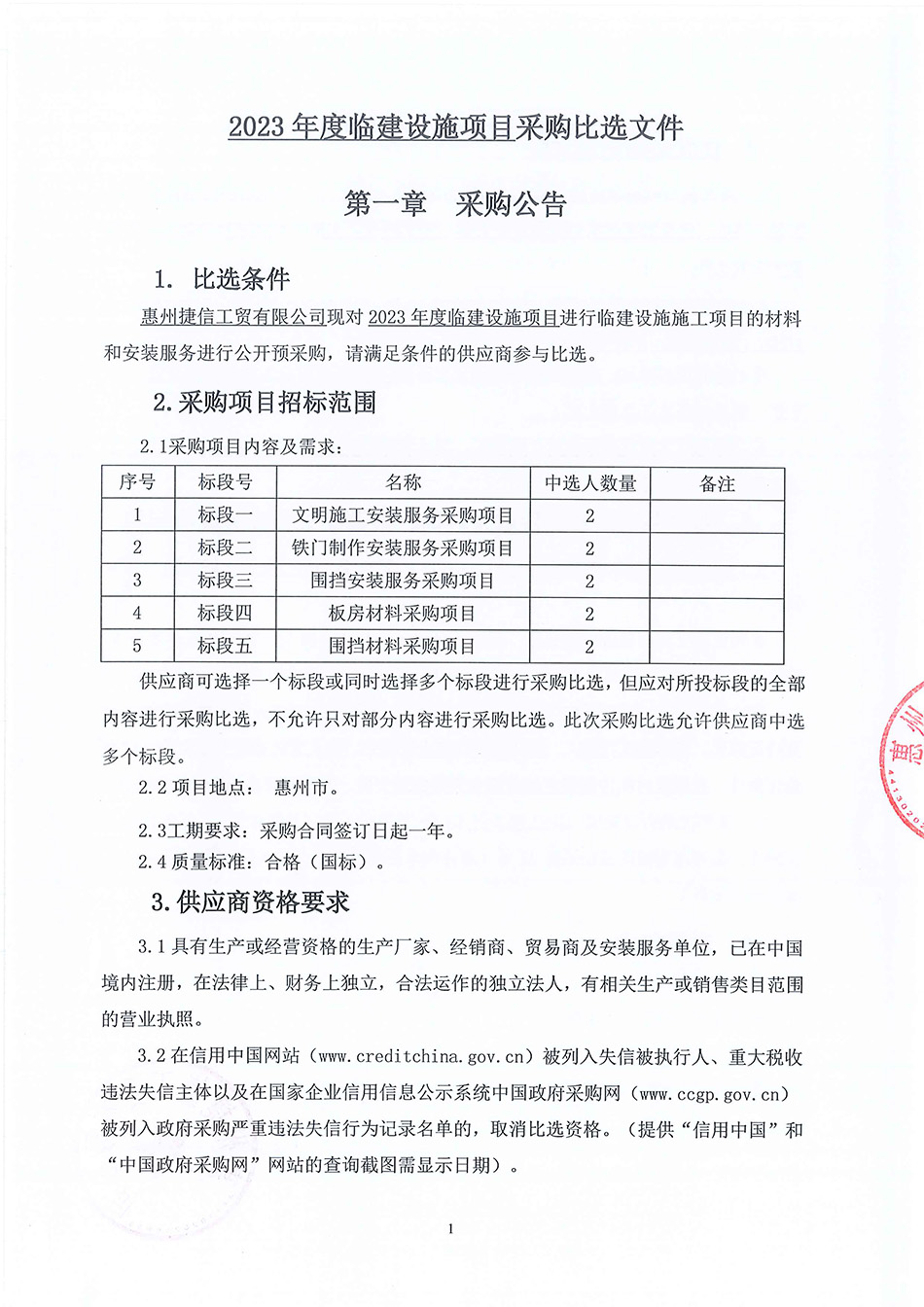 惠州捷信工貿(mào)公司2023年度臨建設(shè)施項(xiàng)目采購(gòu)公告
