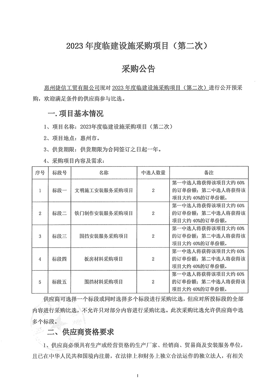 捷信工貿(mào)公司2023年度臨建設施采購項目(第二次)采購公告