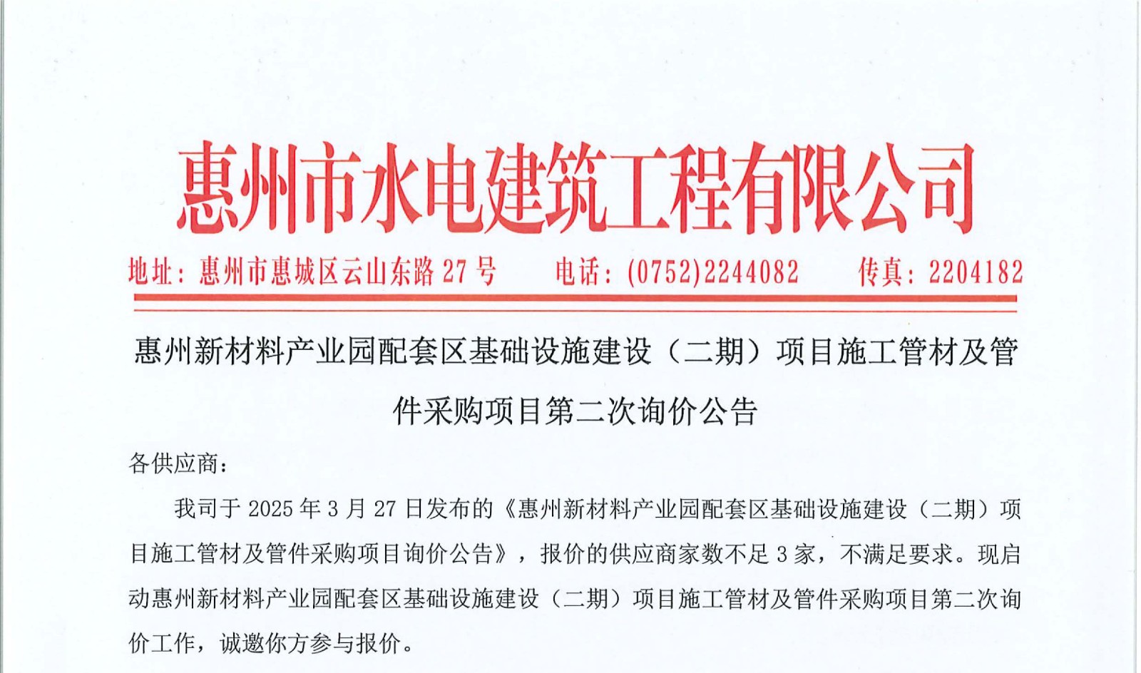 惠州新材料產(chǎn)業(yè)園配套區(qū)基礎(chǔ)設(shè)施建設(shè)(二期)項(xiàng)目施工管材及管件采購項(xiàng)目詢價(jià)公告......