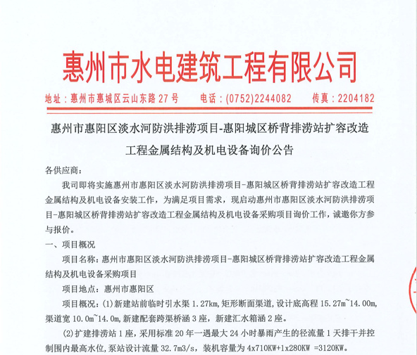 惠州市惠陽區(qū)淡水河防洪排澇項(xiàng)目-惠陽城區(qū)橋背排澇站擴(kuò)容改造工程金屬結(jié)構(gòu)及機(jī)電設(shè)備采購項(xiàng)目詢價(jià)公告......