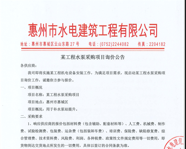 某工程水泵采購項(xiàng)目詢價(jià)公告......