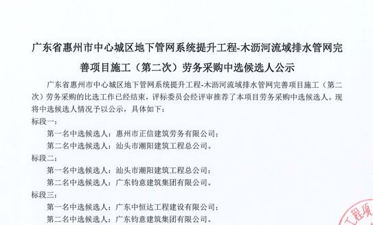 廣東省惠州市中心城區(qū)地下管網(wǎng)系統(tǒng)提升工程-木瀝河流域排水管網(wǎng)完善項(xiàng)目施工(第二次)勞務(wù)采購(gòu)中選候選人公示......