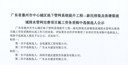 廣東省惠州市中心城區(qū)地下管網(wǎng)系統(tǒng)提升工程—新民排渠及洛塘渠流域排水管網(wǎng)完善項(xiàng)目施工勞務(wù)采購(gòu)中選候選人公示......